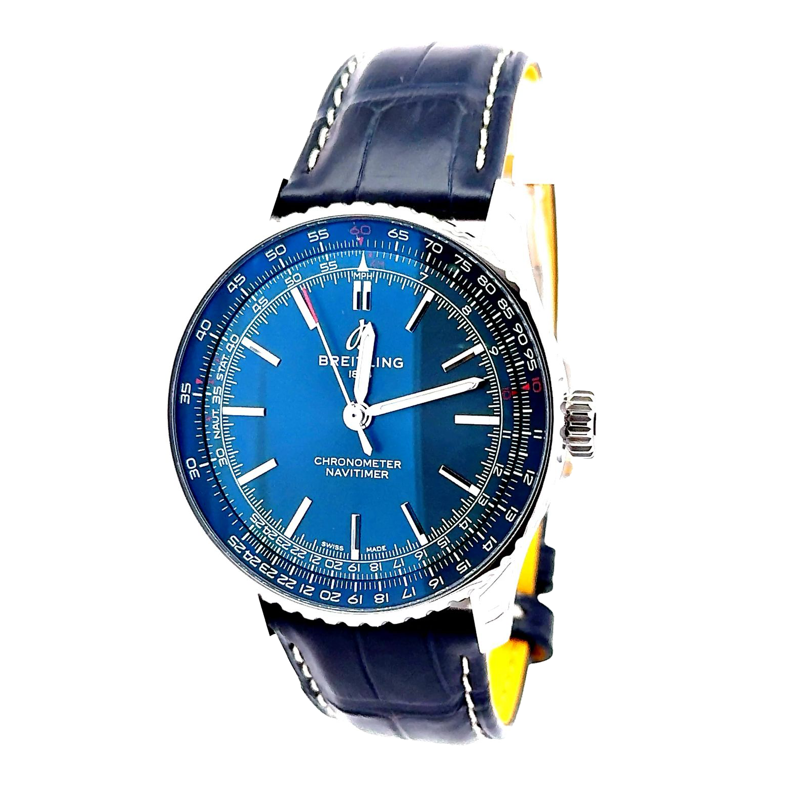 Breitling Navitimer Automatic 41 with reference number  A17329161C1P1 is a refined pilot-style timepiece that strikes a graceful balance between functionality and elegance. Boasting a 41 mm stainless‑steel case just 11.65 mm thick, it presents a sleek profile on the wrist. At its core lies the dependable Breitling Caliber 17, a COSC-certified automatic movement operating at 28,800 vph, offering approximately 38 hours of power reserve. The watch is distinguished by its navy-blue sunburst dial, featuring polished silver baton indices and luminous hands, which is framed by Breitling’s signature bi‑directional slide‑rule bezel, a nod to its aviation heritage. Protected by a cambered sapphire crystal with anti‑reflective coating on both sides, the watch is rated for 3 bar (30 m) water resistance, making it suitable for daily wear. The strap is crafted from navy alligator leather and secured with a polished folding clasp, adding a touch of luxury and wearability