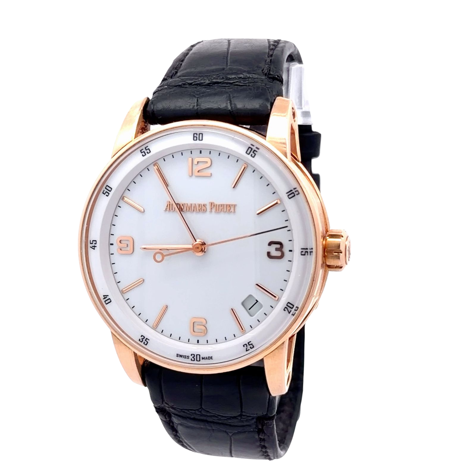 Audemars Piguet Code 11.59 Selfwinding reference 15210OR.OO.A099CR.01 is a sophisticated 41mm timepiece that blends modern design with classical luxury. It features a meticulously crafted 18-carat rose gold case that showcases the collection's unique architectural geometry, including an octagonal mid-case and hollowed-out lugs. The watch is defined by its clean, lacquered white dial adorned with applied 18-carat pink gold hour markers and hands, and it includes a discreet date display positioned between 4 and 5 o'clock. Protected by a double-curved, glare-proofed sapphire crystal, the watch is powered by the in-house Calibre 4302 automatic movement, which offers a robust 70-hour power reserve.