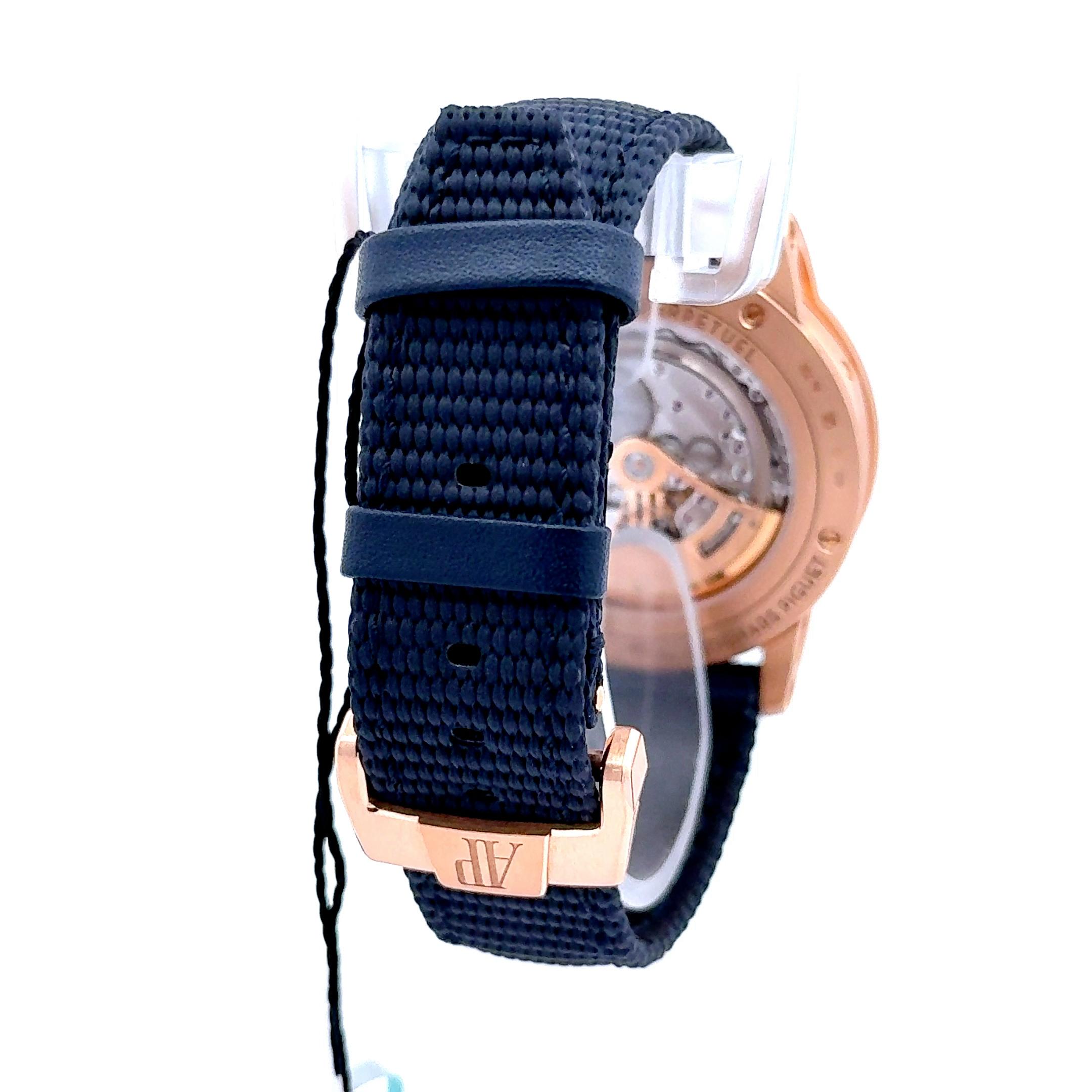 Audemars Piguet Code 11.59 by Perpetual Calendar with reference number 26394OR.OO.D027KB.01 in 18-carat pink gold 41 mm case, glare-proofed sapphire crystal and case-back. An astronomical watch par excellence, this Perpetual Calendar features a blue aventurine dial and sub-dials recalling a star-lit sky, and an 18-carat pink gold case, gold applied hour-markers and hands, lacquered blue inner bezel. Blue coated strap with 18-carat pink gold pin buckle. Functions perpetual calendar with week indication, day, date, astronomical moon, month, leap year, hours and minutes. Powered by calibre 5134 and water resistance up to 20 meters.