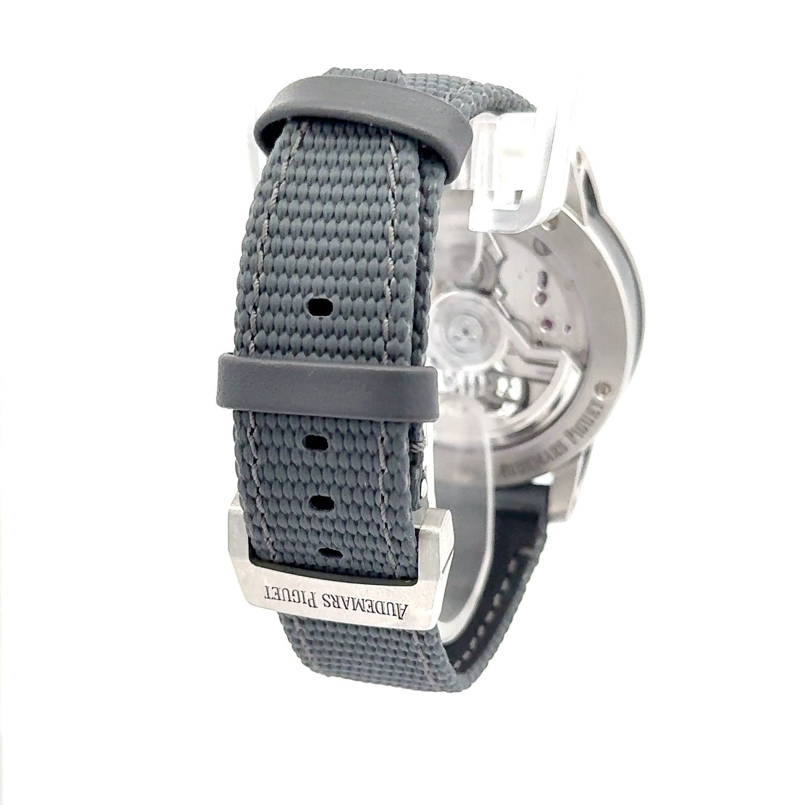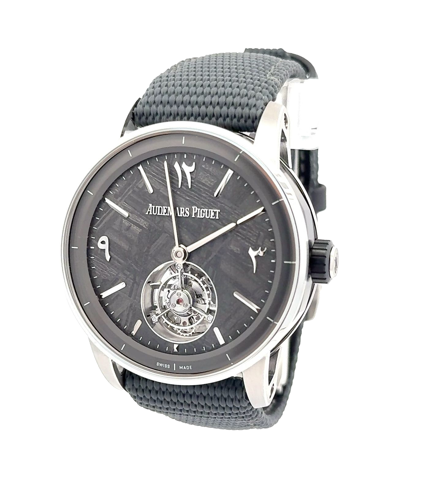 Audemars Piguet Code 11.59 Selfwinding Flying Tourbillon with reference number 26396QT.OO.D009KB.01 is a 41mm timepiece. A key feature is its meteorite dial, which offers a unique, textured surface, complemented by a gray inner bezel and rhodium-toned pink gold accents, including Eastern Arabic numerals and baton hour markers. A selfwinding movement that incorporates a captivating flying tourbillon at 6 o'clock, showcasing Audemars Piguet's expertise in mechanical artistry and finishing. This model is part of a series of special editions dedicated to the Middle East, with design input from regional collectors, making it a distinctive and sophisticated piece in haute horlogerie.