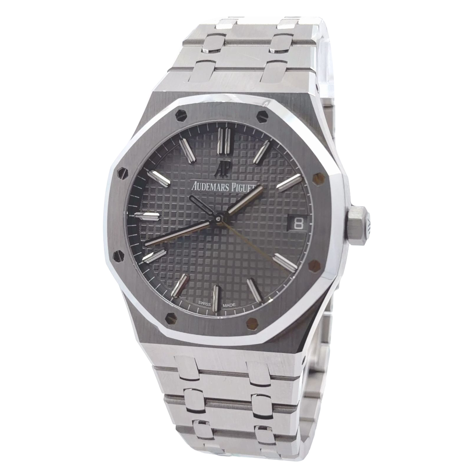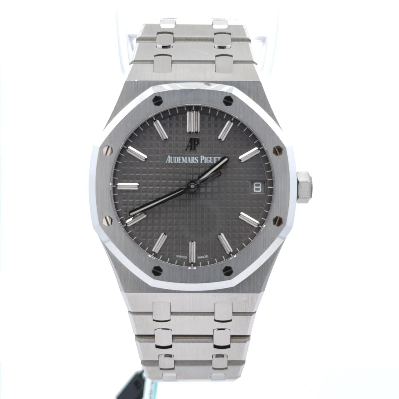 Audemars Piguet Royal Oak Selfwinding 15500ST.OO.1220ST.02 is a distinguished timepiece featuring a 41mm stainless steel case with the iconic octagonal bezel, known for its exposed screws and integrated bracelet. It boasts a striking slate grey dial with a "Grande Tapisserie" pattern, complemented by white gold applied hour-markers and Royal Oak hands, all enhanced with luminescent coating for optimal readability. This model is powered by the Audemars Piguet Calibre 4302 automatic movement and includes essential functions such as hours, minutes, seconds, and a date display at 3 o'clock. The watch is secured with a stainless steel bracelet featuring an AP folding clasp, embodying the signature Royal Oak aesthetic.