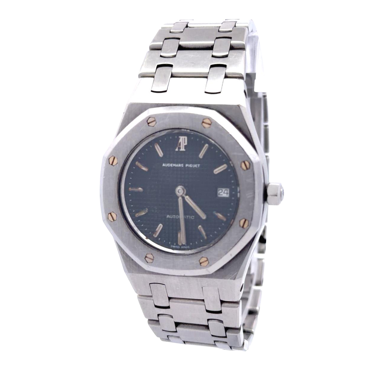 Audemars Piguet Royal Oak Automatic – Stainless Steel, Black Tapisserie Dial. This watch is a striking example of the Audemars Piguet Royal Oak Automatic, showcasing the design that made the Royal Oak one of the most iconic luxury sports watches in the world. The case and bracelet are crafted from stainless steel, giving the watch a solid, purposeful presence on the wrist. The watch features the characteristic octagonal bezel, secured by eight exposed screws, a hallmark of the Royal Oak’s bold industrial aesthetic. The bezel and bracelet display visible scratches and wear, giving the piece a lived-in, vintage character that highlights its age and authenticity rather than factory-new perfection.The dial is finished in the classic black “Grande Tapisserie” pattern, with its textured checkerboard motif that plays beautifully with the light. Slim, applied gold-tone hour markers and matching hands add a warm contrast against the dark dial, enhancing legibility and elegance. A date aperture at 3 o’clock completes the functional design, while the “AUDEMARS PIGUET” signature sits prominently beneath the logo at 12 o’clock. The word “AUTOMATIC” is positioned above 6 o’clock, indicating the self-winding mechanical movement within. The integrated stainless-steel bracelet flows seamlessly from the case, featuring the Royal Oak’s distinctive linked construction that combines angular geometry with ergonomic comfort on the wrist.