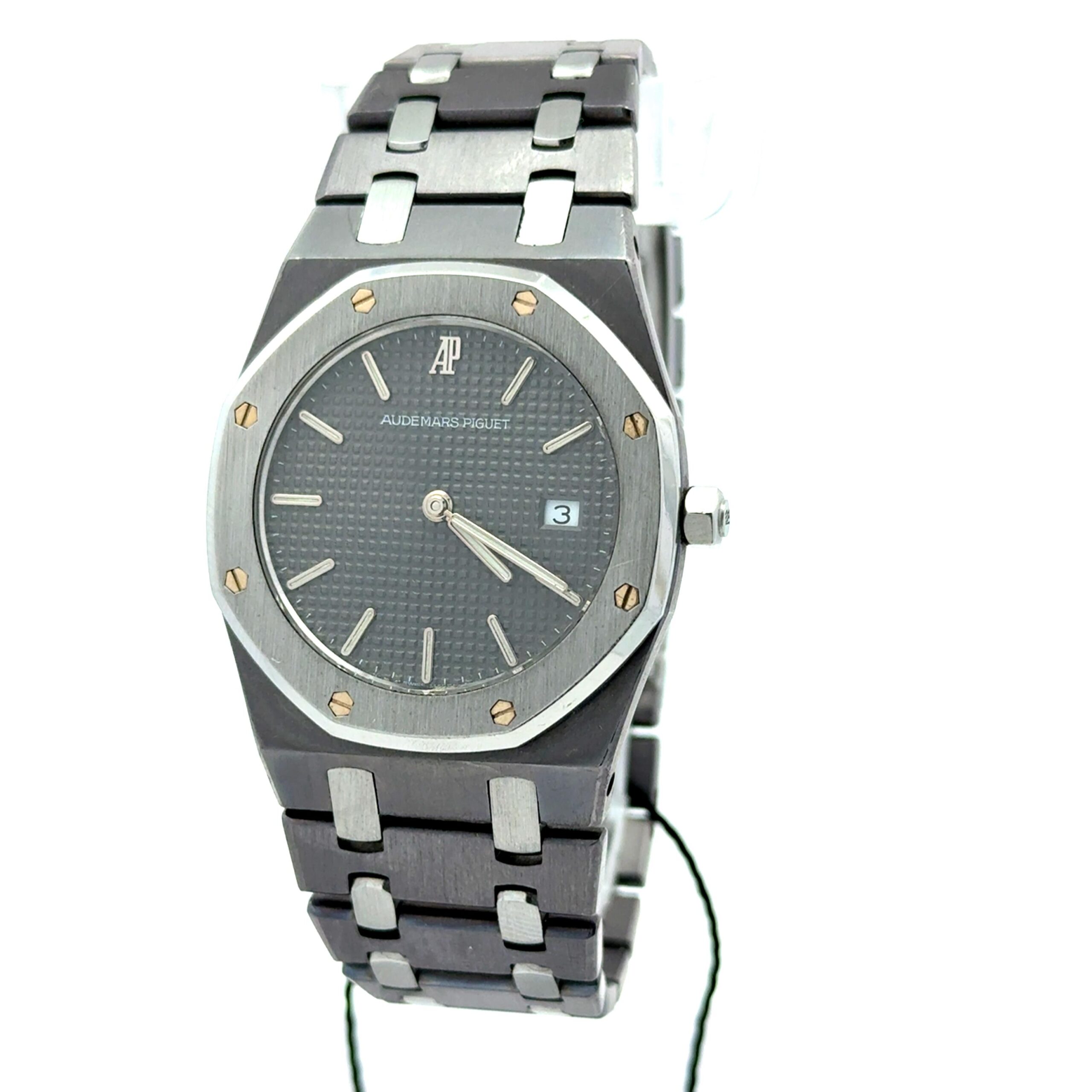 Audemars Piguet Royal Oak 56175TT features a 33mm case crafted from stainless steel.This lustrous gray metal is renowned for its exceptional hardness, weight, and corrosion resistance, giving the watch both durability and a distinctive aesthetic. The brushed bezel is punctuated with eight signature screws, a hallmark of the Royal Oak design. Protecting the dial is a scratch-resistant sapphire crystal, ensuring long-lasting clarity and resilience. The watch’s grey Petite Tapisserie dial is complemented by raised baton hour markers and a date window at the 3 o’clock position, creating a refined and highly legible display. Silver-tone stick hands sweep across the dial, powered by the ultra-thin Audemars Piguet Caliber 2612 quartz movement, which contributes to the watch’s remarkably slim profile. The 56175TT displays hours, minutes, and date, offering essential functionality with precision and understated elegance.