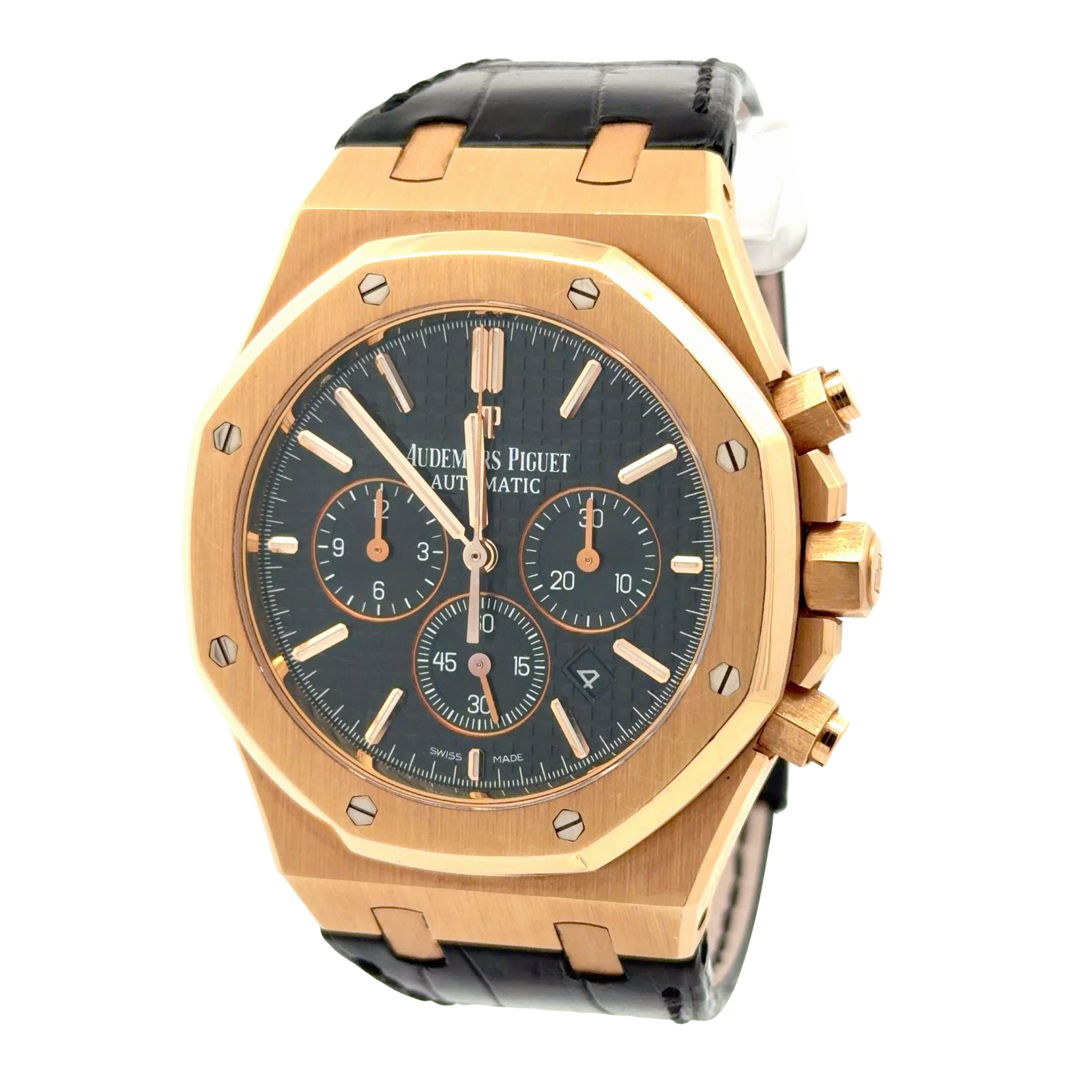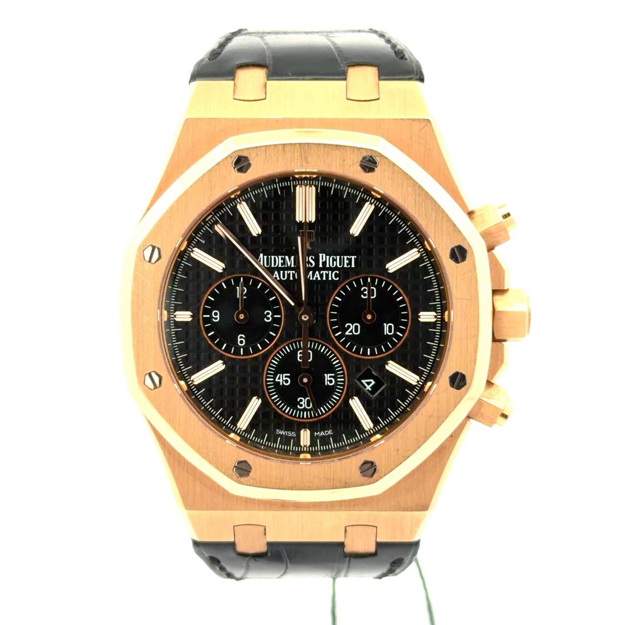 Audemars Piguet Royal Oak Chronograph 26320OR.OO.D002CR.01 is a powerful expression of contemporary haute horlogerie, pairing the unmistakable Royal Oak design with robust chronograph functionality. Crafted in 18k pink gold, the iconic octagonal bezel and brushed case create a striking contrast against the deep black “Grande Tapisserie” dial. The black dial enhances legibility while highlighting the chronograph subdials, applied hour markers, and signature Royal Oak hands. Powered by an in-house automatic chronograph movement, this timepiece delivers precision, reliability, and refined performance—hallmarks of Audemars Piguet craftsmanship. Elegant yet commanding, this Royal Oak Chronograph is highly sought after by collectors who appreciate bold design, mechanical excellence, and enduring prestige.
