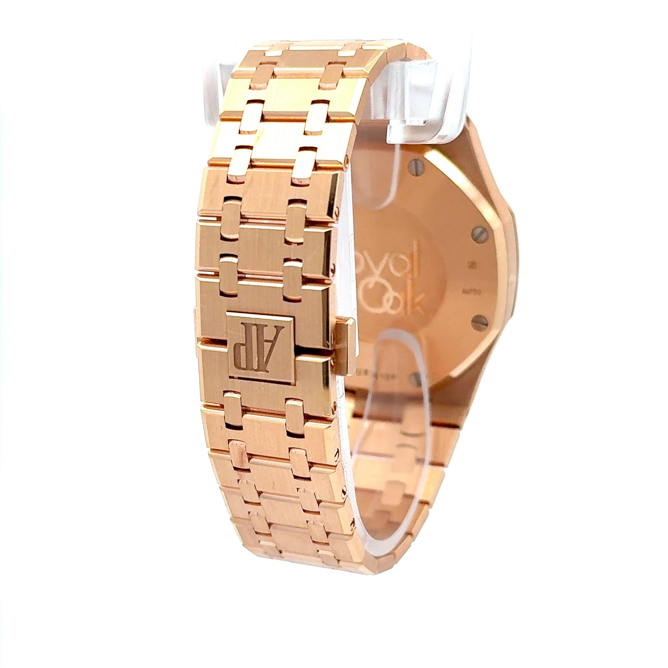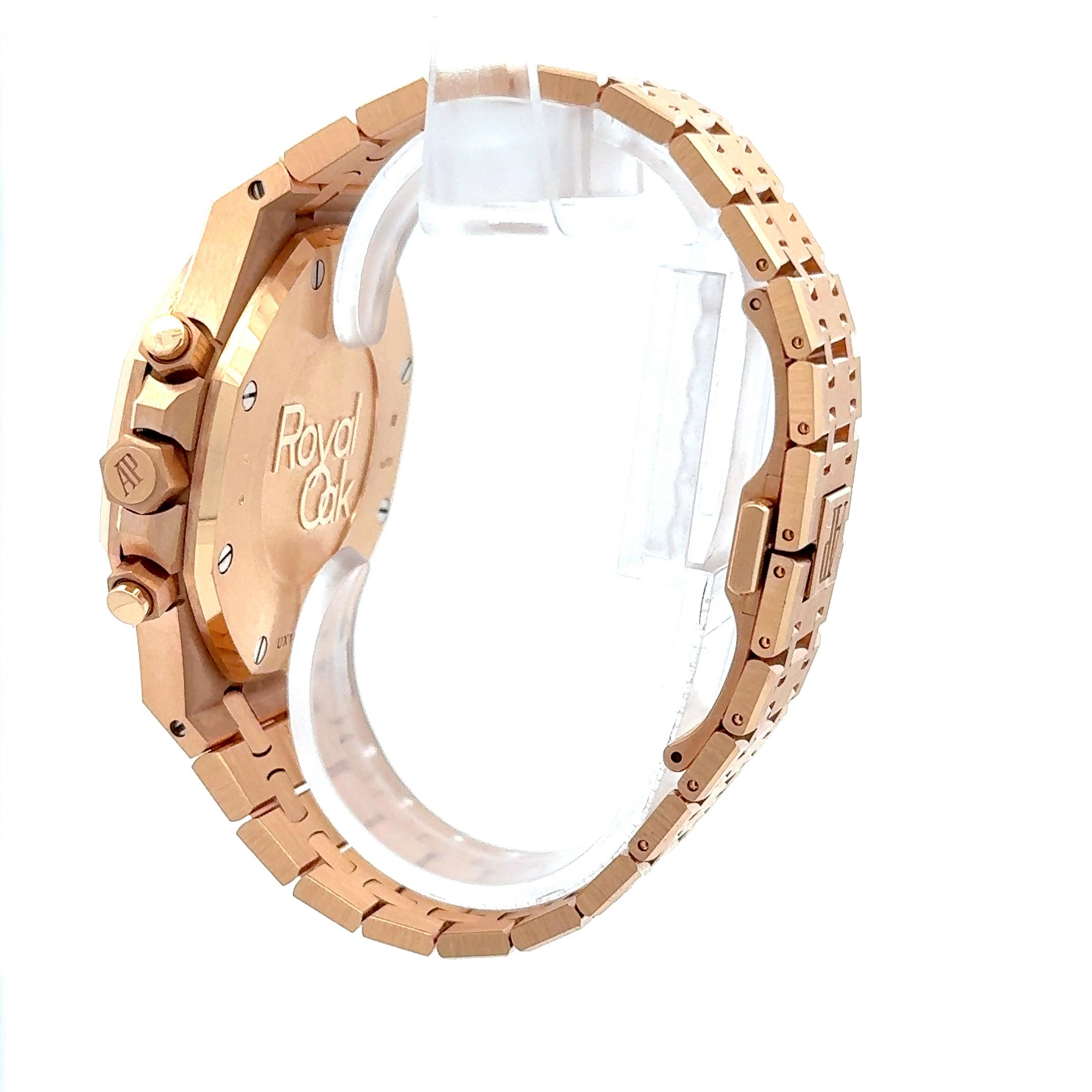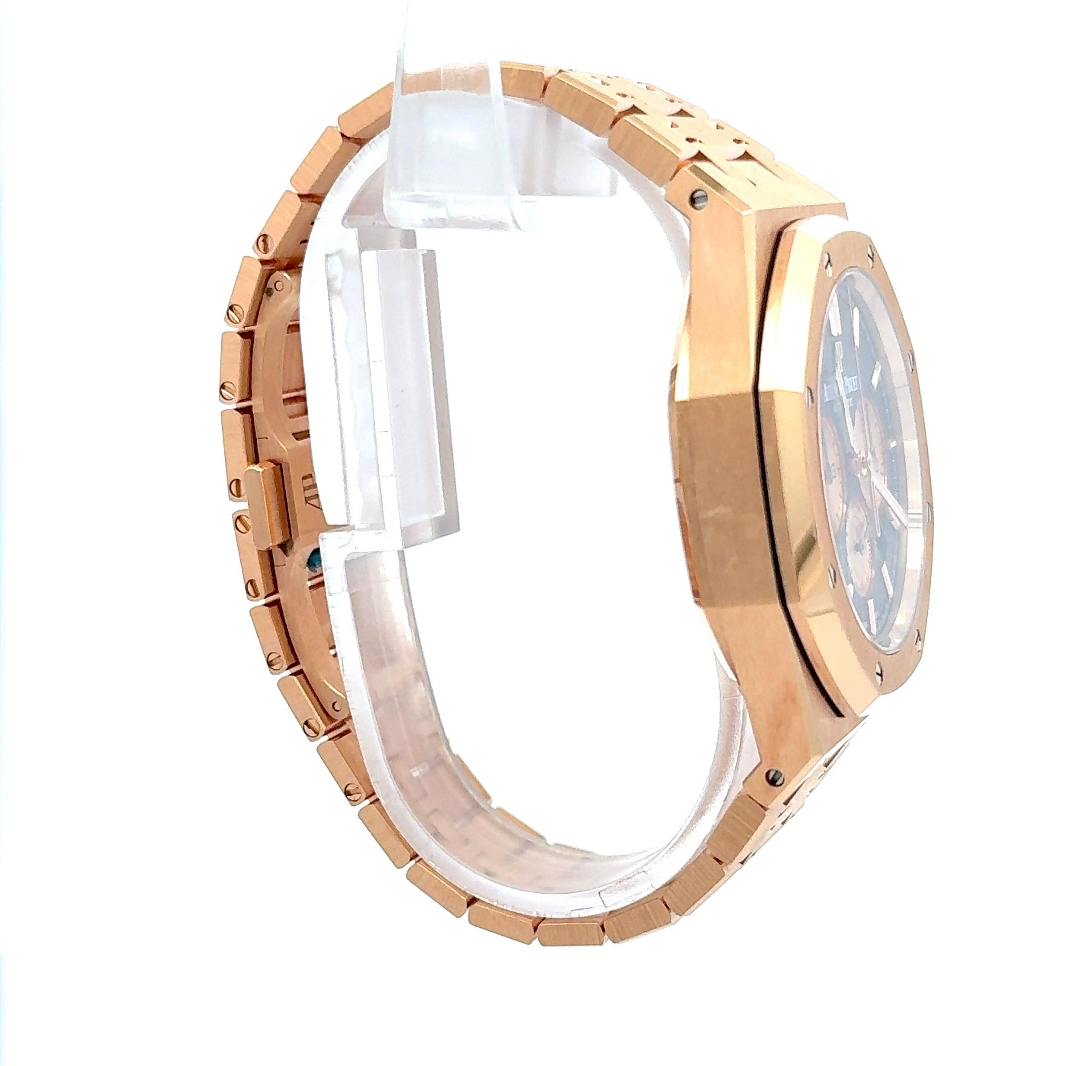 Audemars Piguet 26631OR.OO.1220OR.01 is part of the Royal Oak Selfwinding Chronograph collection, presented in a stunning 41mm rose gold case and bracelet, combining sporty appeal with classic haute horlogerie elegance. This model features a blue “Grande Tapisserie” dial, contrasted beautifully by its rose gold-toned counters and luminous rose gold applied hour-markers and hands. The chronograph subdials are positioned at 3, 6, and 9 o'clock, providing a balanced layout for elapsed time measurement, small seconds, and 12-hour tracking. A date window is subtly integrated between 4 and 5 o'clock.