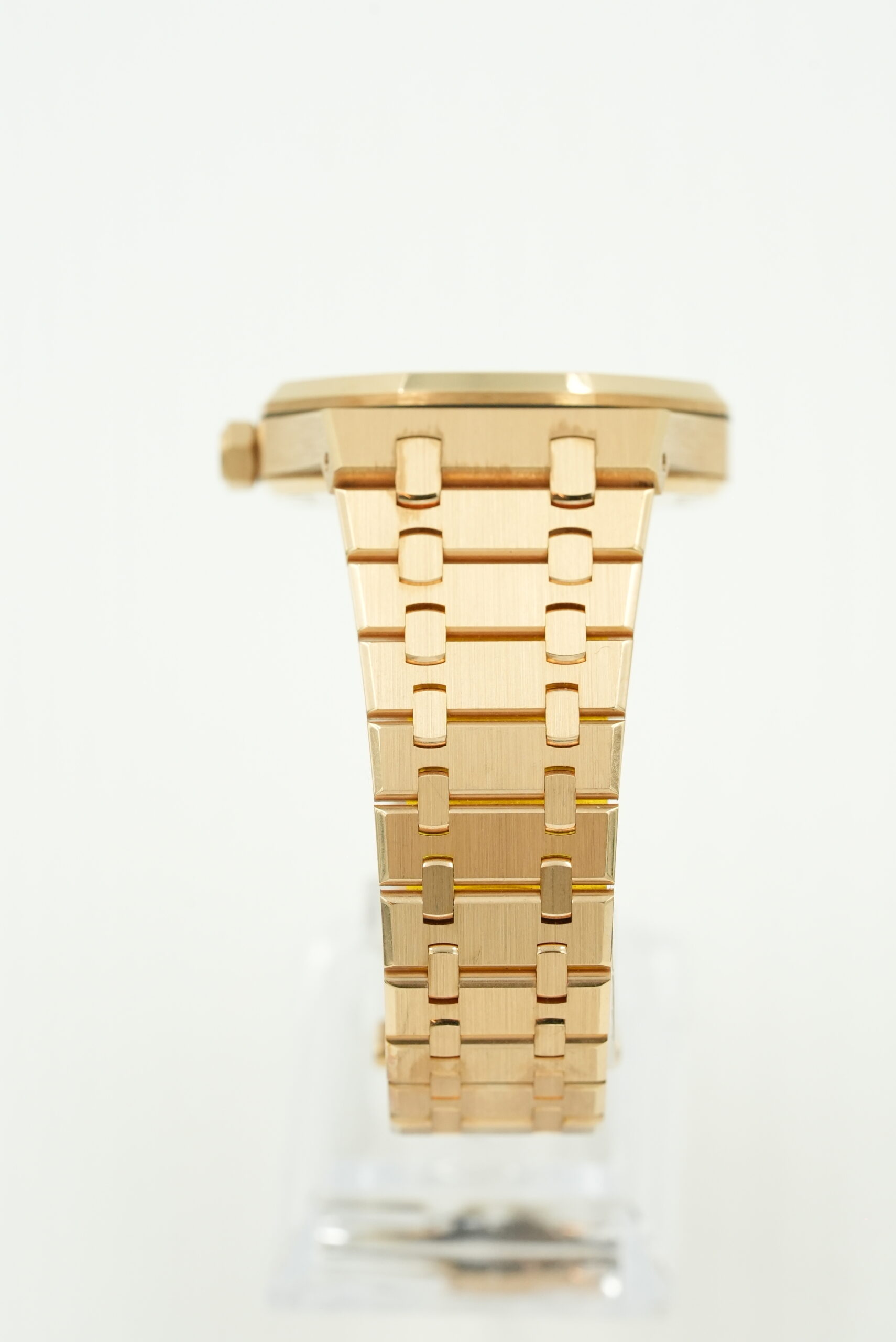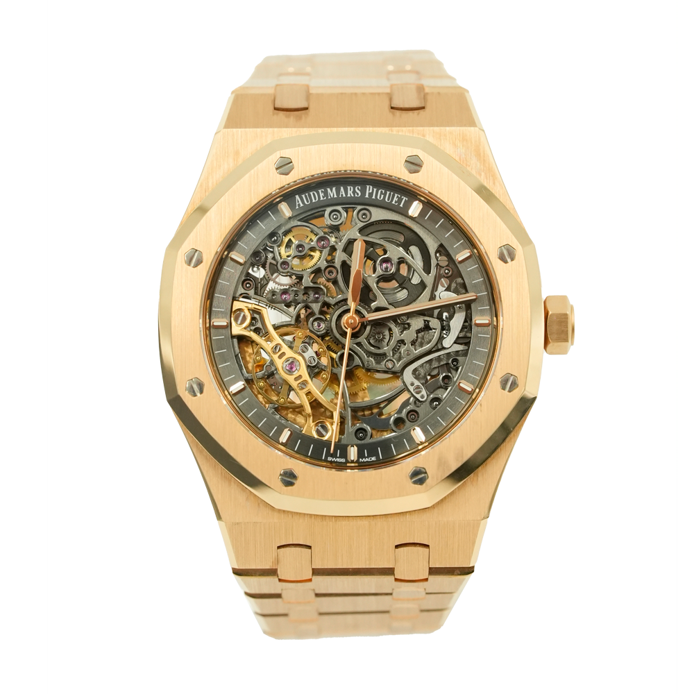 Audemars Piguet Royal Oak Double Balance Wheel Openworked, reference number 15407OR.OO.1220OR.01, is a masterpiece of haute horology, boasting a mesmerizing skeletonized dial that reveals the intricate workings of its automatic 3132 movement, complete with a 45-hour power reserve and 38 jewels for superior precision. Encased in exquisite rose gold with a matching bezel and secured by a luxurious gold bracelet with a fold clasp, this 41mm timepiece is a harmonious blend of innovation and elegance, further enhanced by its sapphire crystal protection and 5 ATM water resistance, making it a true statement of craftsmanship and sophistication.