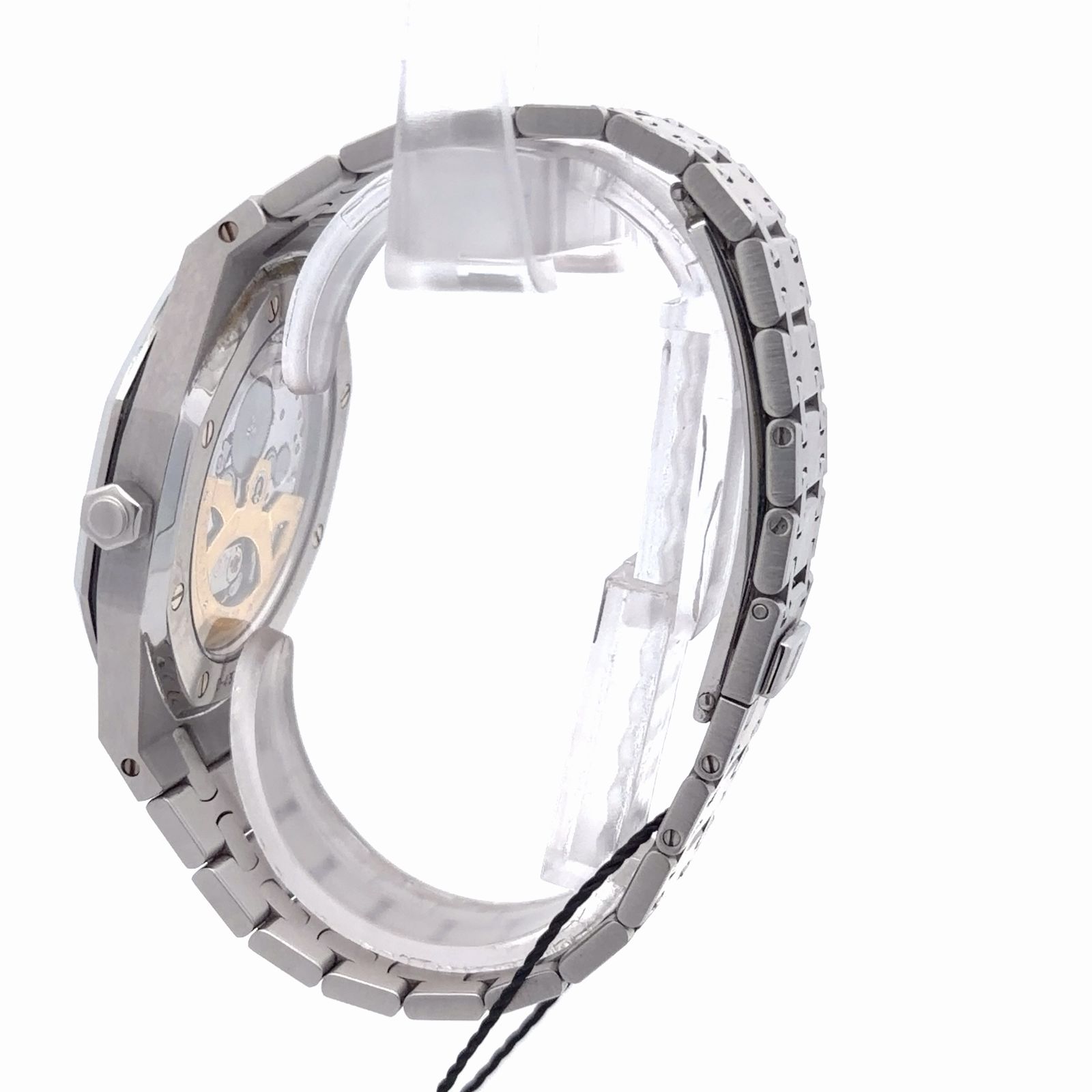 Audemars Piguet Royal Oak "Jubilee" ref. 14802ST housed in a classic 39mm stainless steel case. The watch is defined by its iconic octagonal bezel with hexagonal screws and an integrated tapering bracelet. A major innovation for this reference was the introduction of a sapphire crystal display back, which was a first for the Jumbo series, revealing the ultra-thin automatic Calibre 2121. To mark the anniversary, the movement features a special 21k gold skeletonized rotor decorated with an octagonal bezel motif. The dial showcases a "Petite Tapisserie" pattern, in slate grey.