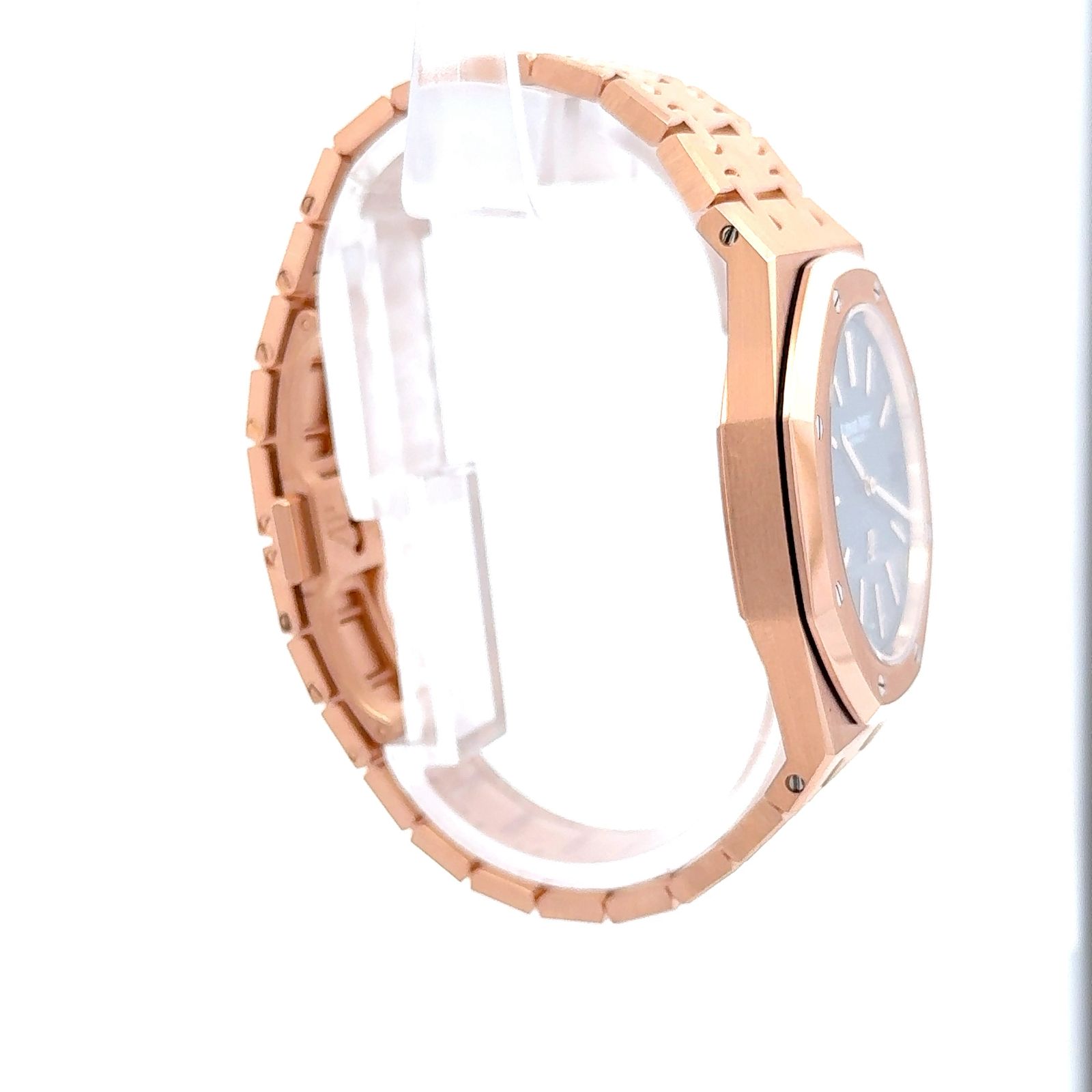 Audemars Piguet Royal Oak Jumbo Extra-Thin Ref. 15202OR.OO.1240OR.01 is a masterful expression of luxury, heritage, and timeless design, featuring a full 18K rose gold case and integrated bracelet that radiate elegance and sophistication. Measuring a sleek 39 mm in diameter and just 8.1 mm in thickness, At its heart beats the renowned Caliber 2121—an ultra-thin, self-winding movement known for its reliability and refinement. Comprising 36 jewels and offering a 40-hour power reserve, the movement is housed beneath a sapphire crystal caseback, showcasing Audemars Piguet’s exceptional finishing. The blue dial, adorned with the signature “Petite Tapisserie” pattern, exudes quiet sophistication. Free of numerals, it maintains a clean, minimalist aesthetic while offering a date display at the 3 o’clock position. The dial’s refined layout is protected by a scratch-resistant sapphire crystal and framed by the instantly recognizable octagonal bezel, also in rose gold, secured with exposed screws. Completing the look is a matching rose gold bracelet with a folding clasp, seamlessly blending into the case for a unified and comfortable fit. Water-resistant to 5 ATM, the Royal Oak Jumbo is as versatile as it is elegant—equally suited for formal attire or upscale casual wear.