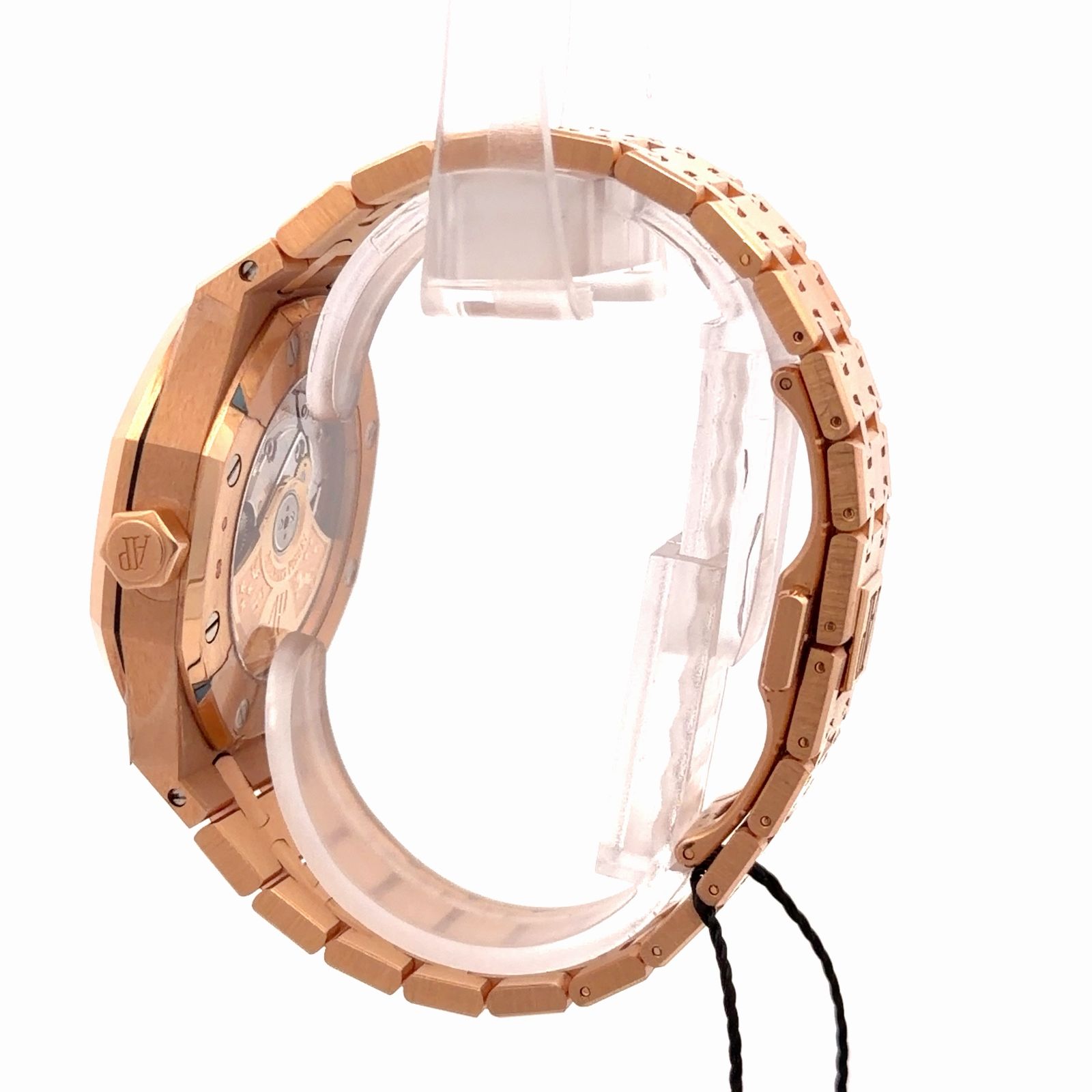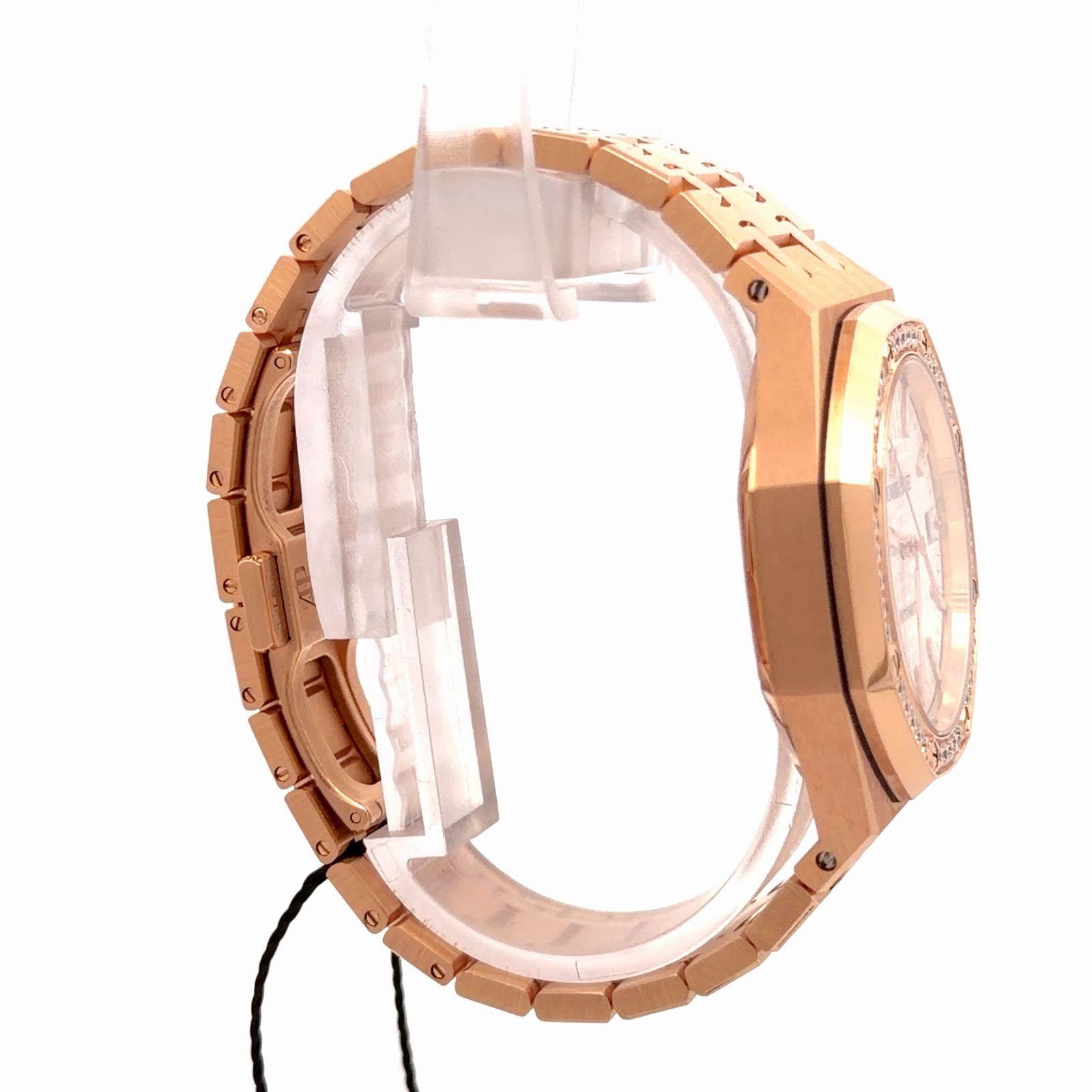 Audemars Piguet Royal Oak 15451OR.ZZ.1256OR.01 is a 37 mm 18k pink gold timepiece distinguished by its iconic octagonal bezel set with brilliant-cut diamonds. It features the signature “Grande Tapisserie” dial, offering depth and texture, while applied gold hour markers and luminescent hands ensure excellent readability. The integrated pink gold bracelet provides a seamless, elegant fit, enhancing both comfort and the Royal Oak’s unmistakable silhouette. Powered by a self-winding mechanical movement and finished to the high standards of haute horlogerie, this model perfectly balances sporty character with refined luxury.