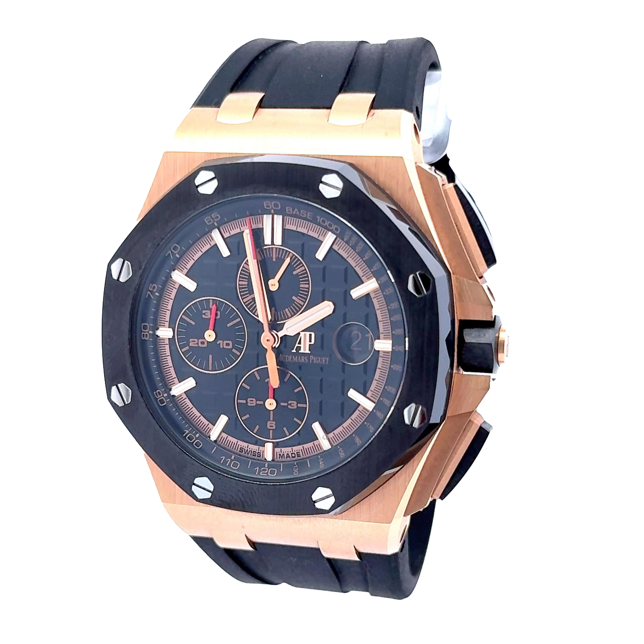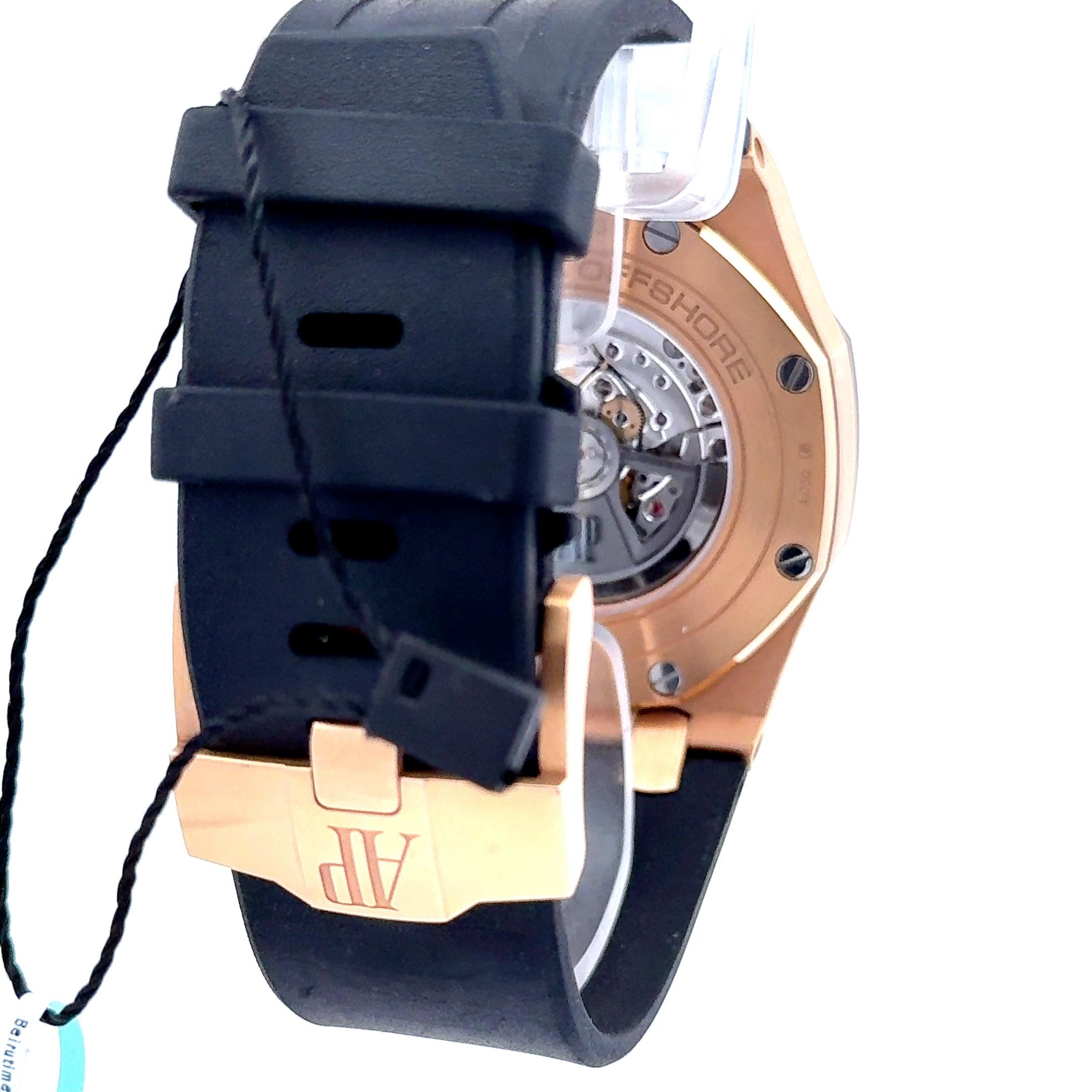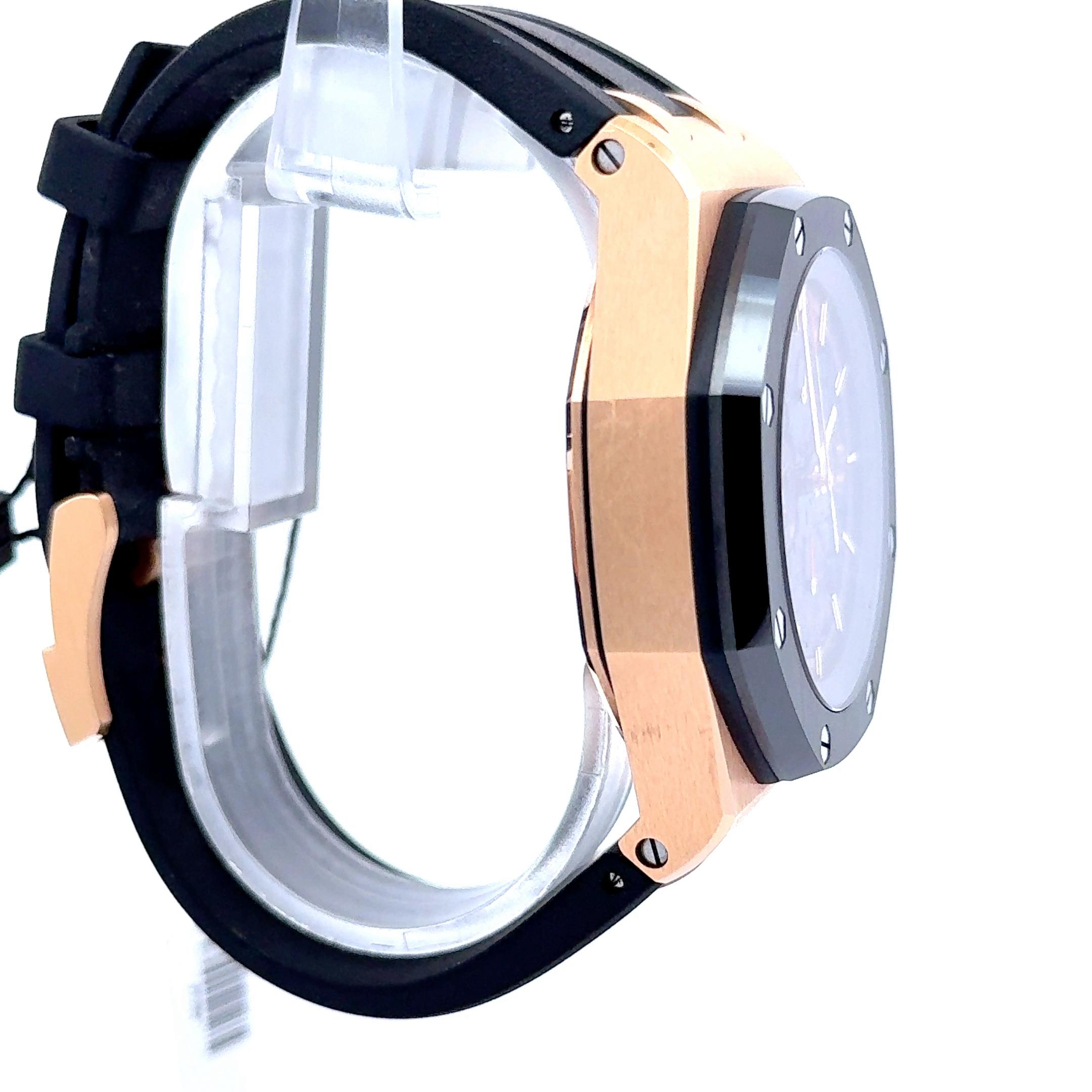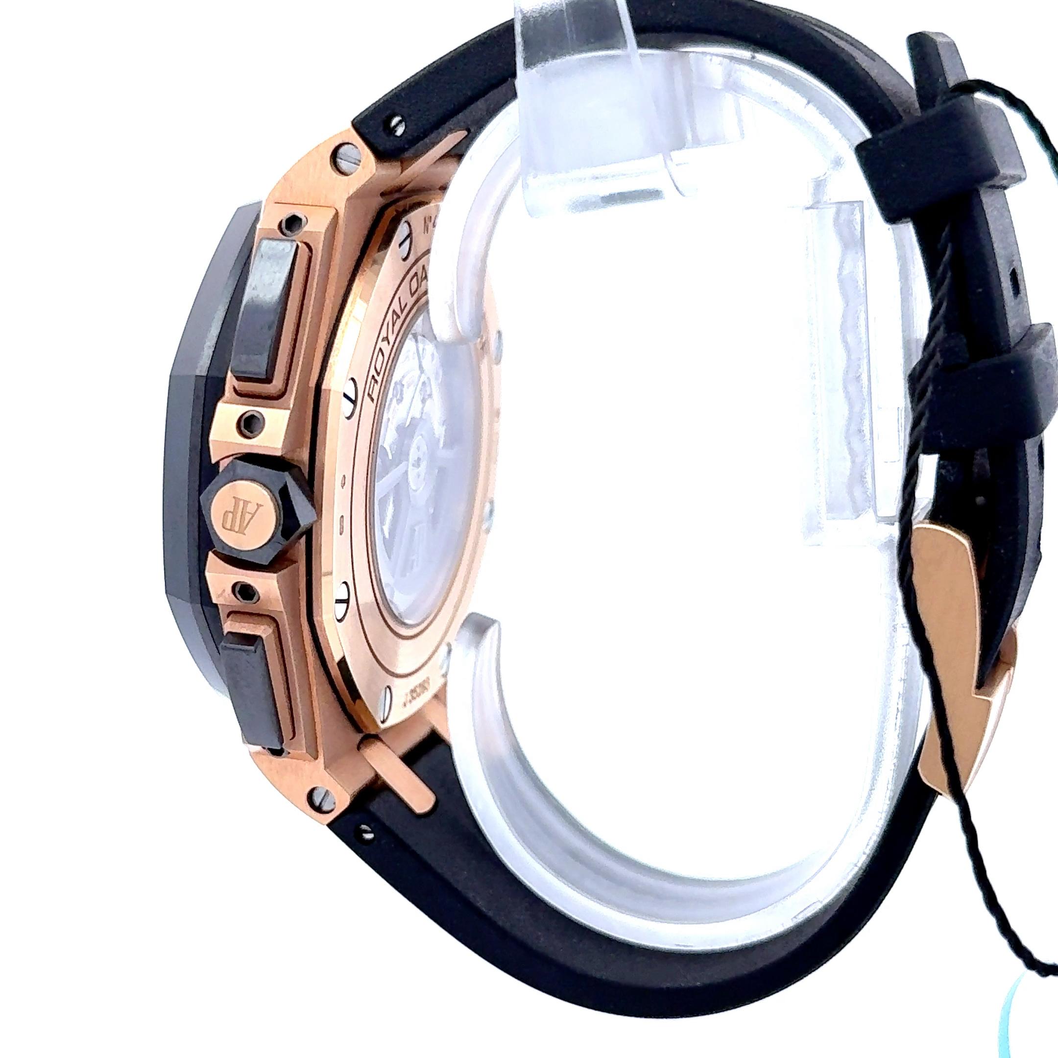 Powered by the Audemars Piguet Caliber 3126/3840 automatic movement, this model offers a reliable 50-hour power reserve and includes a chronograph, date display, and small seconds sub-dial. The timepiece is complemented by a durable black rubber strap with a rose gold deployment clasp, providing both comfort and a sporty, modern look.
