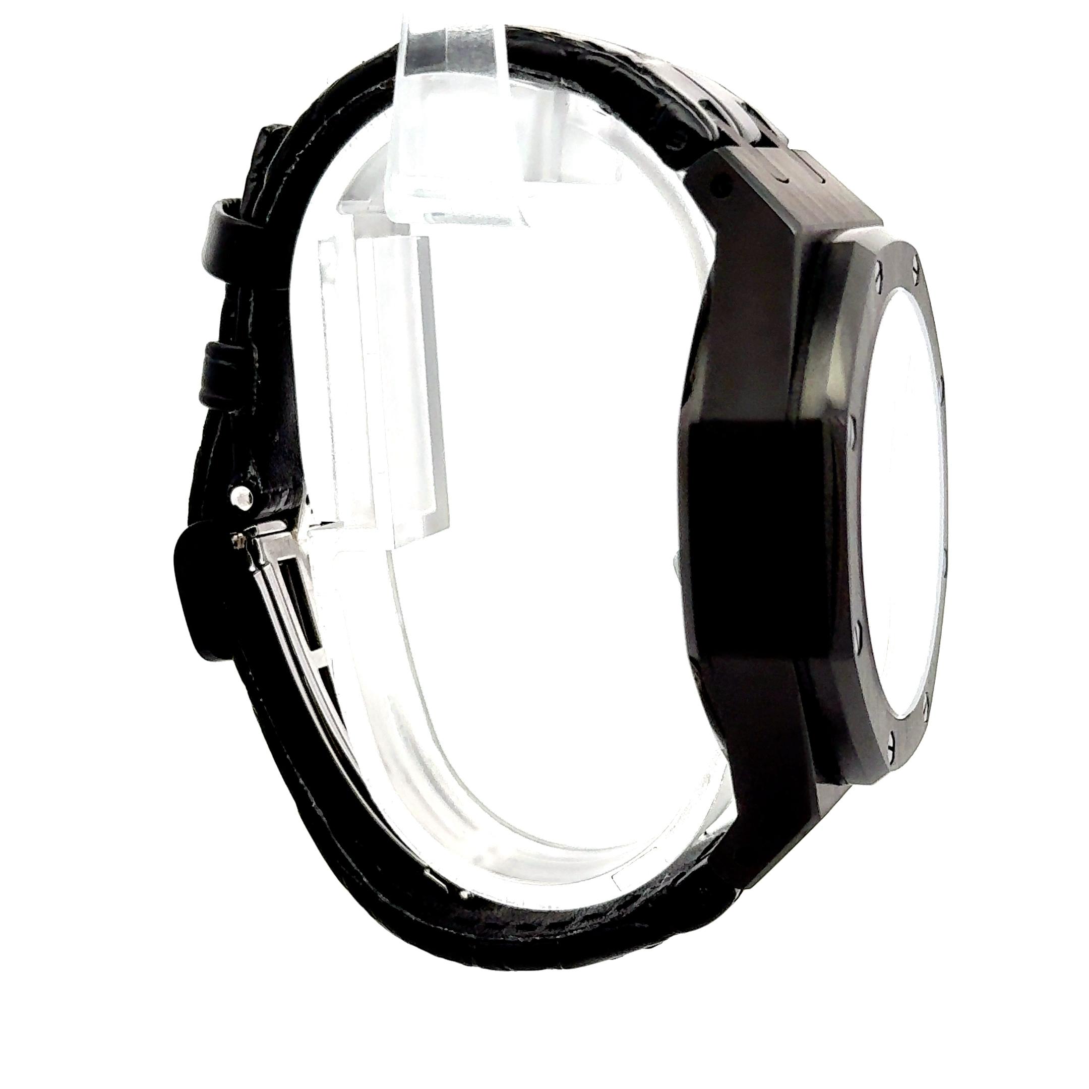 Audemars Piguet Royal Oak Offshore Tourbillon Chronograph “Las Vegas Strip”, reference 26268SN.OO.D003CU.01, is a spectacular and ultra-rare timepiece. Crafted from forged carbon, the 44mm case is complemented by a black DLC-coated stainless steel bezel, black ceramic and titanium pushers, creating a bold, high-contrast aesthetic that reflects the dazzling energy of the Las Vegas Strip. The dial features Audemars Piguet’s signature black “Méga Tapisserie” pattern, highlighted by vibrant red Arabic numerals and red accents throughout including the chronograph hands and stitching on the black leather strap evoking a sense of drama and excitement. At 6 o'clock, a beautifully exposed tourbillon underscores the brand's technical mastery, while the hand-wound chronograph movement offers both precision and high horology prestige. Equipped with sapphire crystals front and back, water resistance to 50 meters.