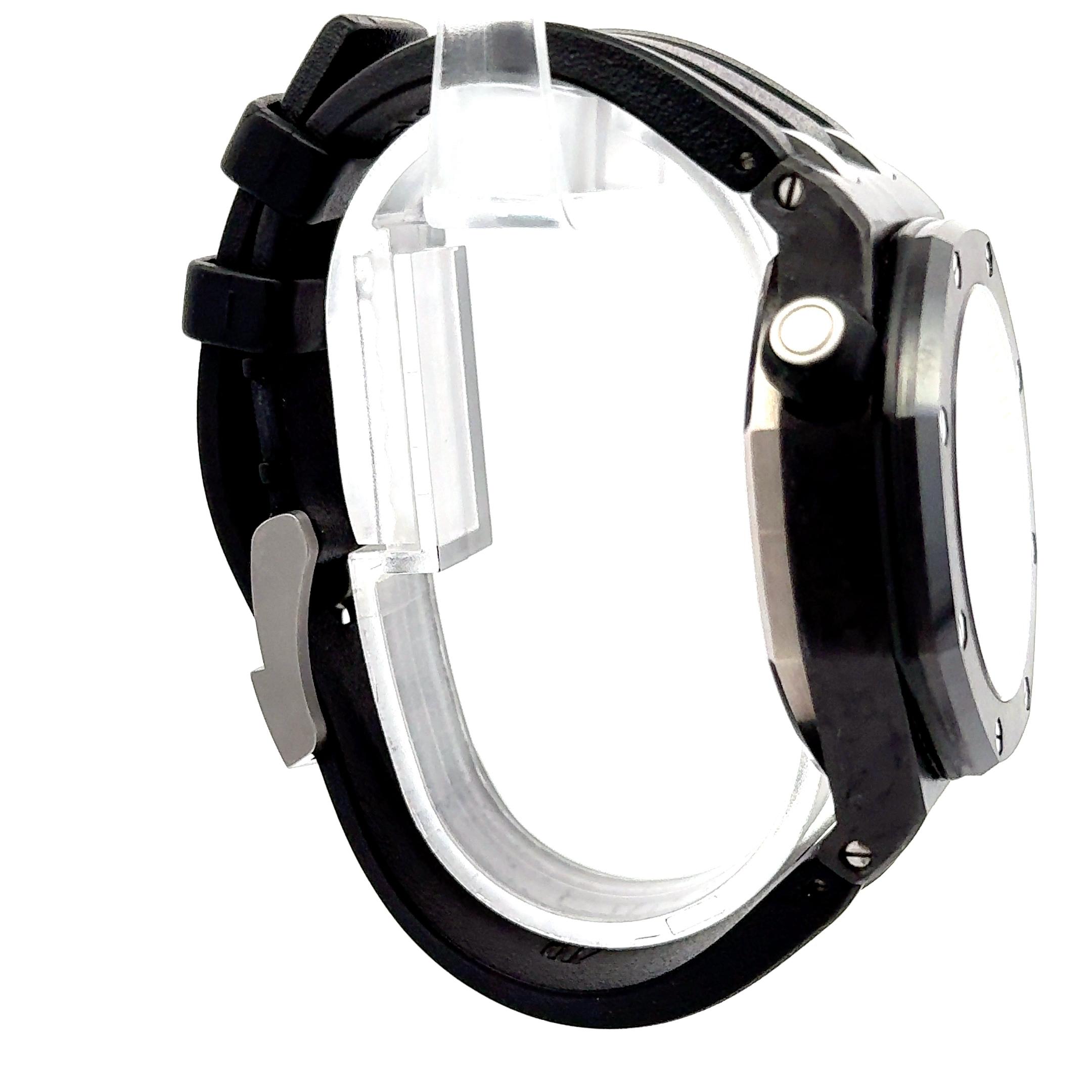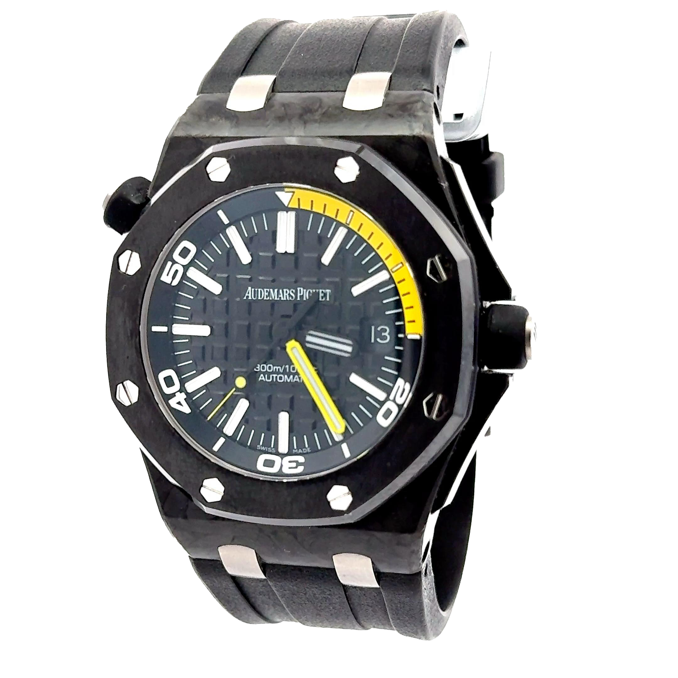 Audemars Piguet Royal Oak Offshore Diver Ref. 15706AU.OO.A002CA.01 is a bold interpretation of the iconic Offshore aesthetic, engineered for performance and designed to make a statement. It features a robust 42mm forged carbon case that combines lightweight strength with a marbled texture unique to each piece, complemented by a titanium caseback for durability. The unidirectional black ceramic bezel frames a black dial adorned with AP’s signature “Méga Tapisserie” pattern, highlighted by vibrant yellow accents for enhanced underwater visibility. A date aperture sits at 3 o’clock, while the inner rotating dive bezel is controlled via a crown at 10 o’clock, offering precision dive-time tracking. Powered by the self-winding Caliber 3120, the watch delivers 60 hours of power reserve.