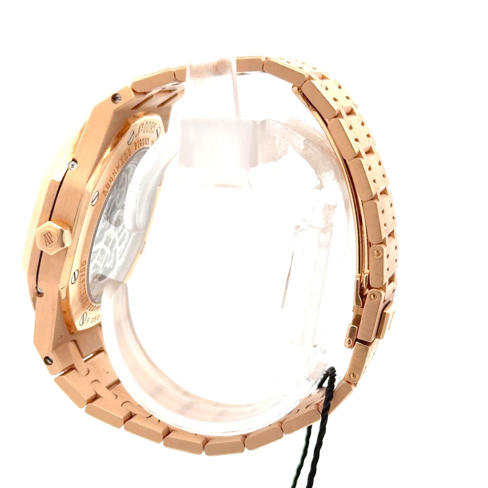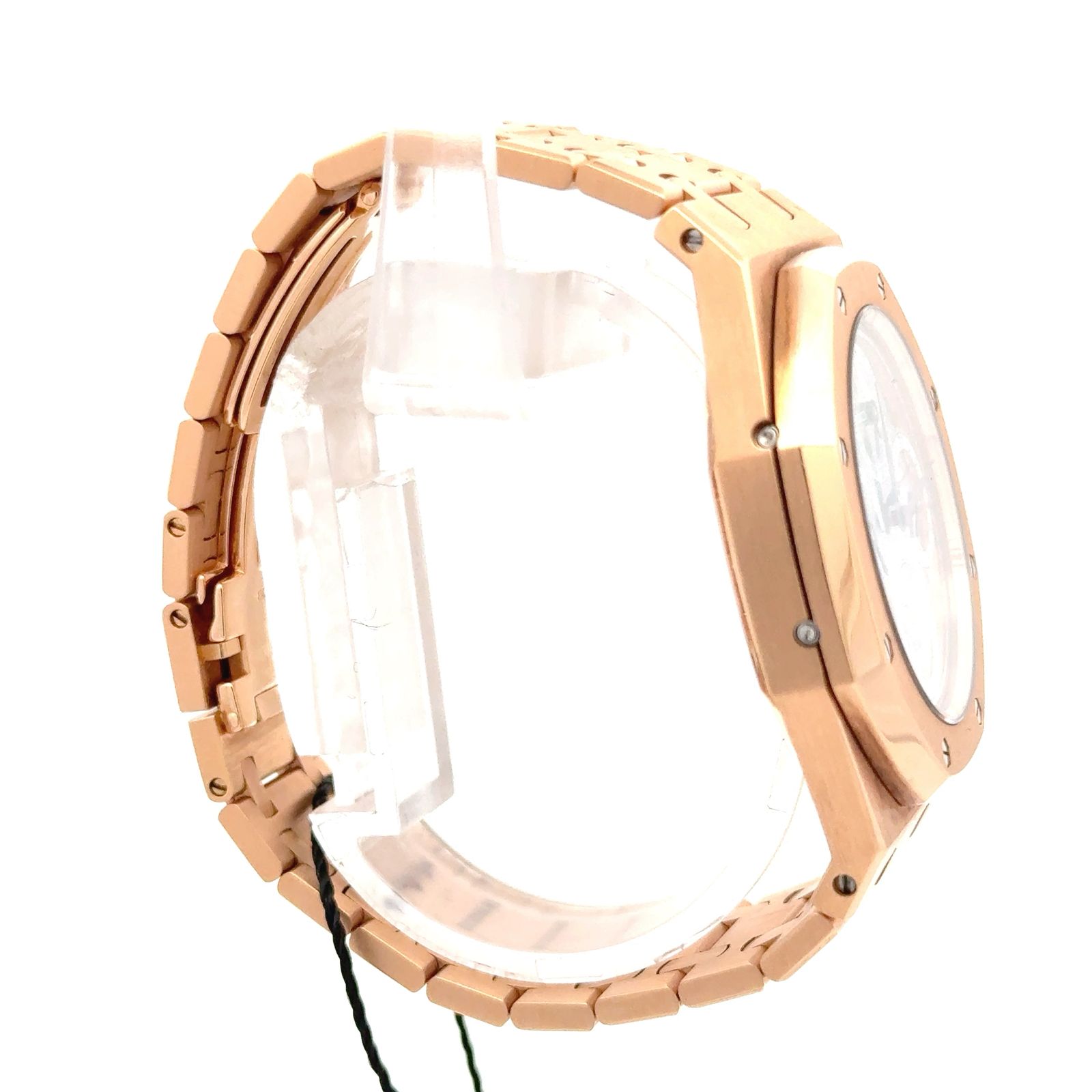 Audemars Piguet Royal Oak Perpetual Calendar 25829OR.OO.0944OR.01 is a masterful fusion of haute horlogerie and sculptural elegance, crafted entirely in 18k pink gold with a skeletonized dial that reveals its mechanical soul. This reference from Audemars Piguet’s iconic Royal Oak collection showcases the brand’s technical prowess and aesthetic refinement. Measuring 39 mm in diameter and just 9.3 mm thick, the case and integrated bracelet are forged from 18k pink gold, offering a warm, luxurious tone that complements the intricate openworked dial. Beneath the sapphire crystal lies the caliber 2120/2802, an ultra-thin automatic movement featuring a perpetual calendar with day, date, month, leap year indication, and moon phase. The skeletonized architecture allows a full view of the movement’s finely finished components, including feuille-style hands and the absence of traditional hour markers, which enhances the visual depth and complexity. The transparent caseback further reveals the movement’s artistry, including 38 jewels and a power reserve of approximately 40 hours. Water-resistant to 20 meters, this timepiece balances delicate craftsmanship with everyday resilience.