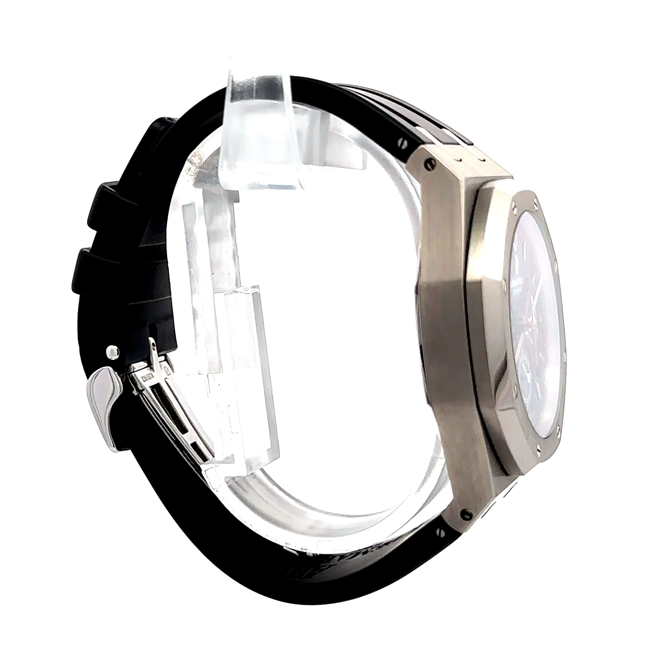 Audemars Piguet Royal Oak Offshore Chronograph reference 26138TI.OO.D002CR.01 is a striking and sporty timepiece crafted in lightweight yet durable titanium. Measuring 39mm in diameter, it features the iconic octagonal bezel secured by exposed hexagonal screws, a hallmark of the Royal Oak design. The bold black dial showcases the signature "Méga Tapisserie" pattern, complemented by contrasting sub-dials and vibrant red accents for the chronograph functions. A red central seconds hand adds a dynamic touch, while a discreet date window is positioned between 4 and 5 o'clock. Powered by a self-winding automatic movement, caliber 2385, it ensures reliable chronograph performance and precision. The watch is fitted with a robust black rubber strap, emphasizing its sporty character, and offers water resistance up to 100 meters.