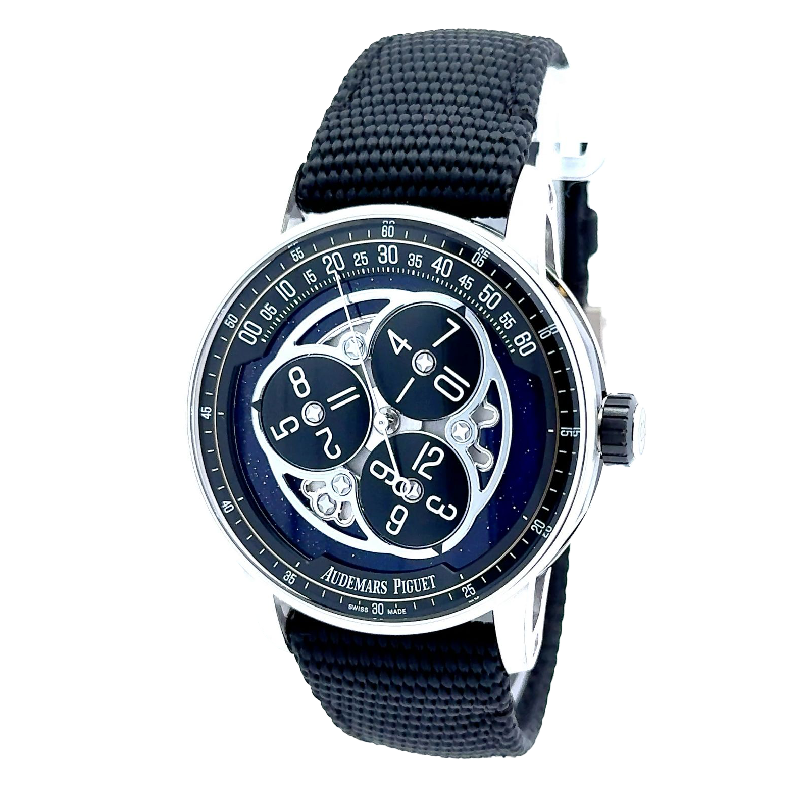 Audemars Piguet Code 11.59 Starwheel Ref. 15212NB.OO.A002KB.01 is a bold and innovative timepiece that reintroduces one of the brand’s most poetic complications , the wandering hours, within the contemporary Code 11.59 collection. Housed in a 41mm case crafted from 18k white gold and black ceramic, this watch exudes a refined yet modern character. The polished white gold bezel, lugs, and caseback contrast elegantly with the black ceramic middle case, highlighting the architectural complexity of the Code 11.59 case structure. Its dial is a mesmerizing blue aventurine glass disc, speckled like a starlit night sky, serving as a fitting backdrop for the watch’s signature feature, three rotating sapphire discs that display the hour numerals. These discs revolve around a central axis, with one hour numeral at a time sweeping along the 60-minute arc at the top of the dial to indicate the current time. This wandering hours mechanism is driven by a specially modified automatic Caliber 4310. The movement offers a power reserve of approximately 70 hours and is beautifully finished, visible through a sapphire crystal caseback. The watch is paired with a textured black rubber-coated strap and a white gold pin buckle