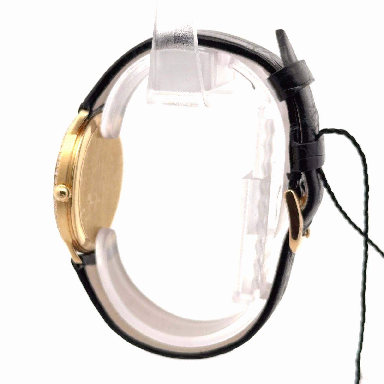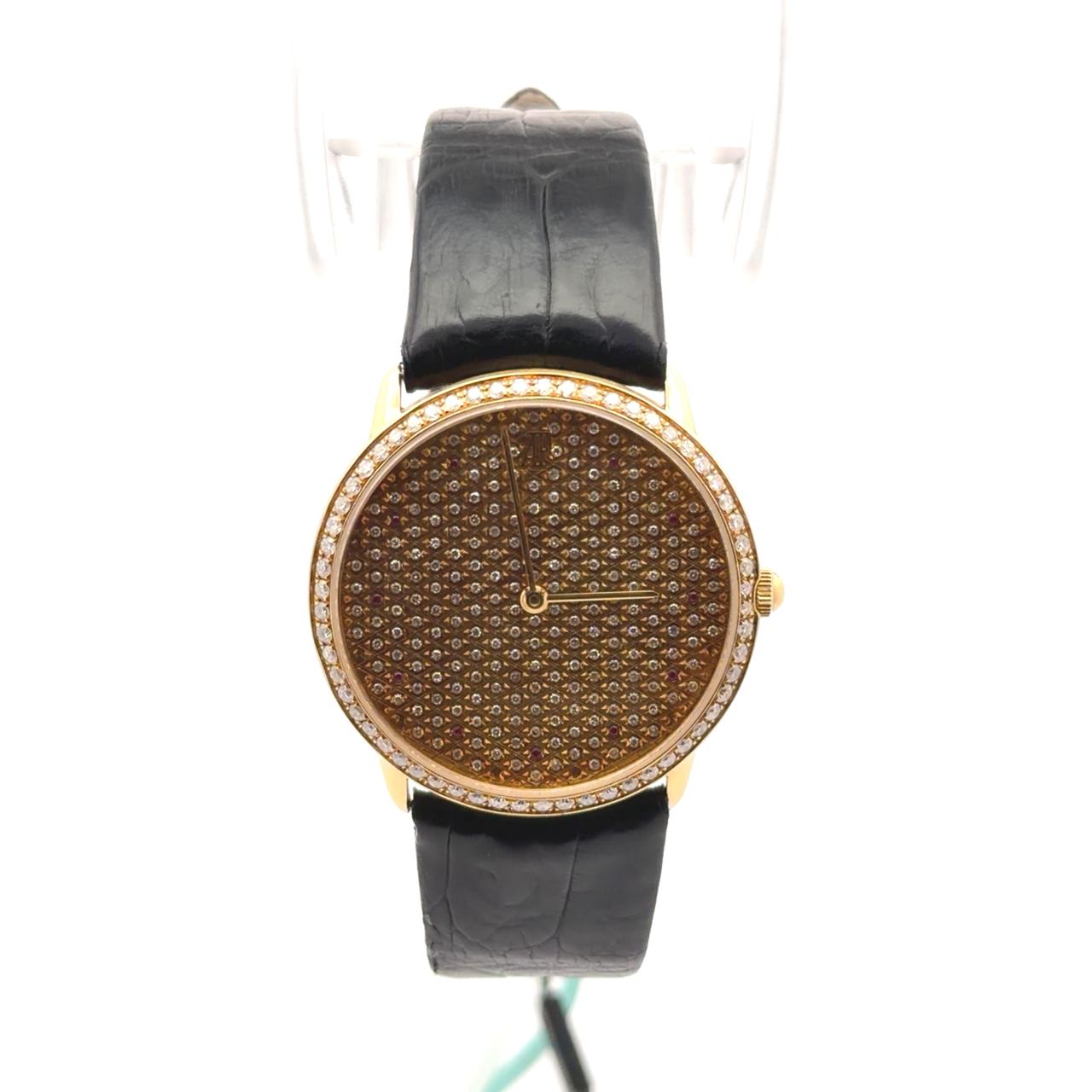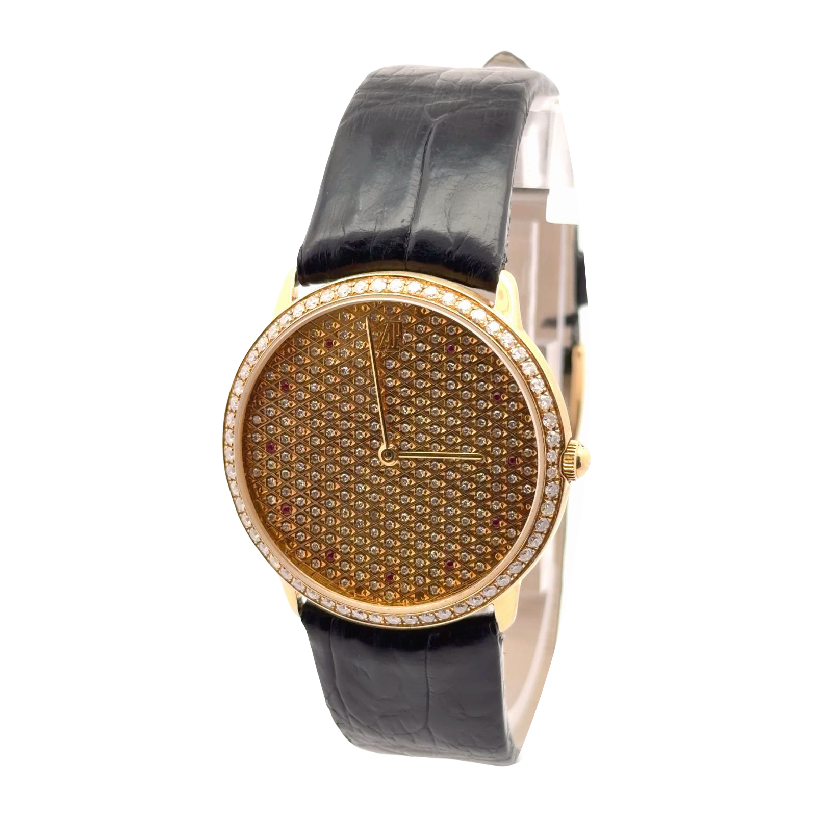 Audemars Piguet Classic Ultra Thin Diamond is a refined expression of minimalist elegance elevated to haute joaillerie status. Encased in yellow gold and paired with a sleek black leather strap, this timepiece exudes quiet opulence. Its dial is fully pavé-set with brilliant-cut diamonds arranged in a meticulous grid, creating a shimmering canvas that reflects light with every movement. The bezel continues the gem-set theme, framing the dial in a halo of brilliance. With no hour markers or numerals, the watch embraces purity of form, allowing the gold-toned hands and subtle “AP” logo at 12 o’clock to speak with understated confidence. Slim in profile and rich in detail, this ultra-thin model is a testament to Audemars Piguet’s mastery of both watchmaking and gem-setting, appealing to collectors who appreciate timeless sophistication with a bold, luxurious twist.
