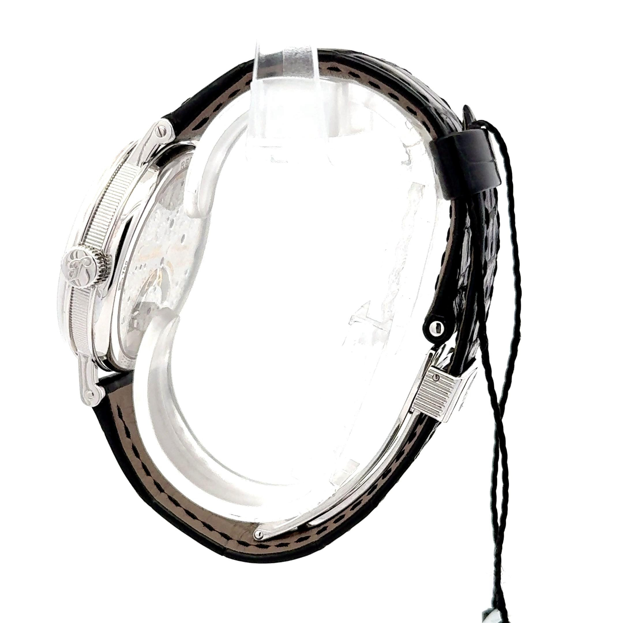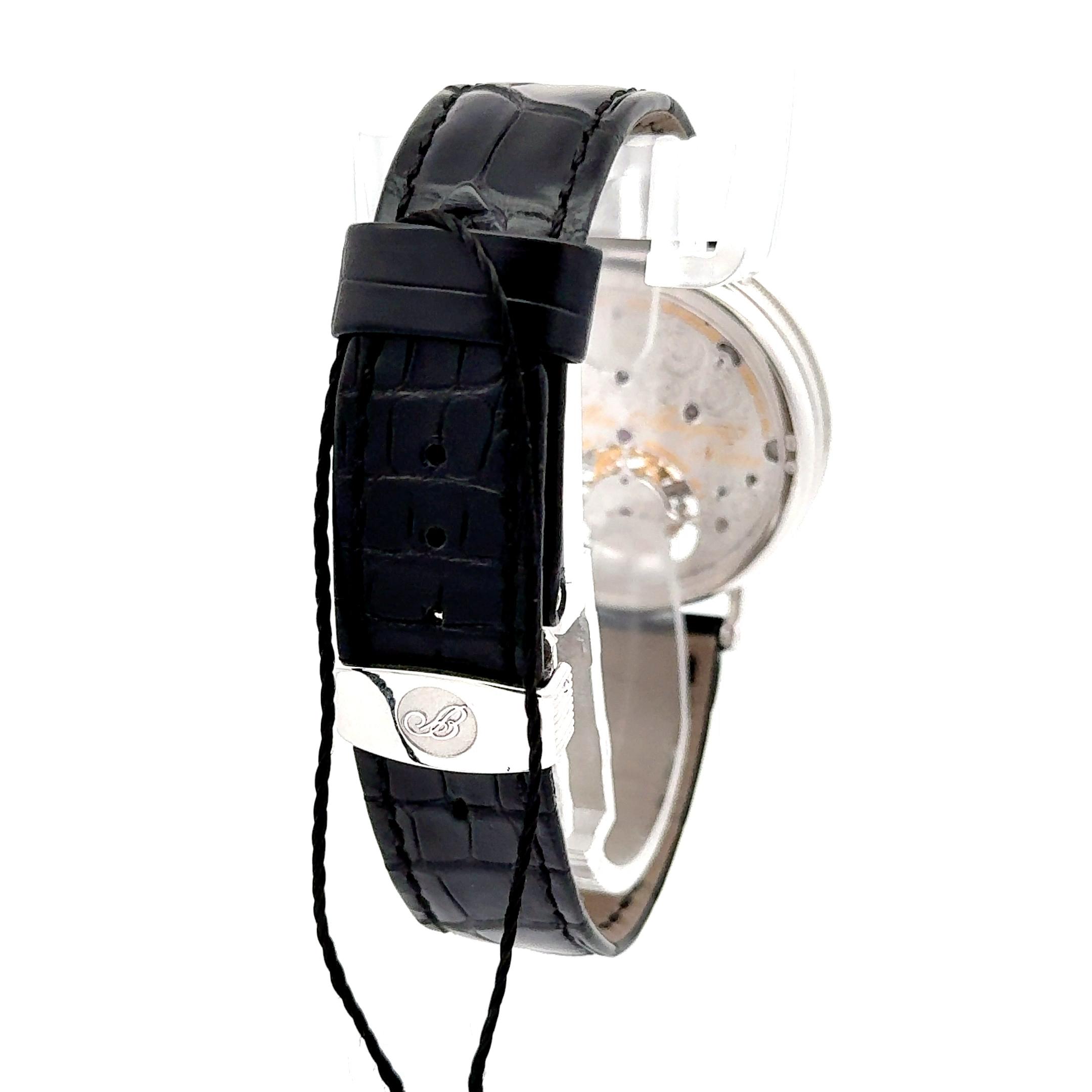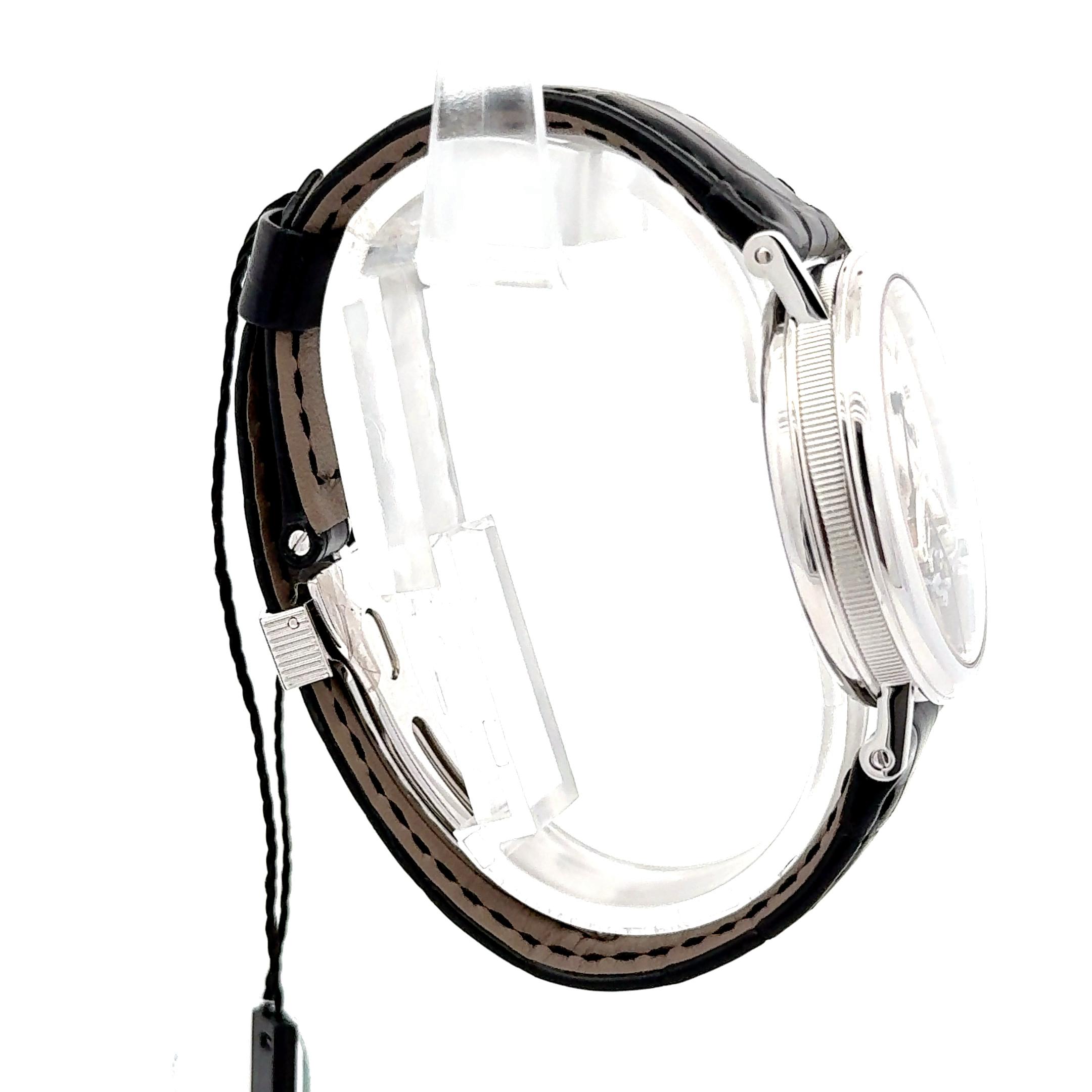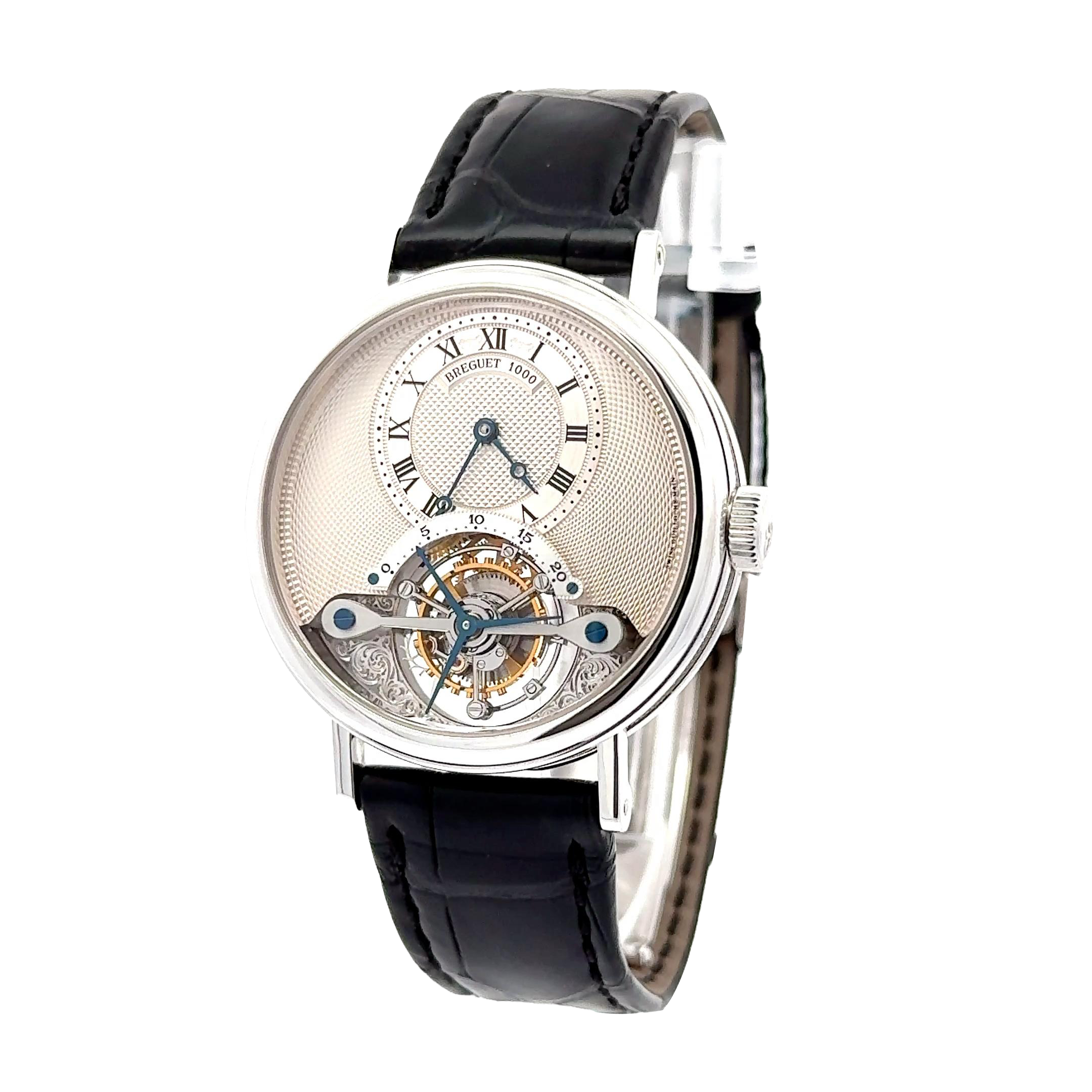 Breguet Classique Tourbillon Ref. 3357 is a masterful blend of horological heritage and refined artistry. Encased in a 36mm white gold coin-edged case, it features Breguet’s signature fluted sides and scalloped lugs that evoke timeless elegance. The dial is a canvas of craftsmanship, adorned with hand-turned guilloché patterns and a silvered finish, showcasing an off-center time display at 12 o’clock with blued Breguet hands and Roman numerals. At 6 o’clock, the mesmerizing tourbillon cage doubles as a small seconds indicator, revealing the intricate mechanics beneath. Powered by the hand-wound Caliber 558T, the movement boasts 21 jewels, a 50-hour power reserve, and exquisite hand engraving visible through the sapphire caseback.