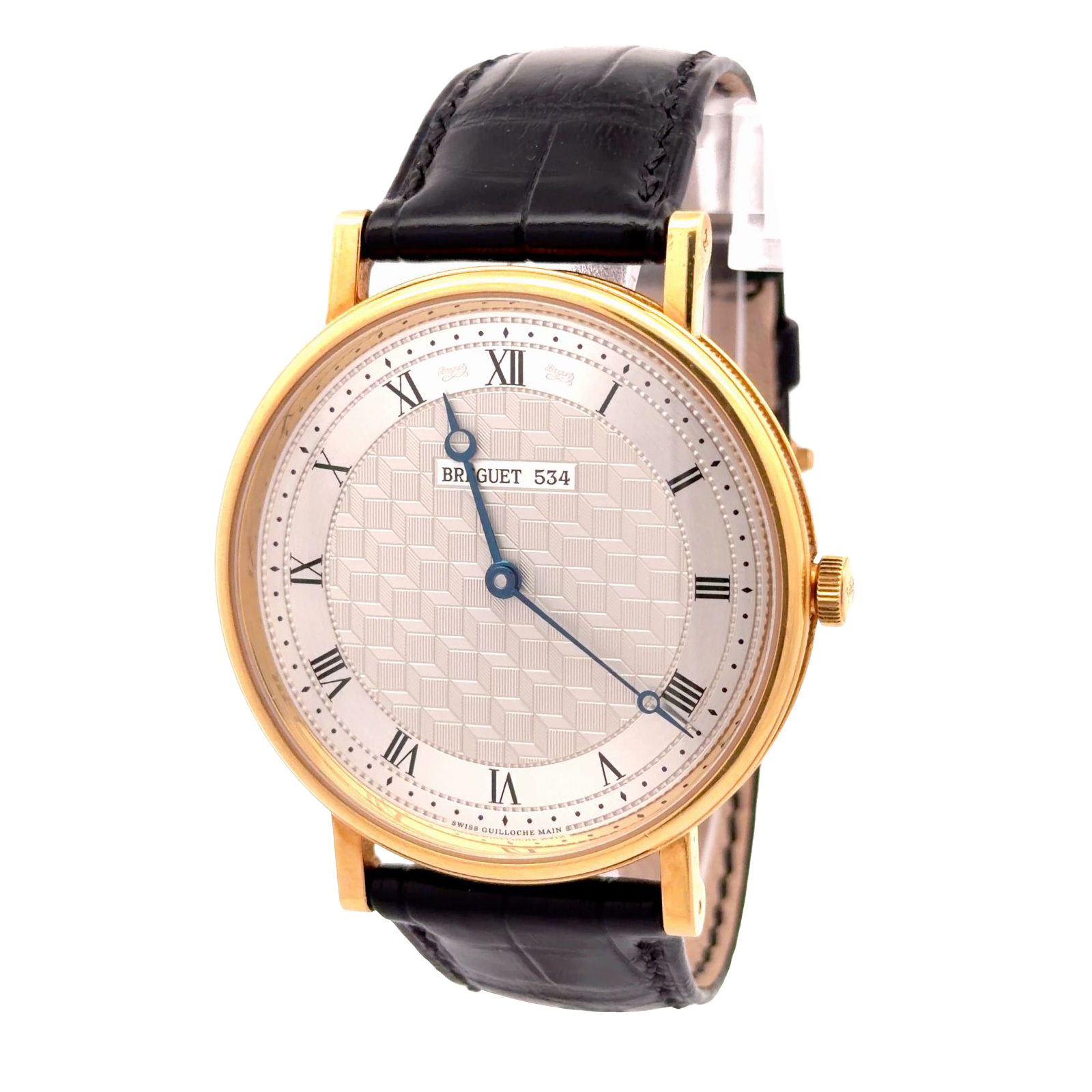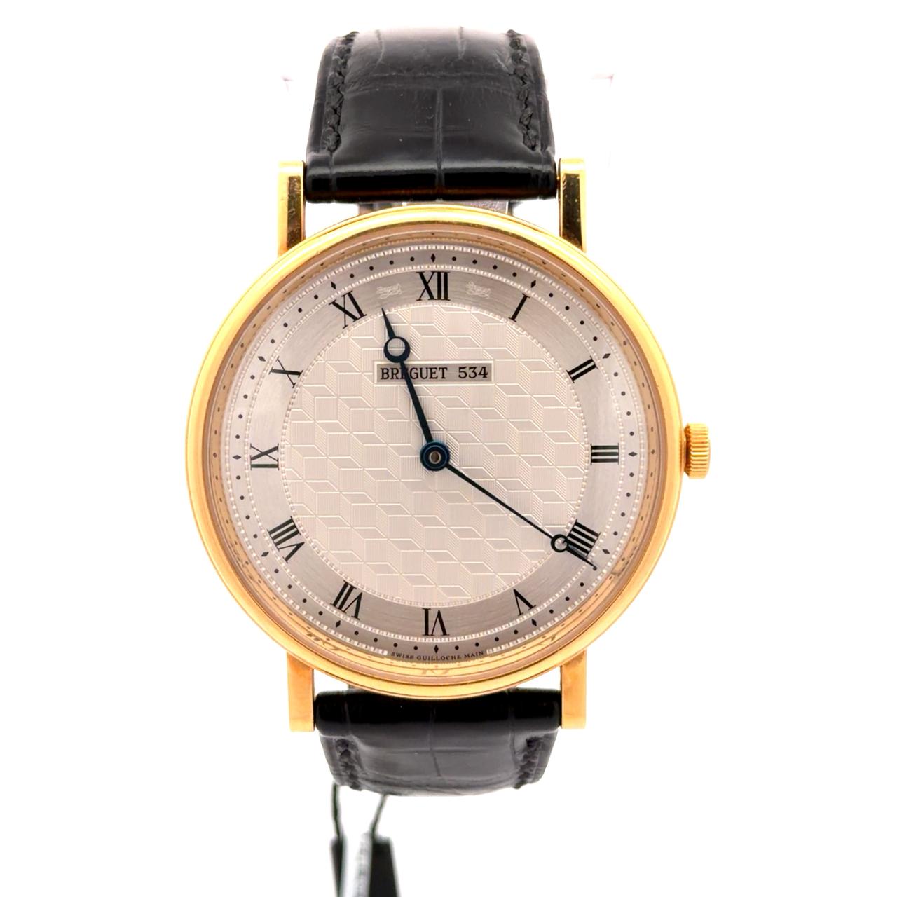 Breguet Classique reference 5967BA/11/9W6 is an exquisite, ultra-thin manual-wind dress watch that embodies traditional watchmaking artistry. This timepiece features a 41mm round case crafted from 18-carat yellow gold, distinguished by Breguet's signature fine caseband fluting and welded lugs with screwed-in pins. The silvered gold dial is a striking feature, meticulously engine-turned by hand with an "Art Deco Chequerboard" guilloché pattern that creates a three-dimensional effect.