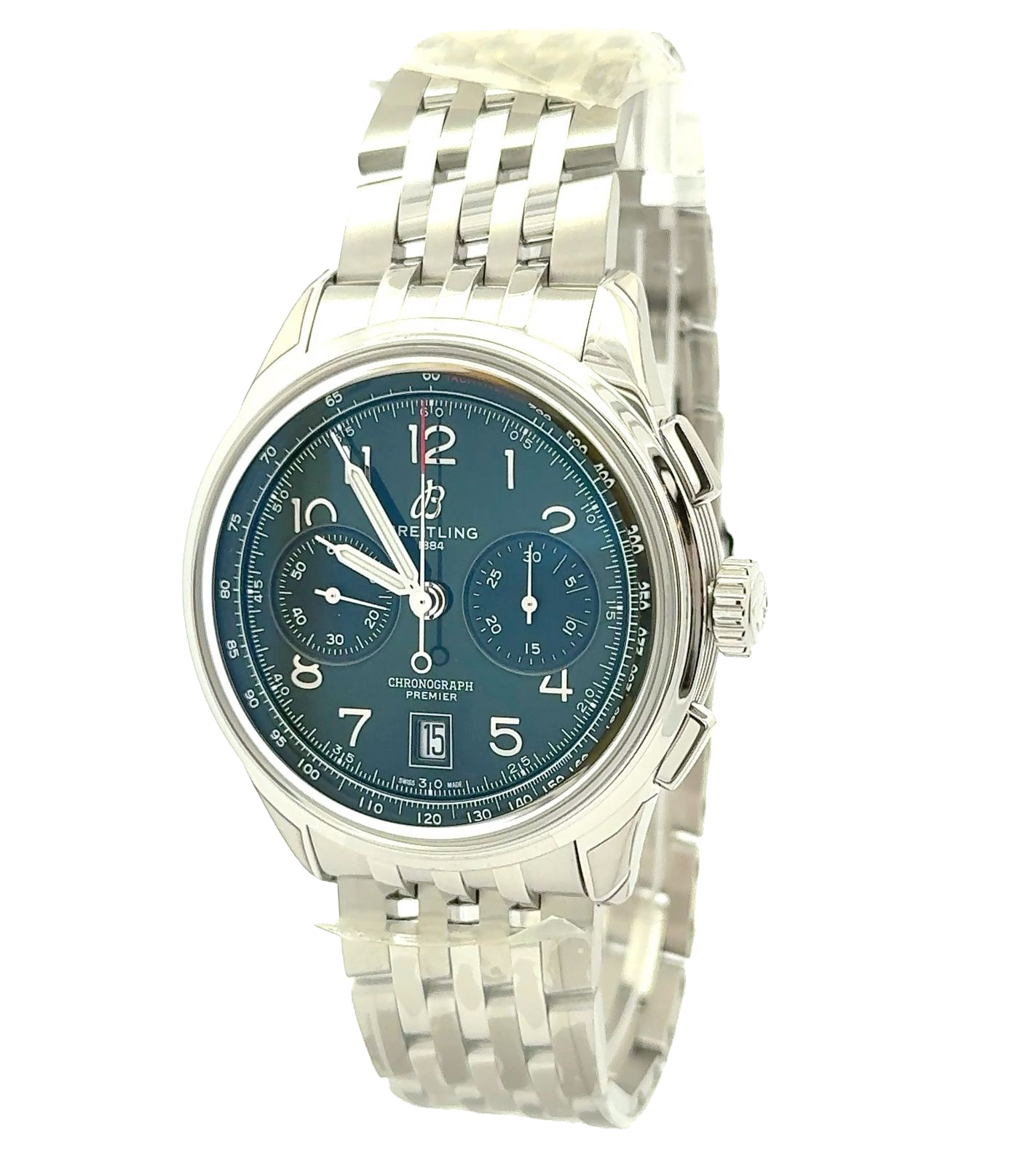 Breitling Premier B01 Chronograph 42 reference AB0145371L1A1 is a masterfully balanced timepiece that blends vintage elegance with modern performance. Its 42mm stainless steel case is paired with a striking green dial—a bold yet refined choice that sets it apart within the Premier collection. The dial features twin chronograph sub-dials at 3 and 9 o’clock, a date window at 6 o’clock, and applied Arabic numerals that evoke mid-century sophistication. Rectangular pushers and a smooth fixed bezel enhance its streamlined silhouette, while the stainless steel bracelet adds a polished, contemporary finish. At its core is the COSC-certified Breitling Manufacture Caliber 01, an in-house automatic movement offering a 70-hour power reserve and column-wheel chronograph precision. The AB0145371L1A1 is not just a watch—it’s a statement of taste, craftsmanship, and individuality, ideal for those who appreciate heritage reimagined with flair.