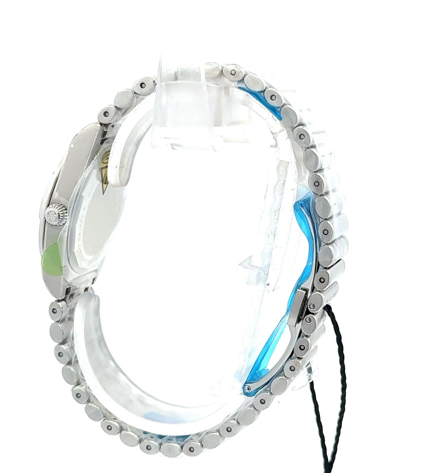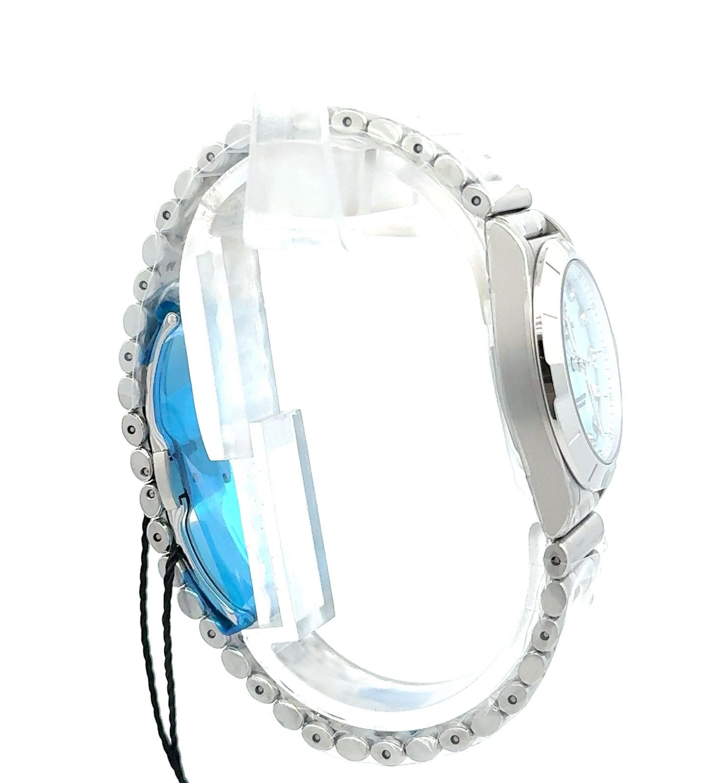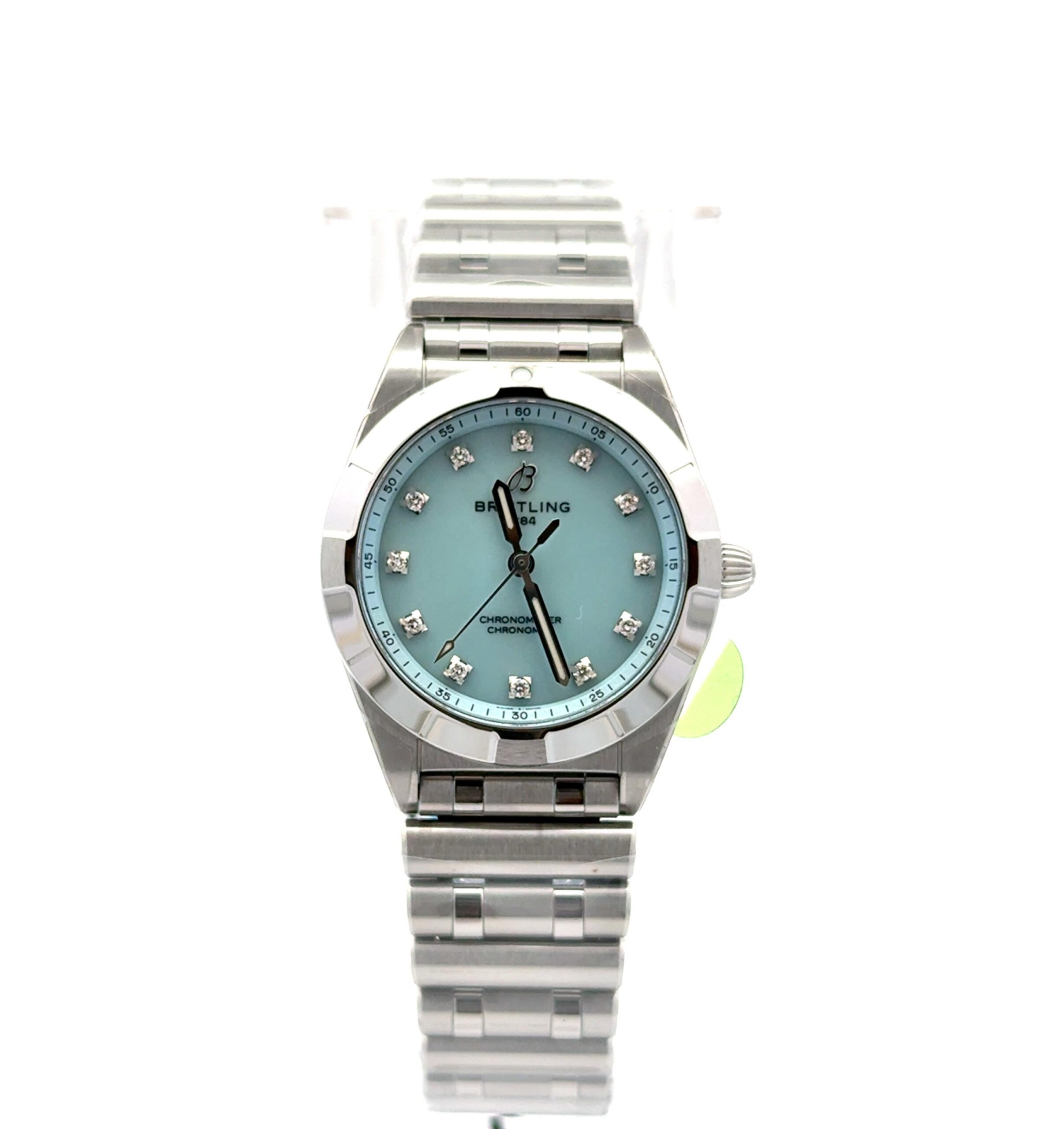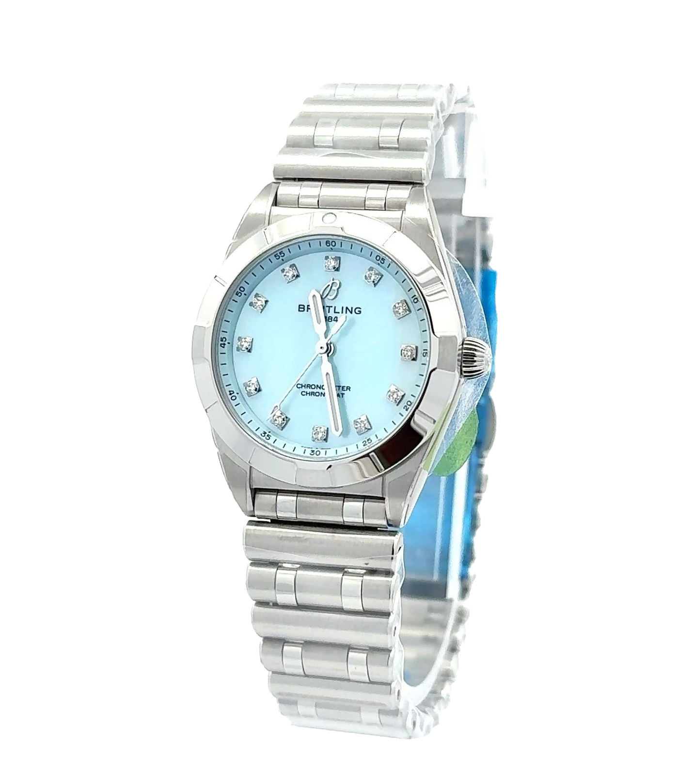 Breitling Chronomat 28 is a refined expression of modern luxury, crafted for those who appreciate both aesthetic finesse and horological integrity. Encased in polished stainless steel, its compact 28 mm silhouette is designed to flatter the wrist with understated sophistication. The dial, rendered in a luminous light blue mother-of-pearl, is adorned with lab-grown diamond hour markers that shimmer with every movement—an ethical nod to brilliance. Powered by Breitling’s thermocompensated SuperQuartz™ Caliber 72, this timepiece delivers ten times the accuracy of standard quartz movements and is officially COSC-certified, ensuring chronometric performance that meets the highest standards. The cambered sapphire crystal, glareproofed on both sides, offers crystal-clear legibility, while the iconic Rouleaux-style bracelet with polished center links and a butterfly clasp ensures seamless comfort and style.
