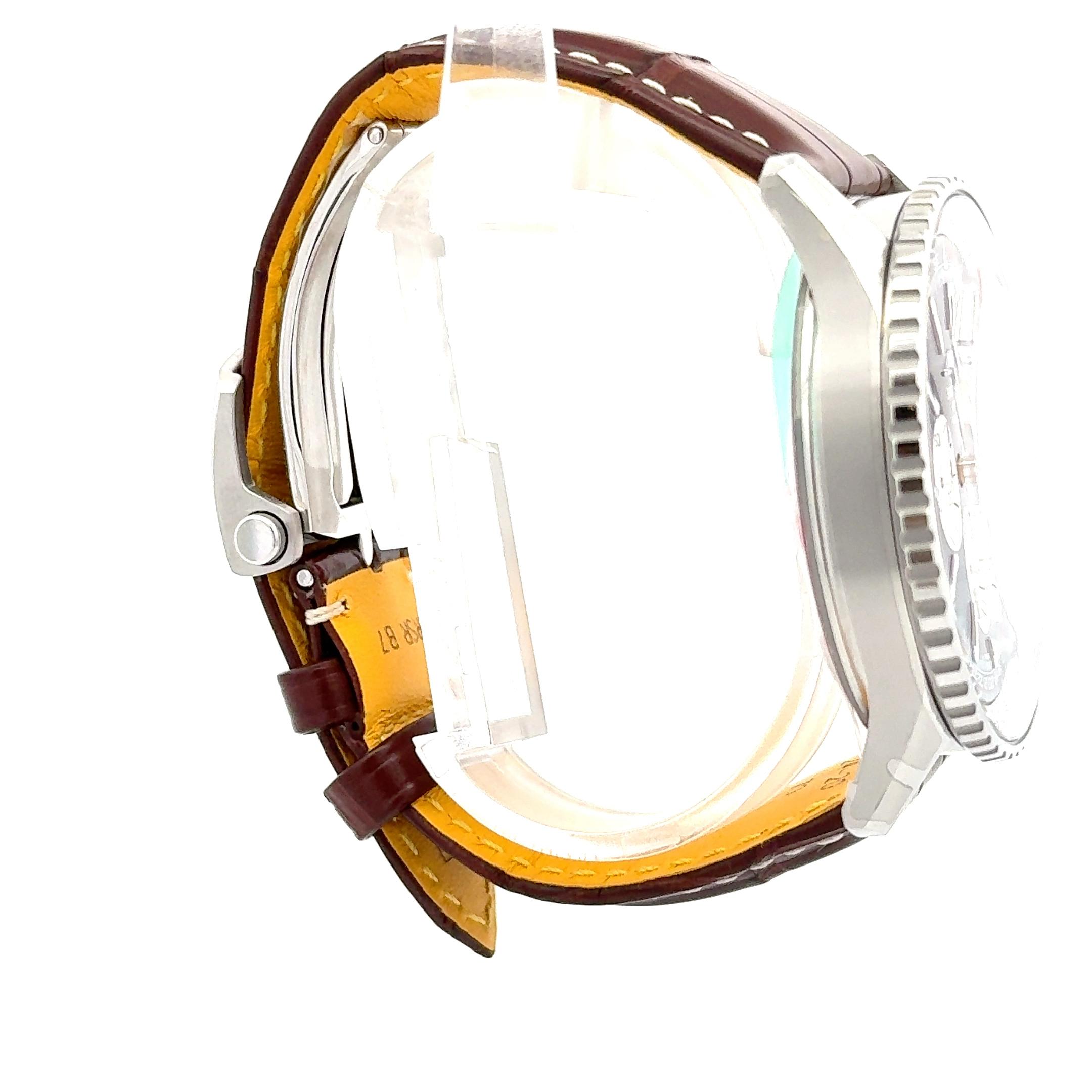 Breitling Navitimer B01 Chronograph 46 AB0137211C1P1 is a sophisticated and iconic chronograph watch that combines precision engineering with timeless style. Featuring a 46mm stainless steel case, this model is powered by the Breitling B01 automatic movement, offering a robust 70-hour power reserve. The watch is equipped with a highly functional chronograph, featuring three sub-dials and a tachymeter scale for calculating speed over distance. The dial is characterized by its classic Navitimer design, with contrasting sub-dials and a distinctive slide rule bezel, which pilots and aviation enthusiasts can use for complex calculations. The elegant design, paired with modern technology, makes the Navitimer 1 B01 Chronograph 46 a prestigious and versatile timepiece suitable for both aviation professionals and watch collectors.