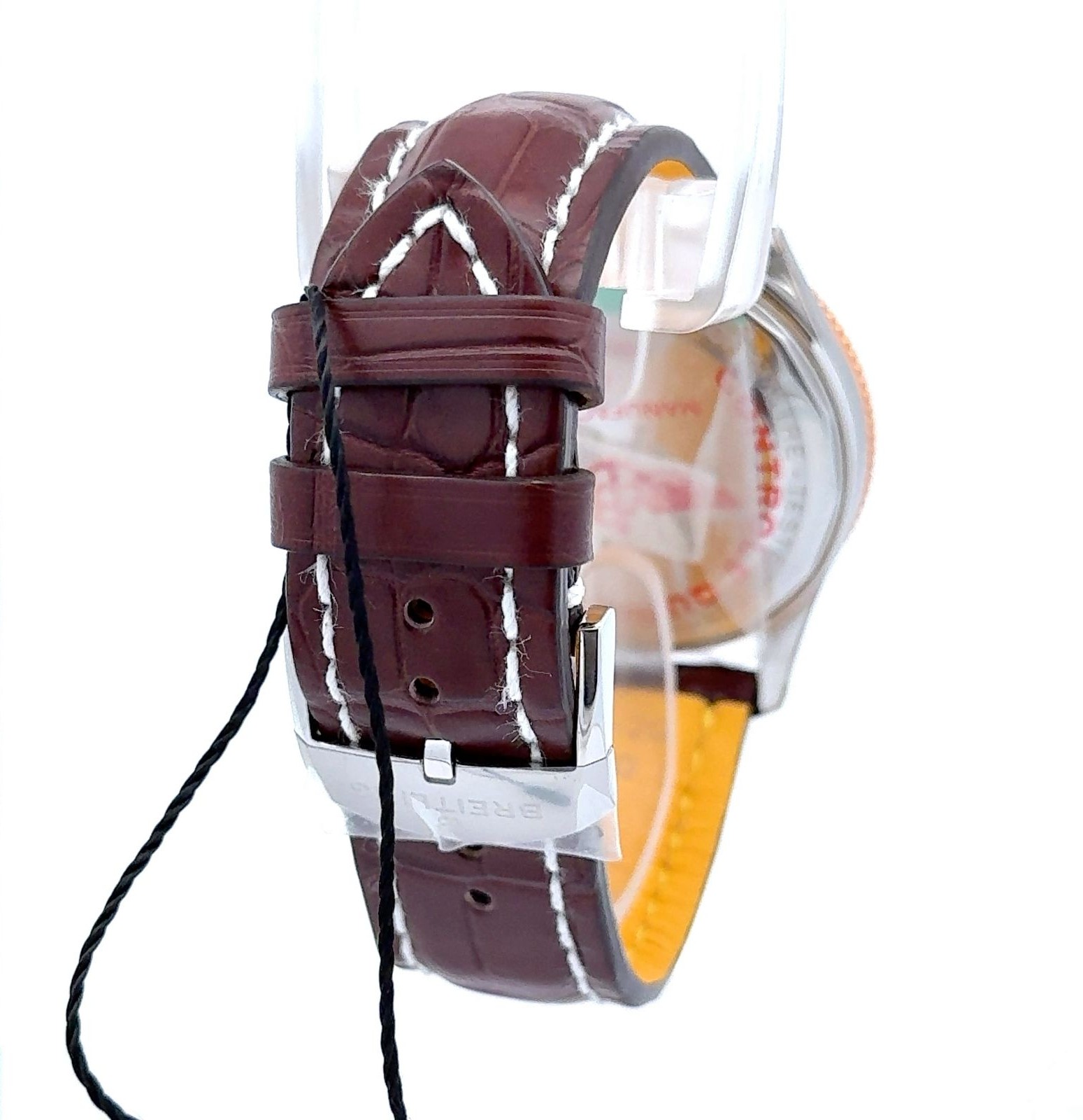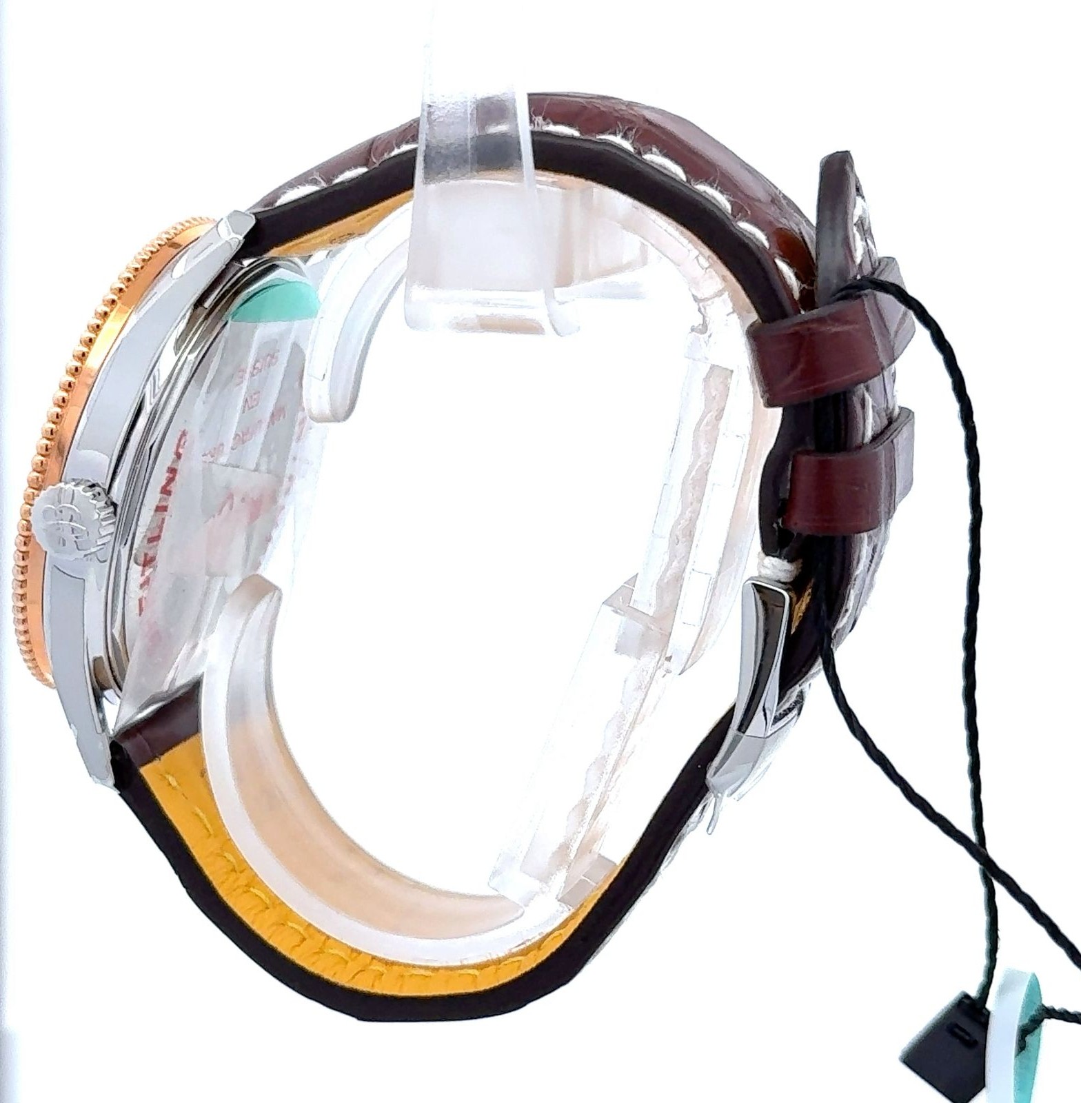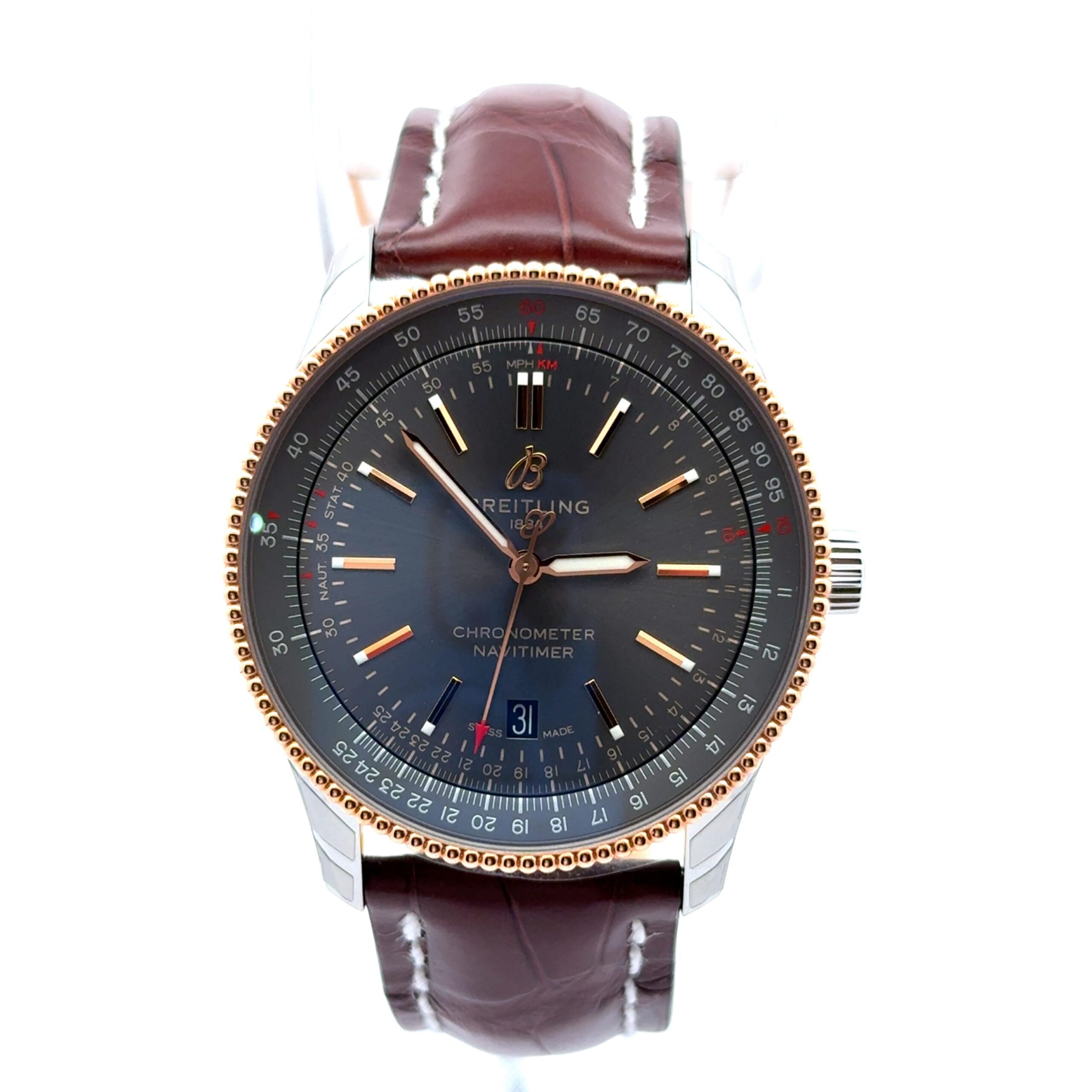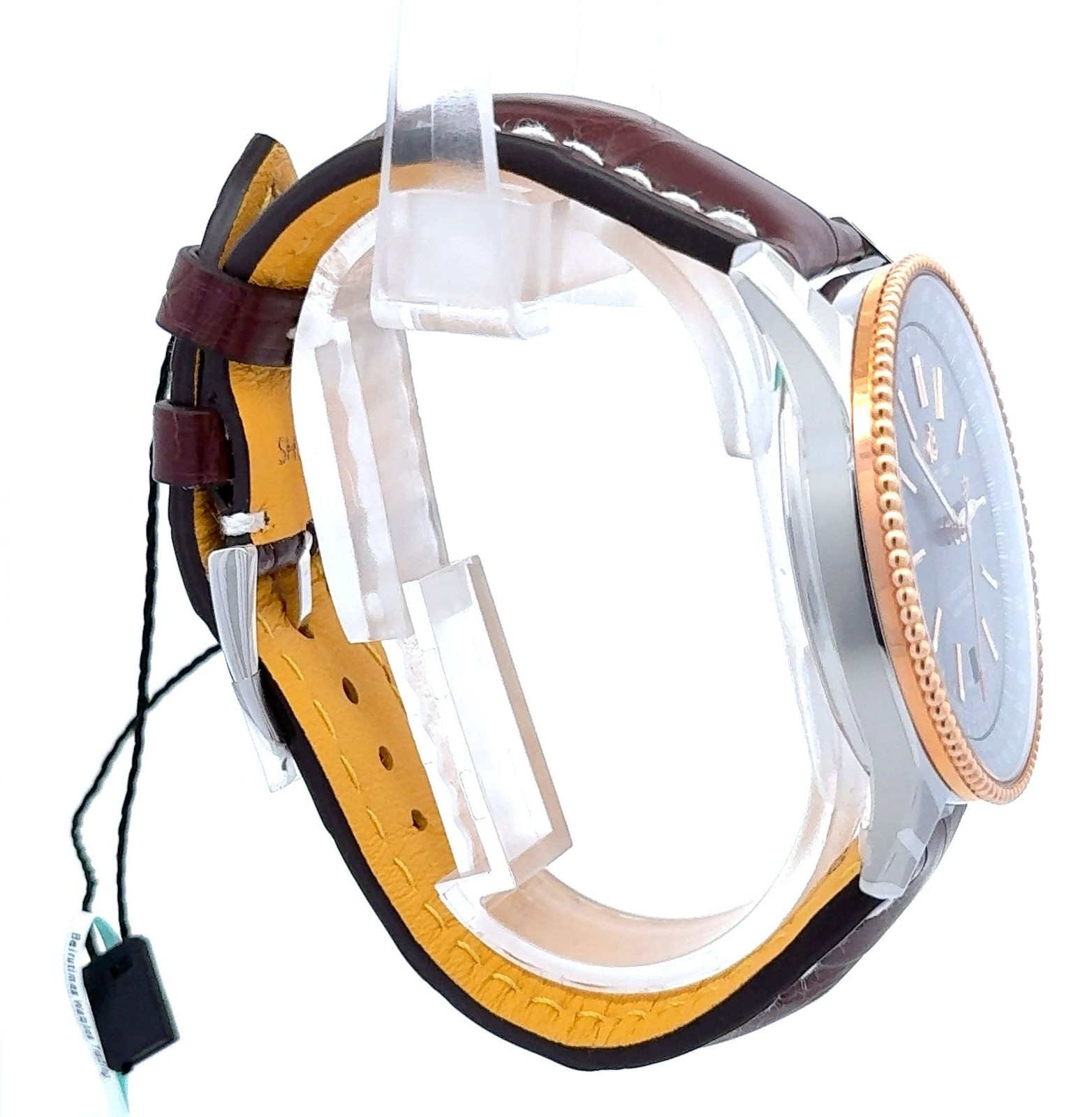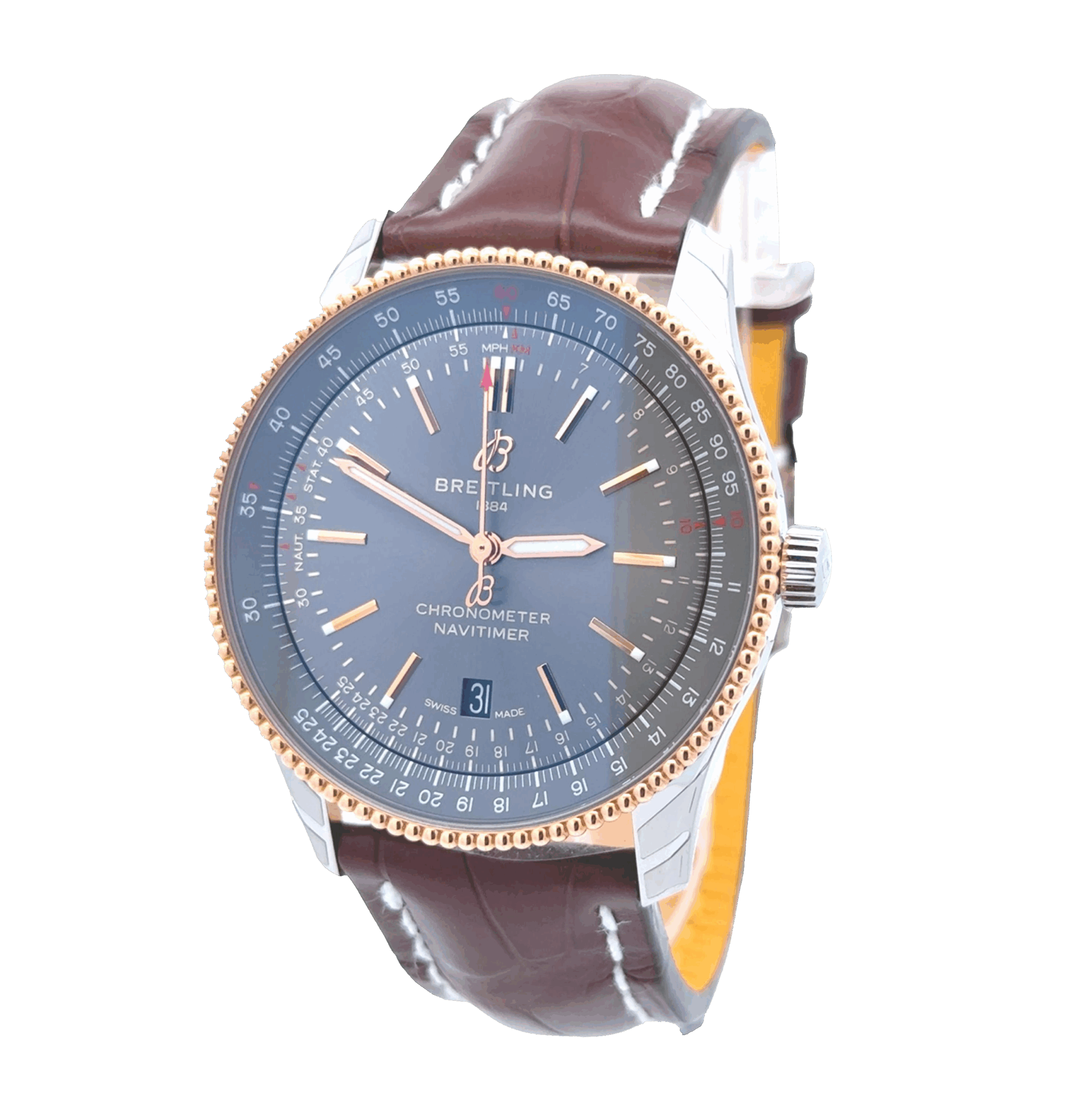 Breitling Navitimer Automatic 41 reference U17326121M1P1 is a refined expression of aviation-inspired elegance, blending classic design with contemporary sophistication. Its 41mm stainless steel case is paired with a luxurious 18k rose gold beaded bezel, framing a deep anthracite dial that exudes understated confidence. Rose gold hands and hour markers, treated with Super-LumiNova, offer warm contrast and excellent legibility, while the date window at 6 o’clock adds practical utility. The signature circular slide rule scale encircling the dial pays homage to the Navitimer’s flight-calculating heritage, making this timepiece as functional as it is iconic. Powered by the COSC-certified Breitling Caliber 17, the watch delivers reliable automatic performance with a 38-hour power reserve. Finished with a brown leather strap featuring white stitching, the U17326121M1P1 is a versatile companion for those who appreciate timeless design, technical precision, and a touch of gold-accented distinction.