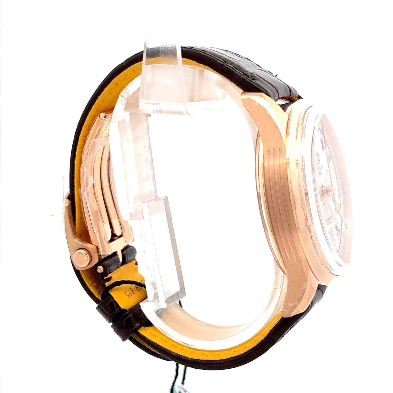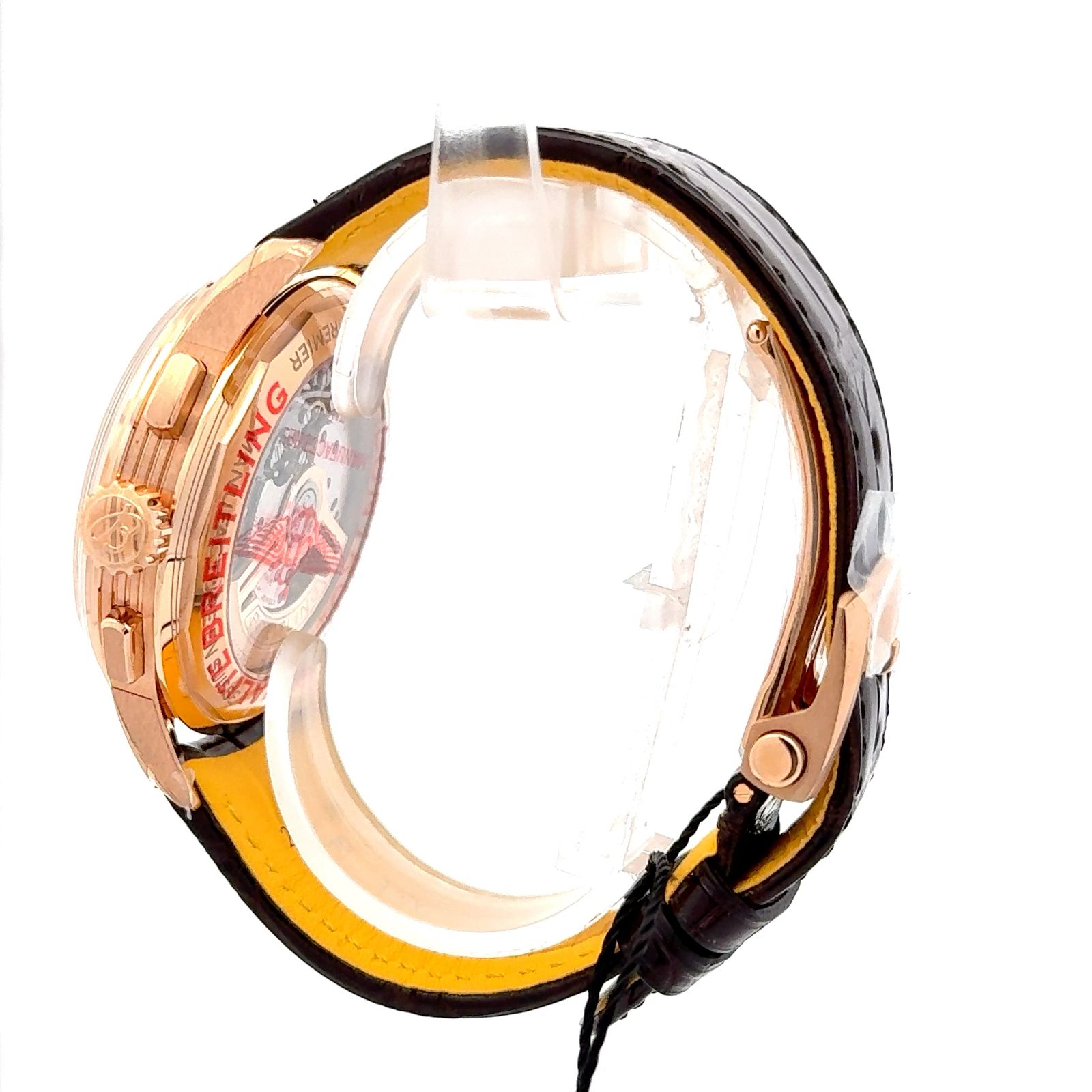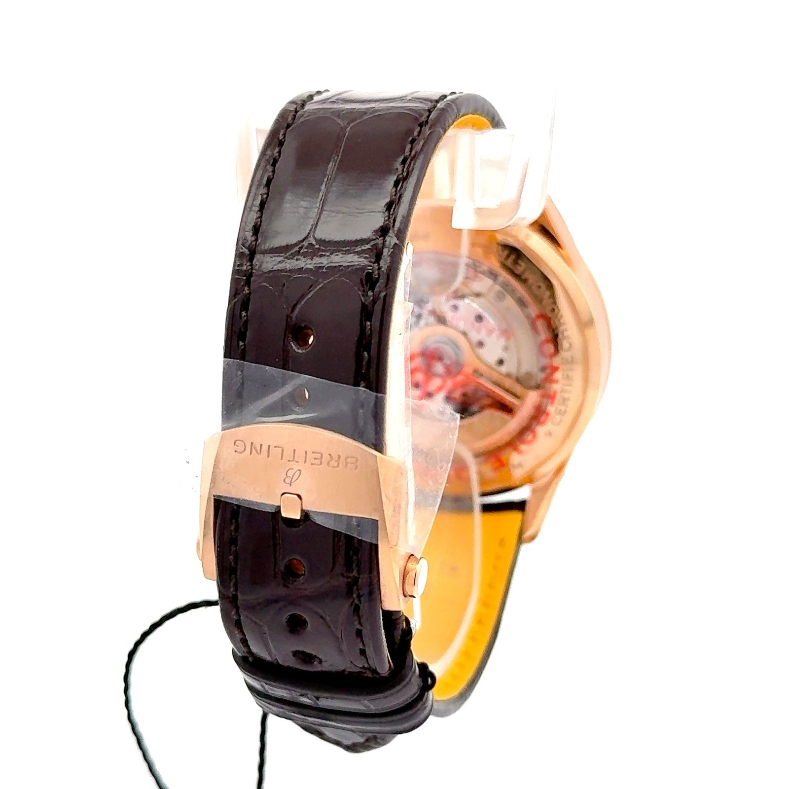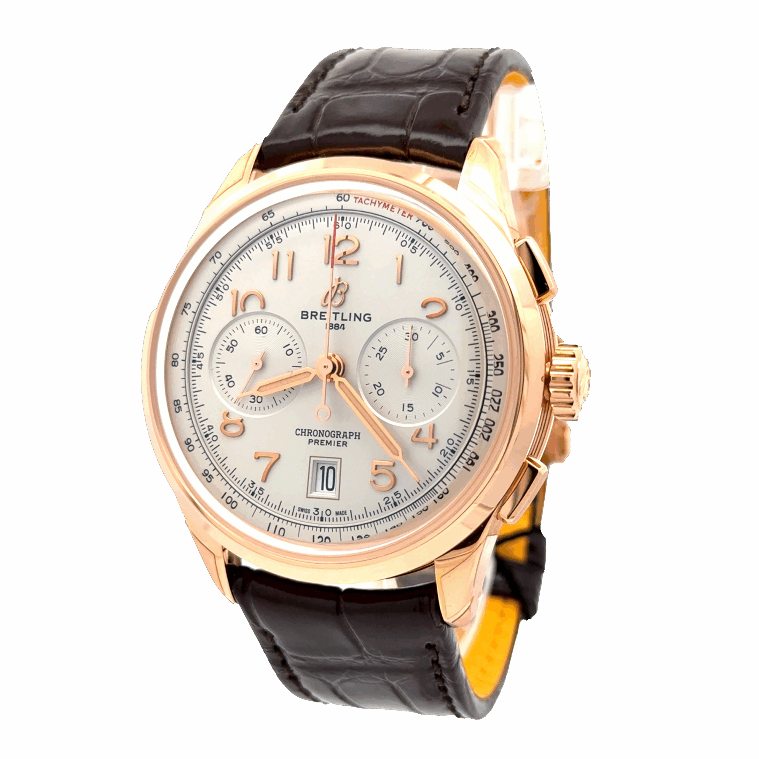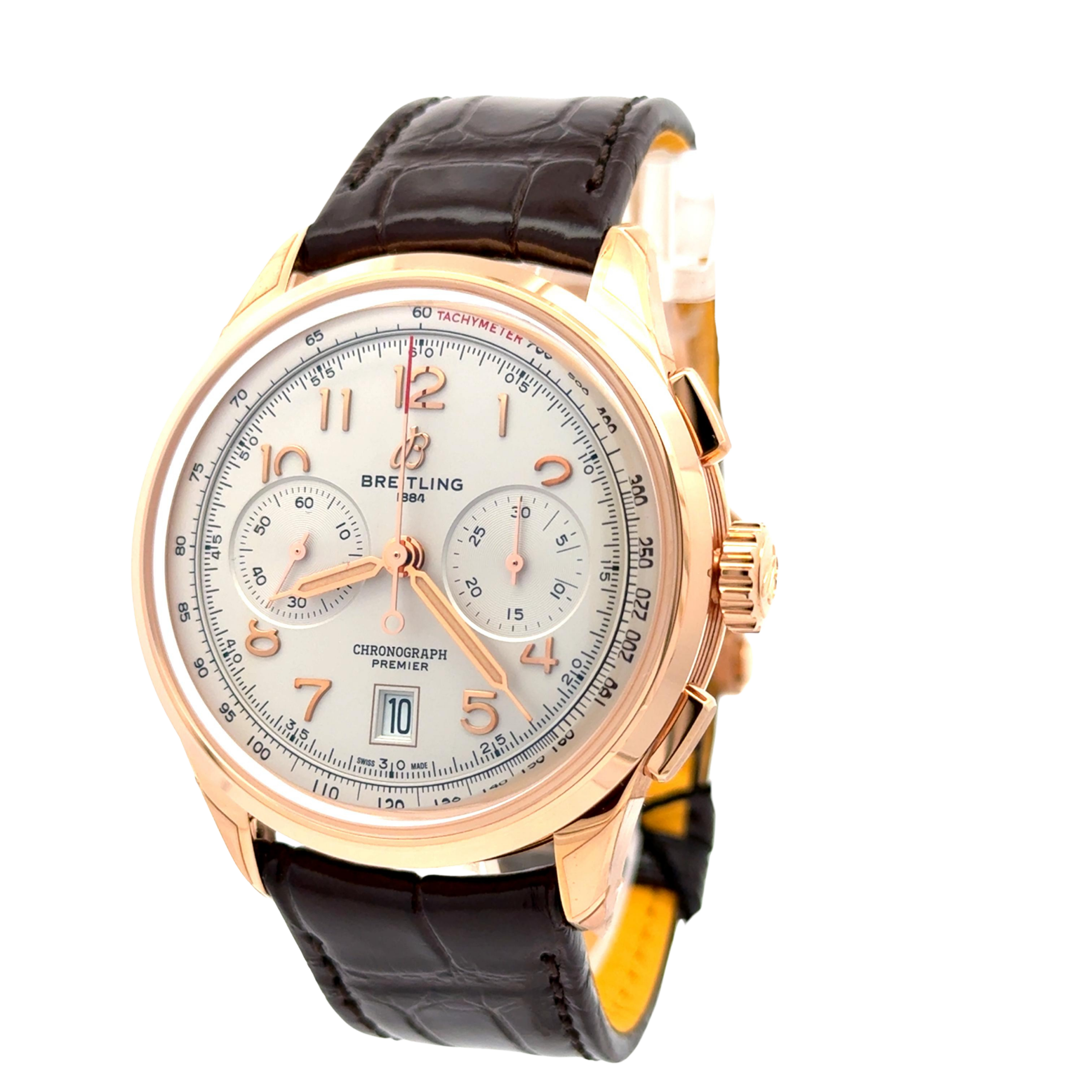 Breitling Premier B01 Chronograph 42 reference RB0145371G1P1 is a striking embodiment of refined luxury and mechanical excellence. Encased in 18k red gold, its 42mm case exudes warmth and sophistication, perfectly complemented by a cream dial that evokes vintage elegance. The dial layout features twin chronograph sub-dials at 3 and 9 o’clock, a date aperture at 6 o’clock, and applied Arabic numerals that enhance its classic charm. Rectangular pushers and a smooth fixed bezel underscore the Premier collection’s streamlined aesthetic, while the black alligator leather strap with brown stitching adds a touch of timeless contrast. At its heart beats the COSC-certified Breitling Manufacture Caliber 01, an in-house automatic movement offering a 70-hour power reserve and column-wheel chronograph precision. The RB0145371G1P1 is not merely a timepiece—it’s a statement of impeccable taste, ideal for those who appreciate heritage craftsmanship elevated by contemporary detail.