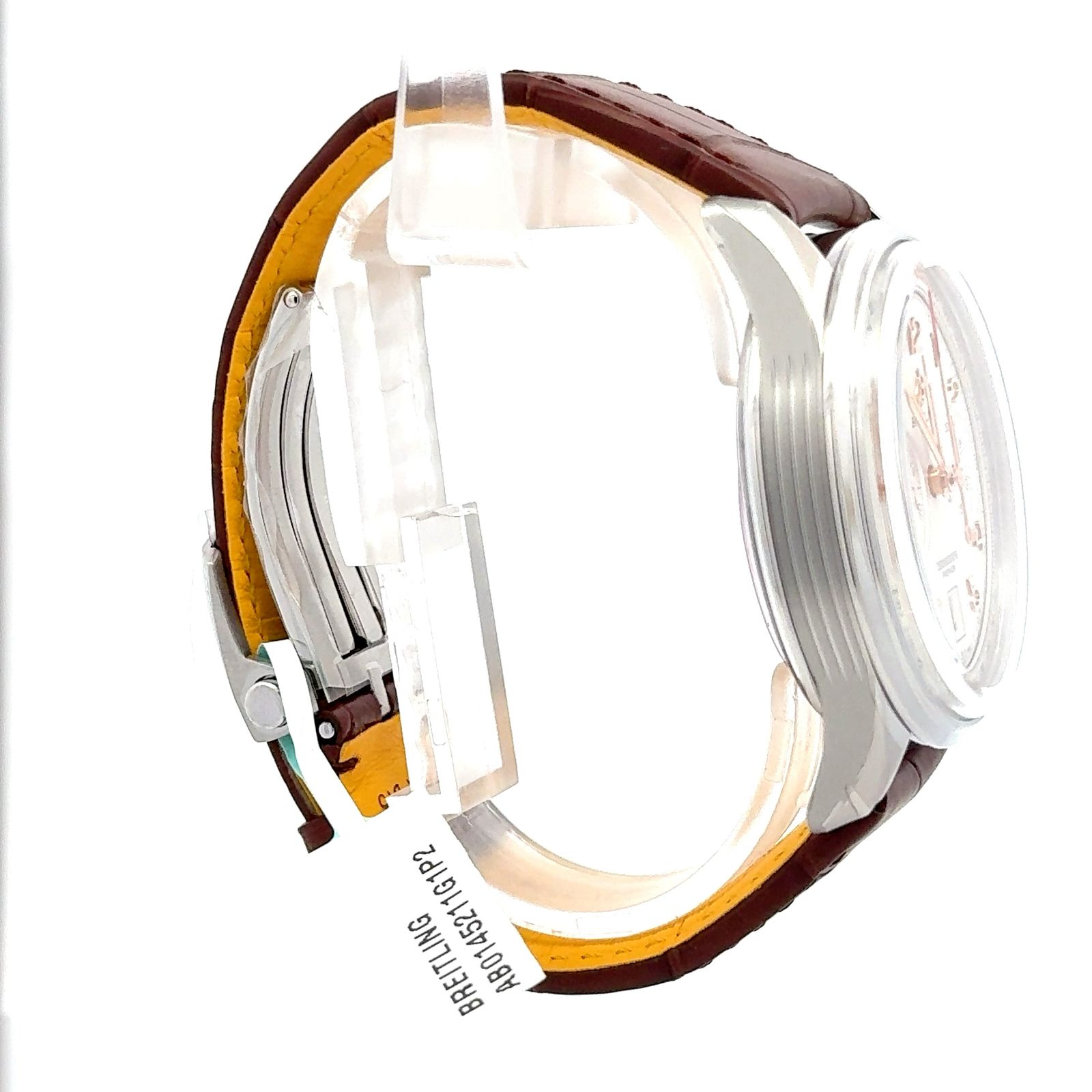 Breitling Premier B01 Chronograph 42 with reference number AB0145211G1P2 is a sophisticated timepiece that seamlessly blends vintage elegance with contemporary performance. Housed in a 42mm polished stainless steel case, this watch features a striking cream-colored dial .The dial includes a date window subtly positioned at 6 o'clock, as well as a tachymeter scale around the outer edge, giving it both form and function. At the heart of the watch is Breitling’s in-house Caliber B01 movement, a COSC-certified chronometer known for its precision, 70-hour power reserve, and column-wheel chronograph mechanism. The transparent sapphire caseback showcases the finely finished movement, a treat for mechanical watch enthusiasts. Protected by a cambered sapphire crystal with double anti-reflective coating, the watch ensures optimal legibility in various lighting conditions. Water-resistant to 100 meters (10 bar), it is practical enough for daily wear while retaining a refined aesthetic.