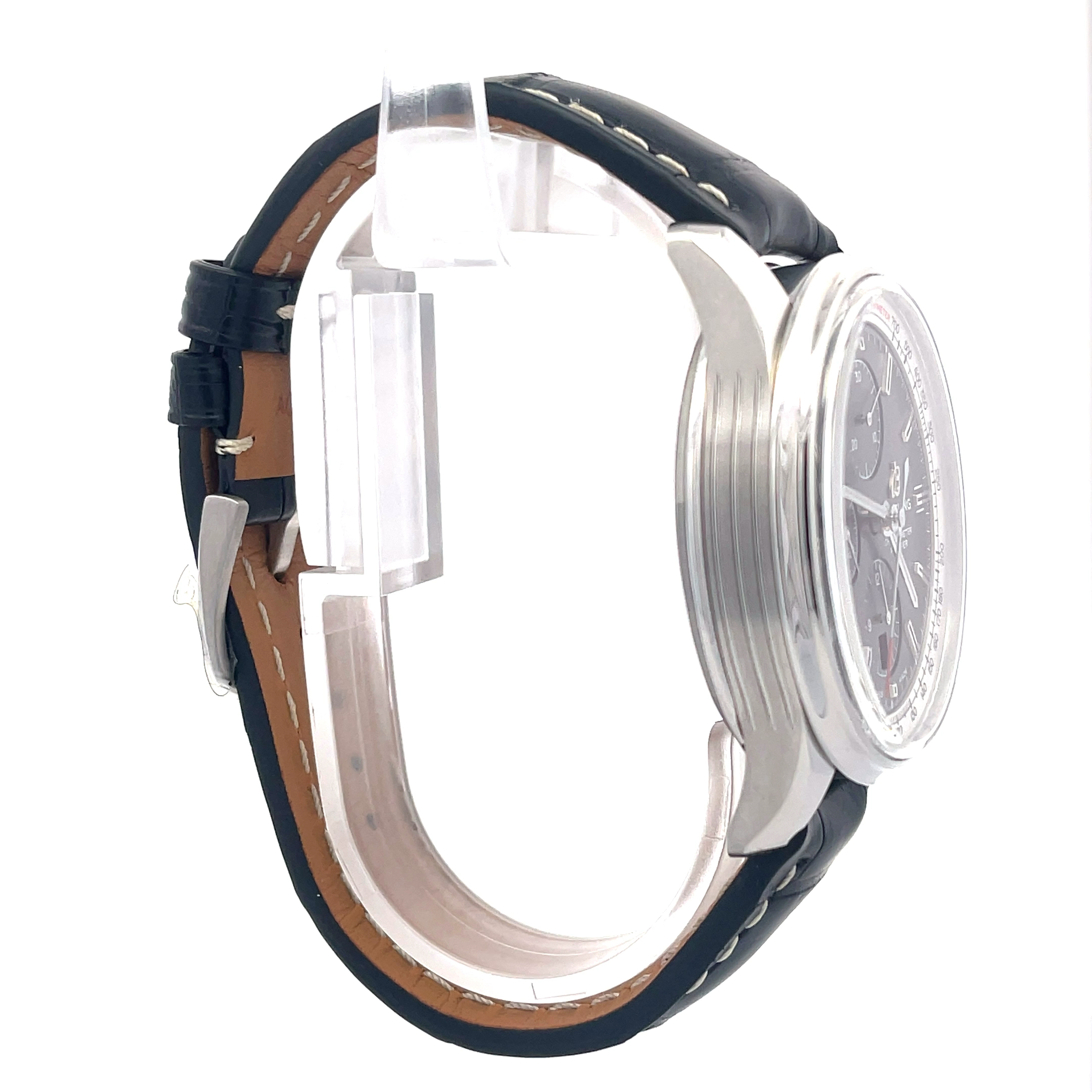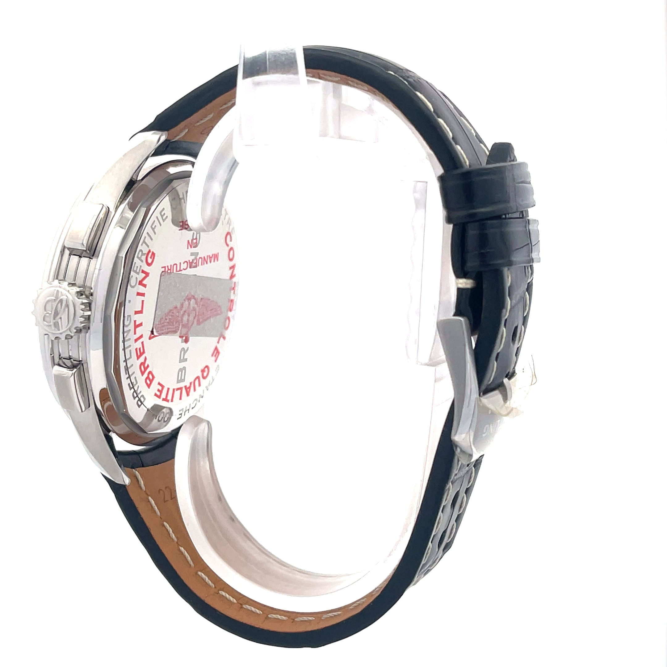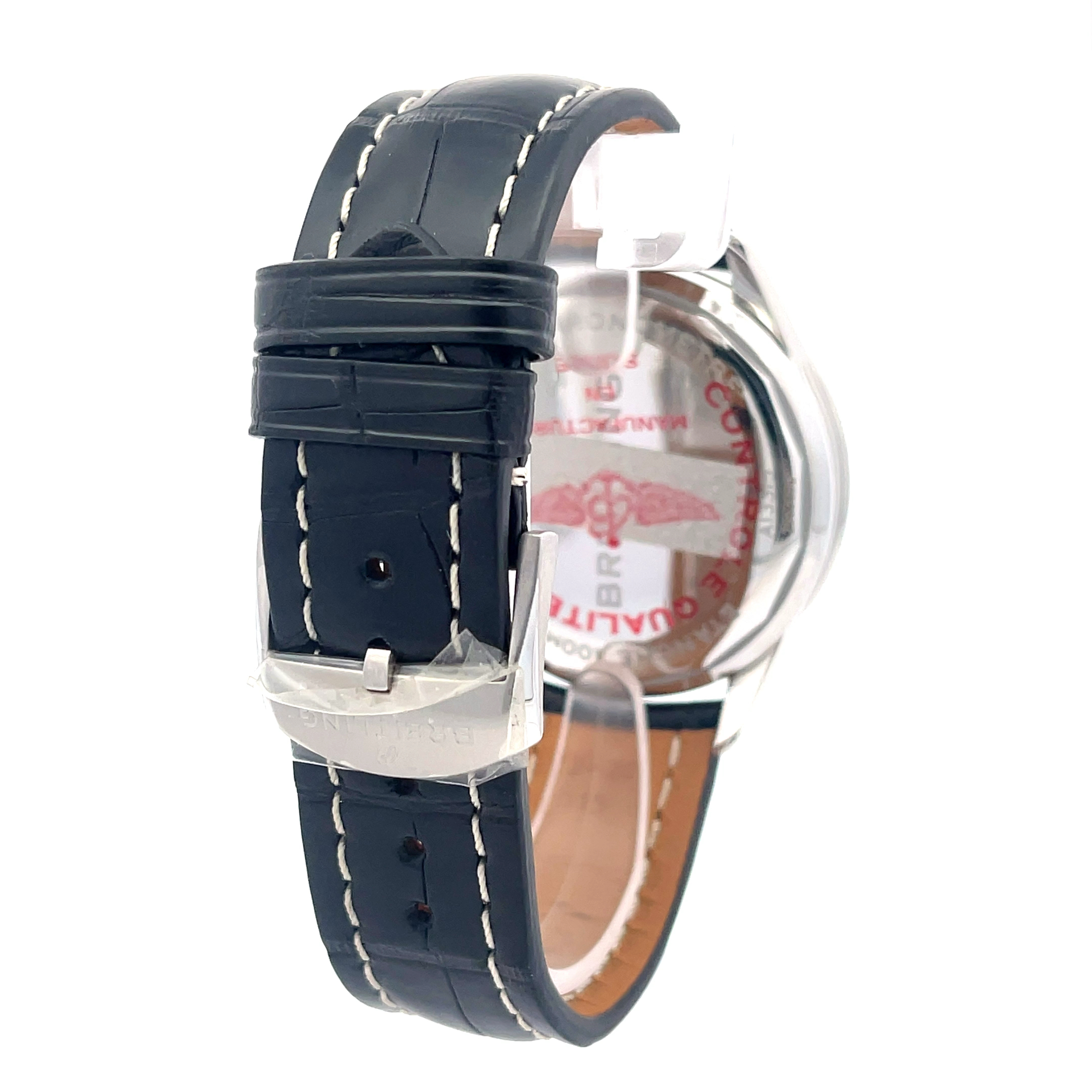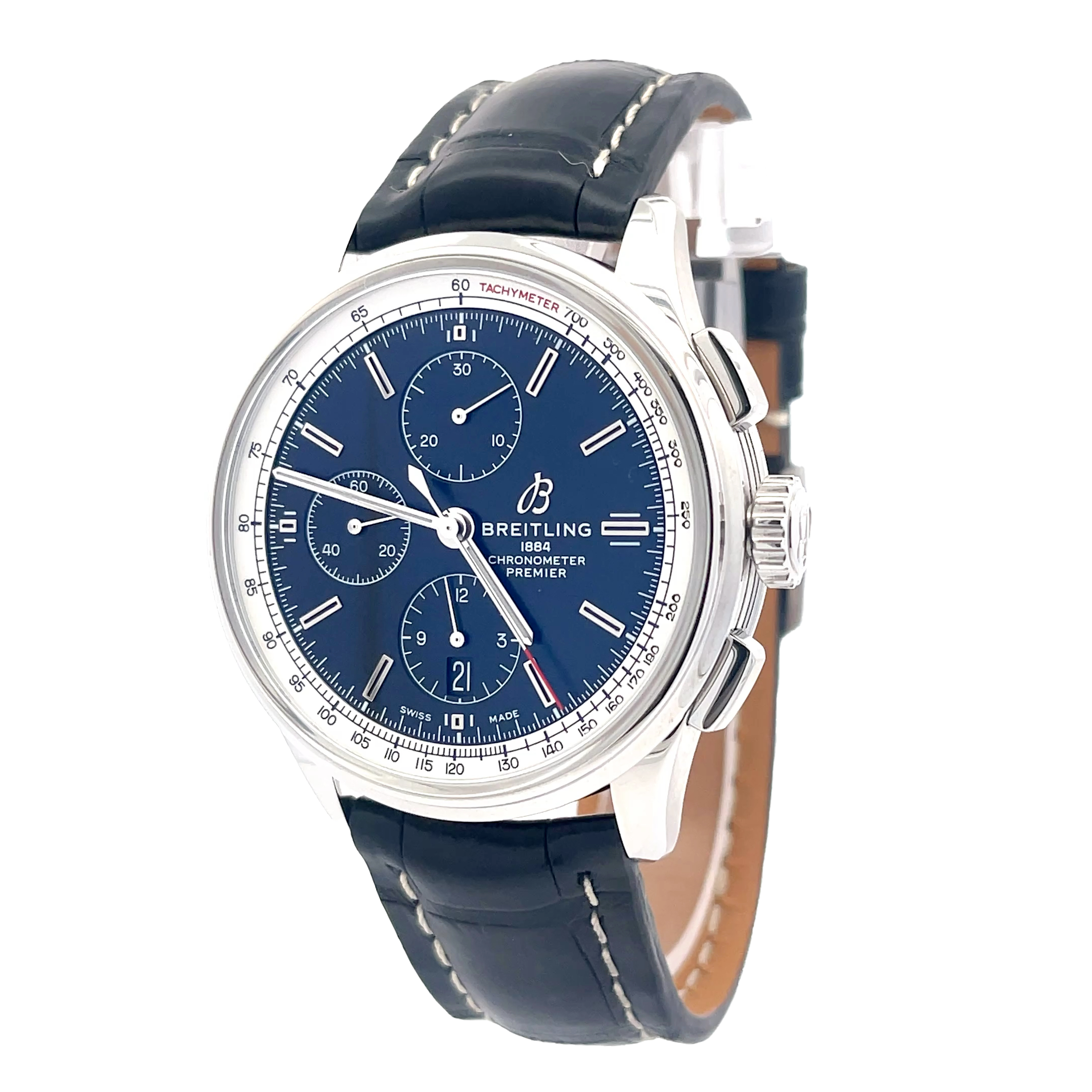 Breitling Premier Chronograph 42 A1331535B1P2 men's watch. Features a polished 42mm round stainless steel case and black leather strap. Polished stainless steel fixed bezel. Black dial with luminescent hour and minute hands. Index hour markers. Date displayed in dial aperture at 6 o'clock. Chronograph with large central chronograph seconds hand, 30 minute counter sub-dial at 12 o'clock and 12 hour counter sub-dial at 6 o'clock. Small seconds sub-dial at 9 o'clock. Tachymeter scale. Powered by the Breitling Caliber 13 self-winding automatic COSC Chronometer certified movement. Water resistant to 100 meters / 330 feet. Functions: hours, minutes, small seconds, date, chronograph, tachymeter.