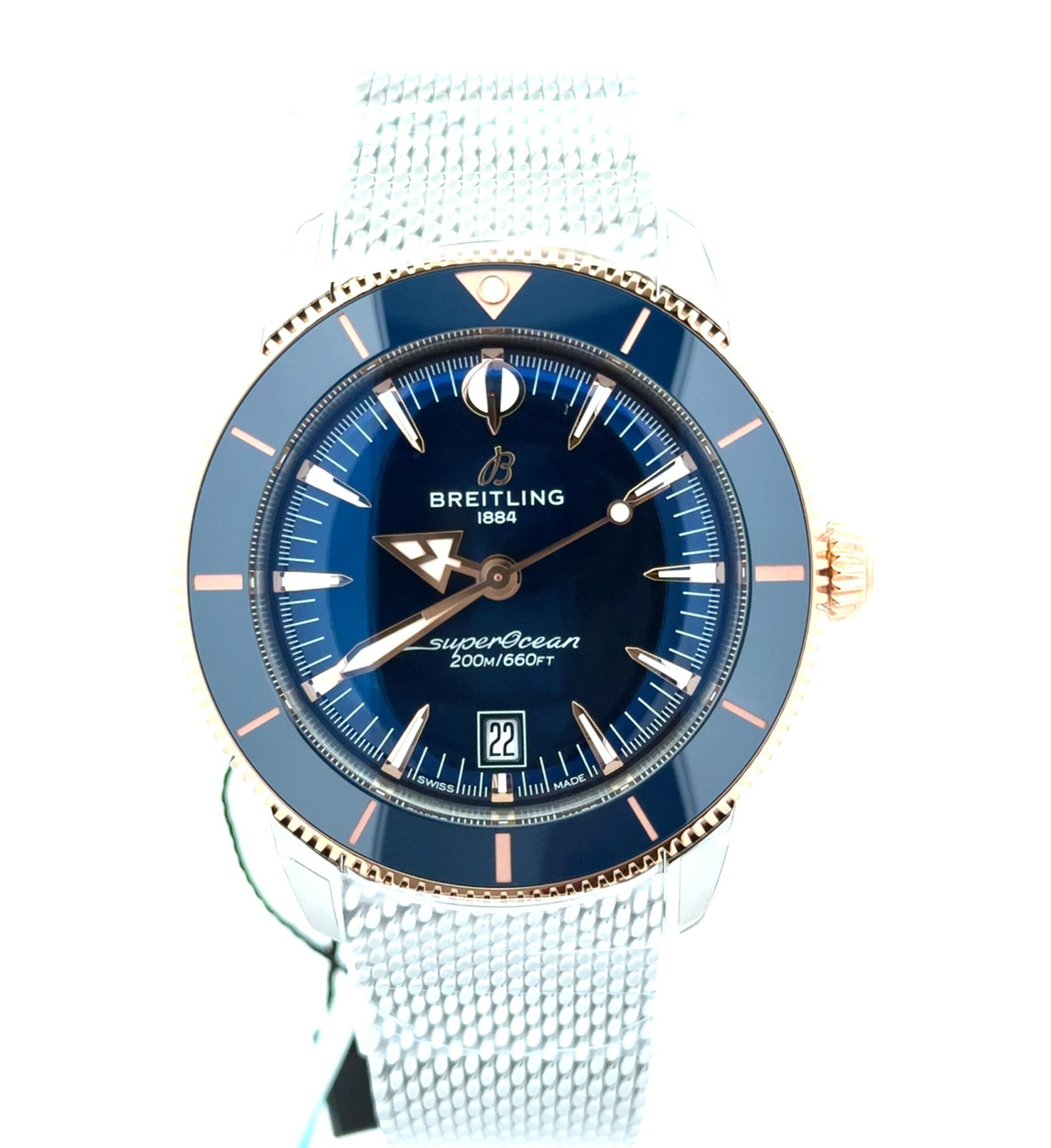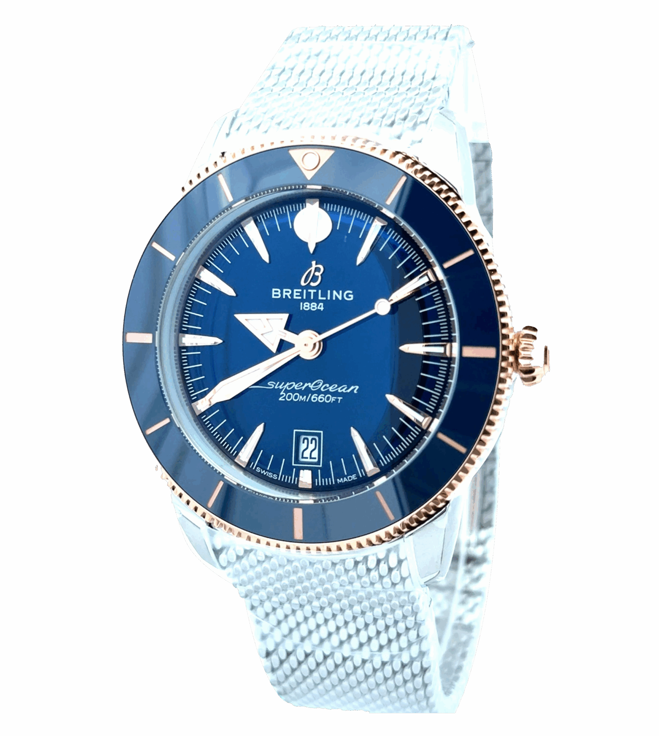 Breitling Superocean Heritage B31 Automatic 44 is the perfect blend of luxury and performance, a timepiece where heritage design meets modern innovation. Its striking two-tone construction in stainless steel and 18k rose gold creates a refined presence that commands attention. Secured with a durable steel and rubber strap and a folding clasp, it offers both elegance and confidence, even in the most demanding conditions. The bold blue dial serves as the centerpiece, enhanced by rose-gold hands and luminous index hour markers, while crisp white minute markers trace the outer rim for clarity and precision. At its core is the in-house Breitling Caliber B31, a COSC-certified automatic movement that delivers remarkable accuracy with an impressive 78-hour power reserve. Engineered for reliability, this 44 mm masterpiece features a screw-down crown, sapphire crystal with anti-reflective coating, and water resistance up to 200 meters. With its solid construction and exhibition case back, the Superocean Heritage B31 Automatic 44 offers a powerful balance of durability, sophistication, and timeless design.