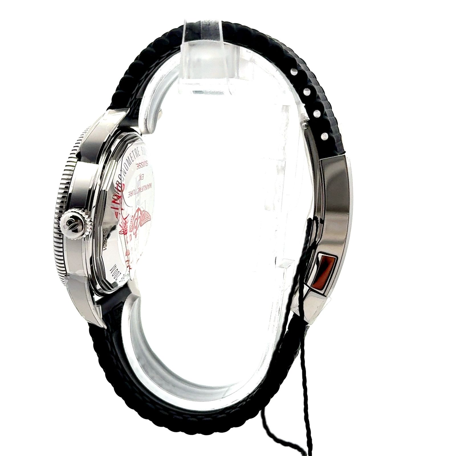 The Breitling Superocean Heritage II B20 42 — Ref. AB2010121B1S1 blends timeless dive-watch design with Breitling’s modern technical prowess. Encased in a robust 42 mm stainless steel case, it features a striking black “Volcano” dial with luminous silver-tone arrow hands and baton markers, framed by a unidirectional rotating bezel with a polished black ceramic insert—combining sporty grace and scratch-resistant durability. Powered by the in-house Caliber B20 (manufactured in collaboration with Tudor), this watch is a COSC-certified automatic movement with a ~70-hour power reserve, beating at 28,800 vph and using 26 jewels. Designed for serious wear, it offers 200 meters (660 ft) of water resistance, a screw-locked crown with two gaskets, a cambered sapphire crystal (glare-proofed on both sides), and a solid screwed case back.