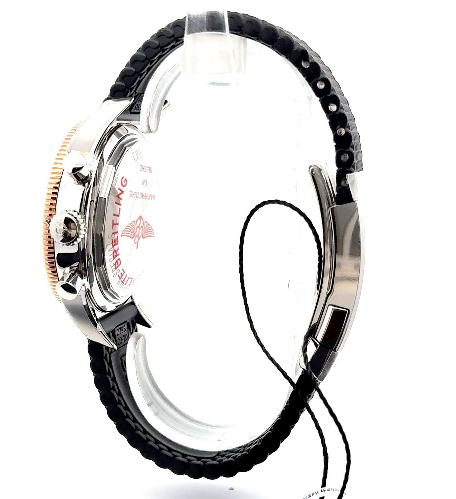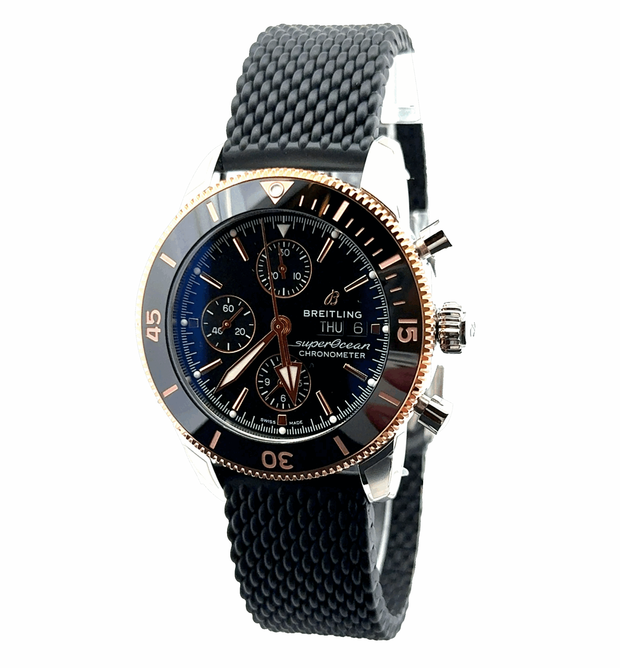 Breitling Superocean Heritage II Chronograph U13313121B1S1 is a striking blend of elegance and rugged functionality, tailor-made for those who demand performance and style. Crafted with a 44 mm two-tone case of polished stainless steel and solid 18k rose gold accents on the unidirectional rotating bezel, this piece projects luxury without compromising its sporting spirit. Its deep black dial features contrasting rose-gold plated indices and skeletonized hands, all filled with luminous material for visibility in low light. The dial layout is balanced and purposeful, boasting a 30-minute counter at 12 o’clock, a 12-hour counter at 6 o’clock, and a small seconds sub-dial at 9 o’clock. Day and date windows sit at 3 o’clock, adding everyday practicality without disrupting the polished aesthetic. The Chronograph is fitted with a black Aero classic rubber strap that complements the dial, secured with a folding deployment clasp for comfort and security. At around 15.65 mm in thickness, it makes a bold wrist presence while the mixture of rose gold and black tones give it versatility—equally fitting at the beach or the boardroom.