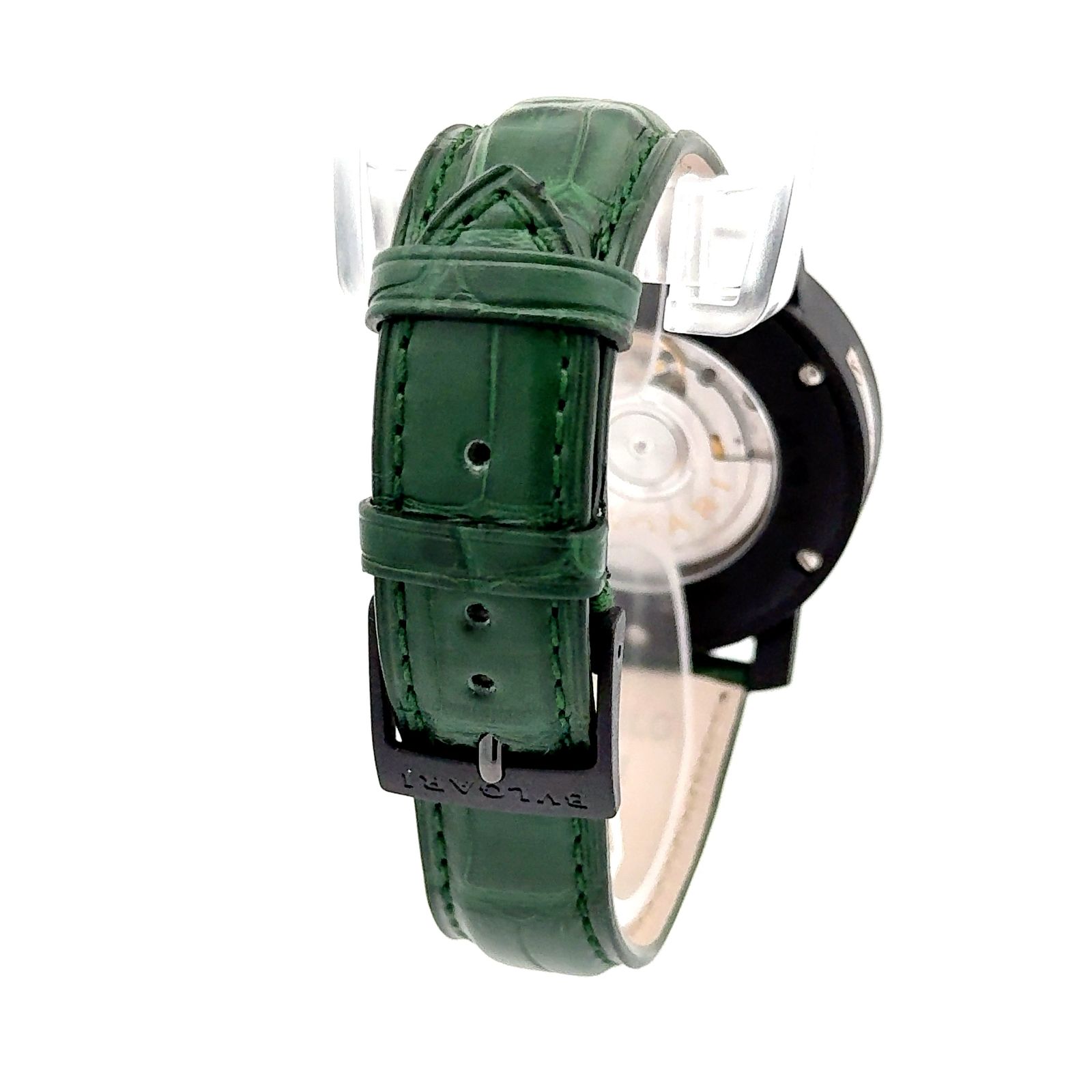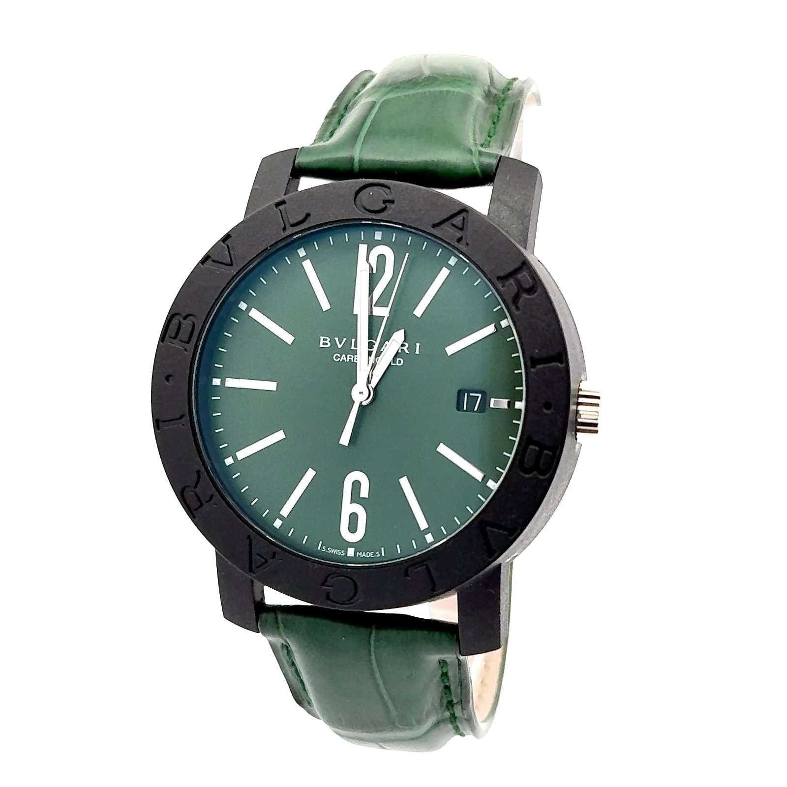 Bulgari Carbongold Via Condotti, reference number BB40CL, is a bold and distinctive automatic timepiece that reflects Bulgari’s signature blend of heritage and innovation. Featuring a lightweight 40 mm carbon case with a matching carbon bezel, this watch is powered by a precise automatic movement with 21 jewels and a 42-hour power reserve. The rich green dial is enhanced with Arabic numerals and includes a practical date function, all protected under a durable sapphire crystal. Water-resistant to 3 ATM, the watch pairs effortlessly with a green leather strap secured by a classic steel buckle, offering both comfort and style. A unique expression of Italian design, the Carbongold Via Condotti is a modern tribute to Bulgari's Roman roots and craftsmanship.