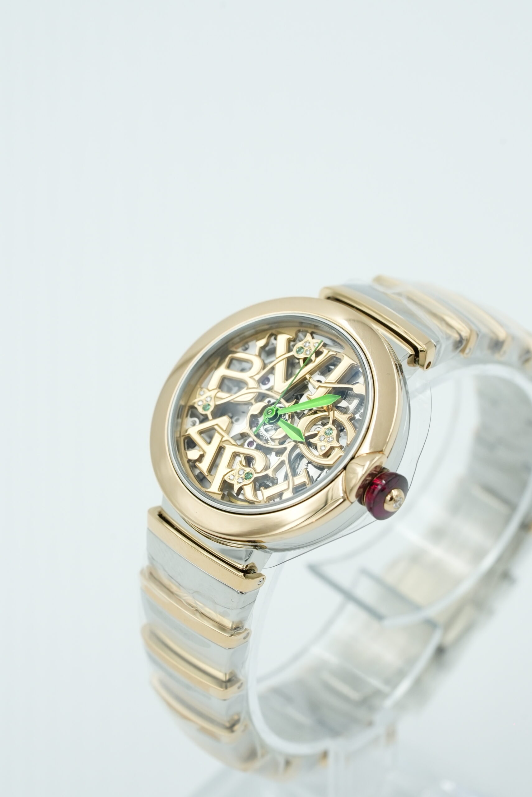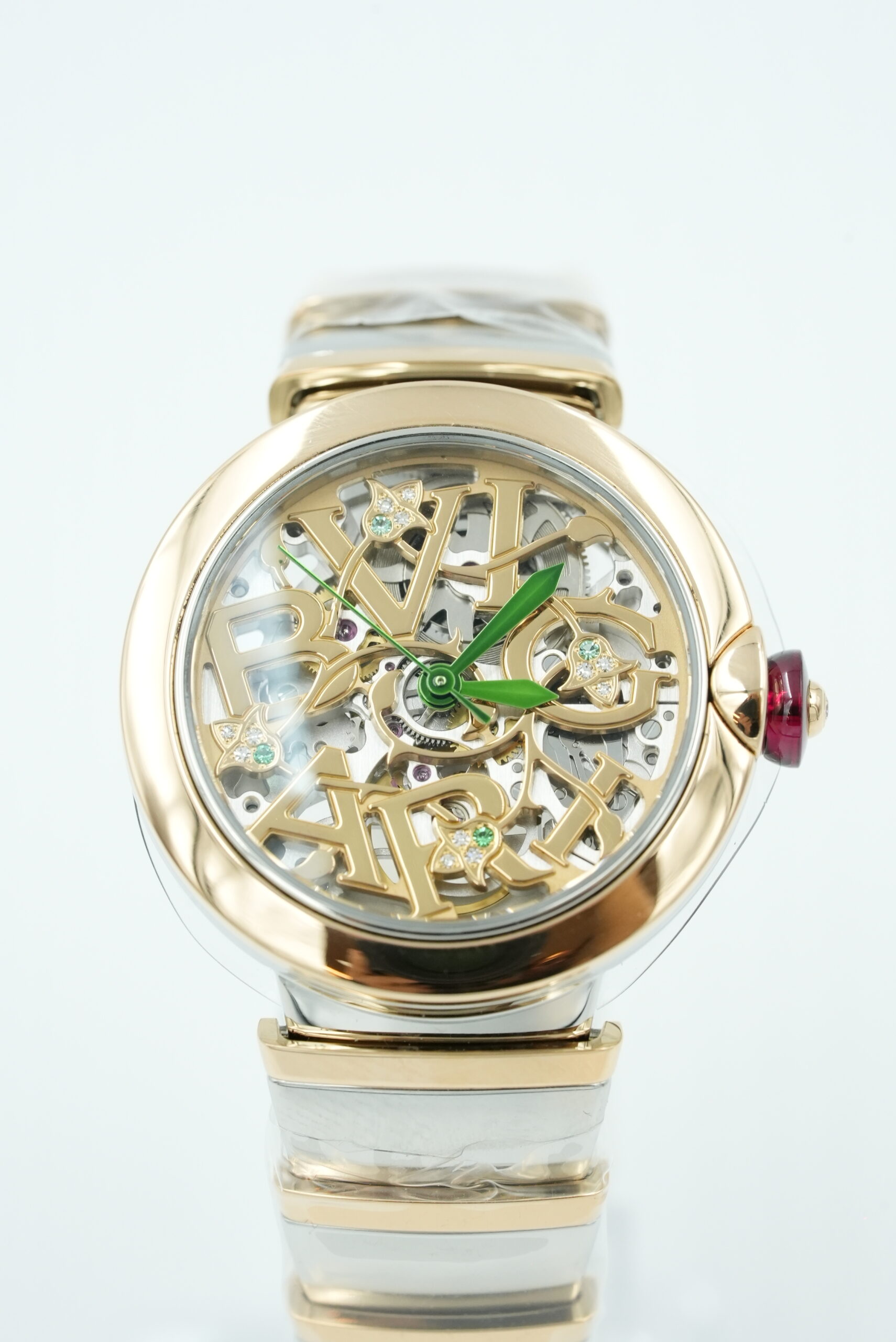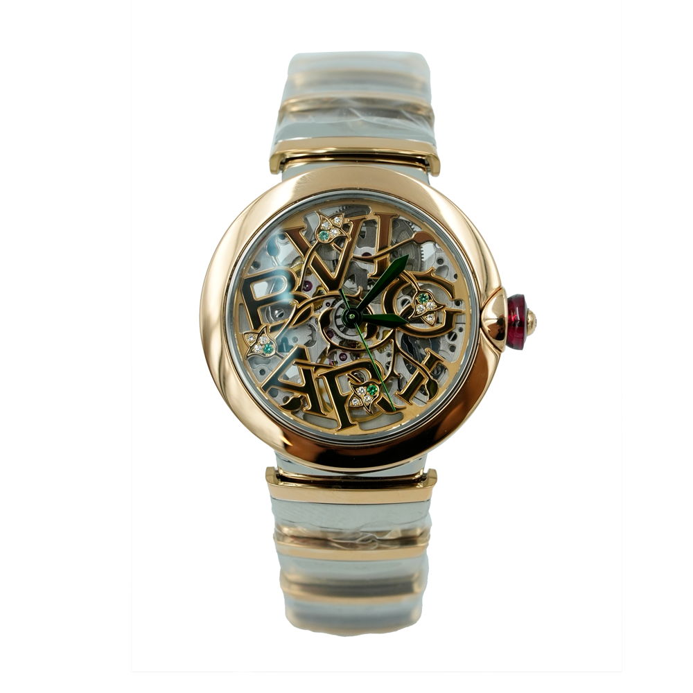 Bulgari 103028 LVCEA Skeleton is a masterpiece of horology that seamlessly blends high-end jewelry design with expert Swiss craftsmanship. Encased in a 33mm 18k rose gold case, the watch exudes elegance and refinement, while its skeletonized dial offers a mesmerizing view of the intricate inner workings. A standout feature of this timepiece is the open-worked dial, which incorporates the "BVLGARI" name in gold-tone letters, each adorned with sparkling diamonds and green gemstones, adding a luxurious touch. The polished rose gold bezel complements the design, while the crown is adorned with Bulgari’s signature cabochon-cut pink rubellite gemstone, further enhancing its opulent appeal. The green lacquered hands provide a striking contrast, ensuring readability against the artistic dial. This stunning timepiece is powered by the Bulgari BVL 191 automatic movement, offering a 42-hour power reserve and ensuring precision. The bracelet, crafted from a combination of 18k rose gold and stainless steel, features a flexible, articulated design for a comfortable fit. With 50 meters of water resistance, this watch combines beauty with functionality, making it a perfect statement piece for those who appreciate luxury and technical brilliance.