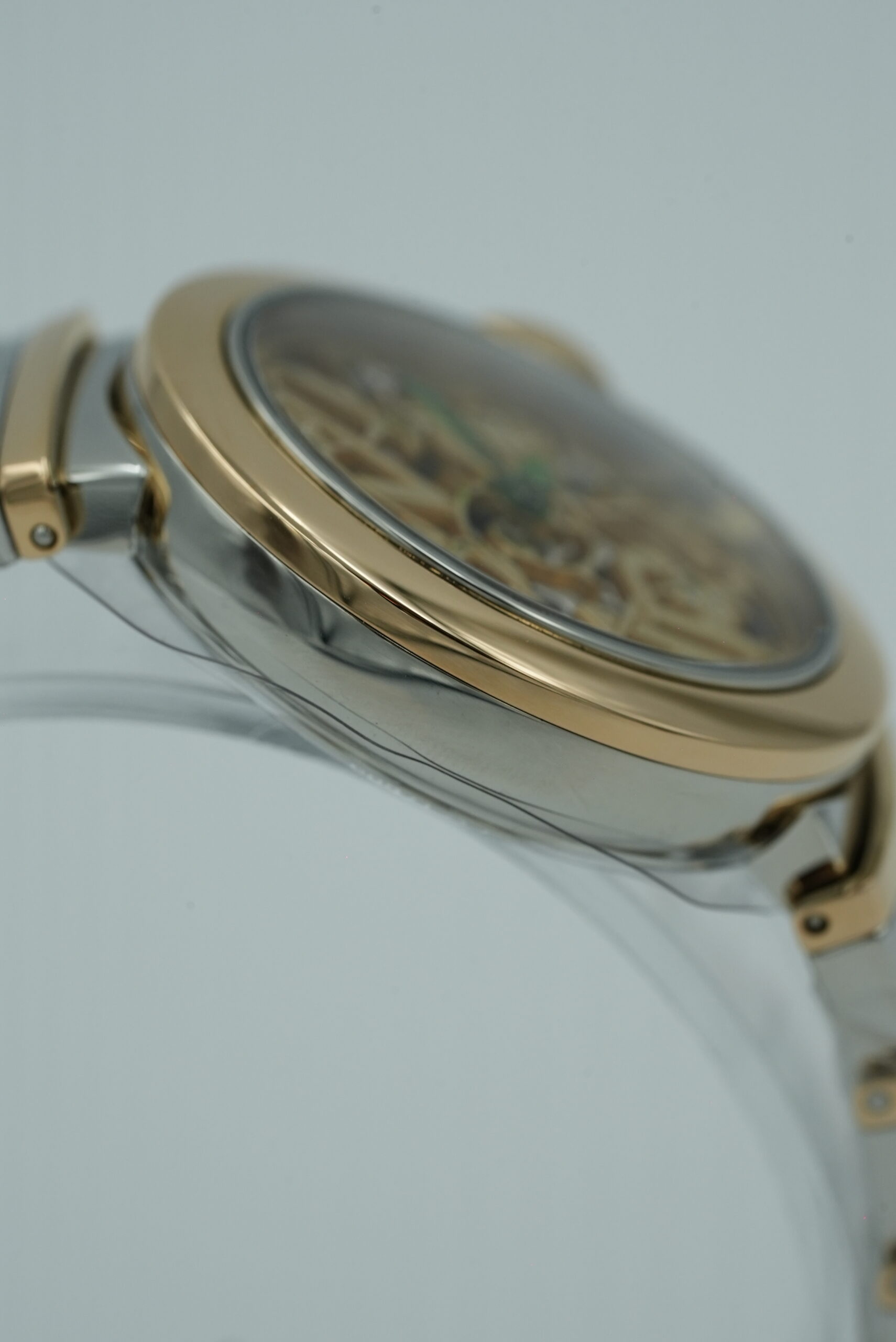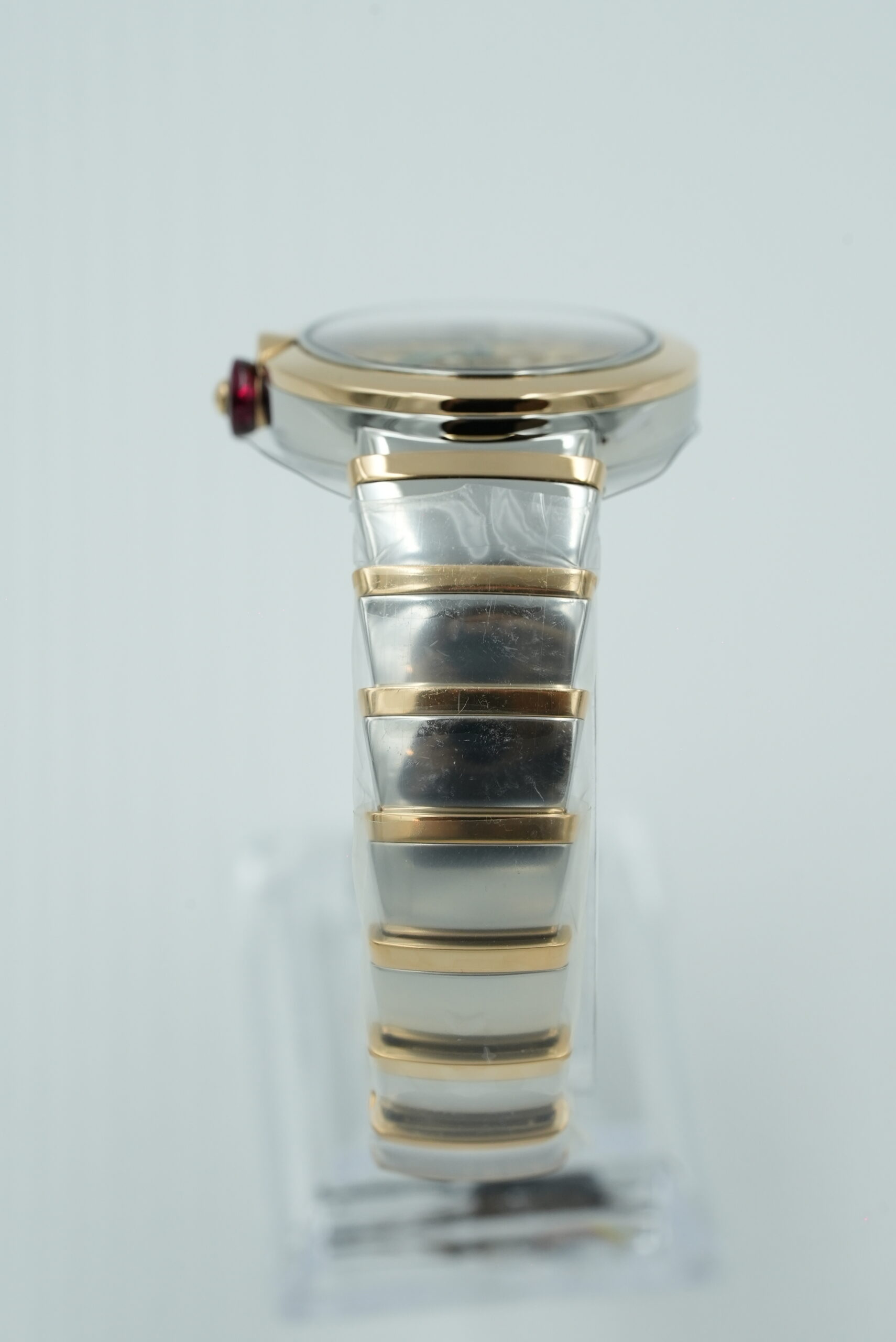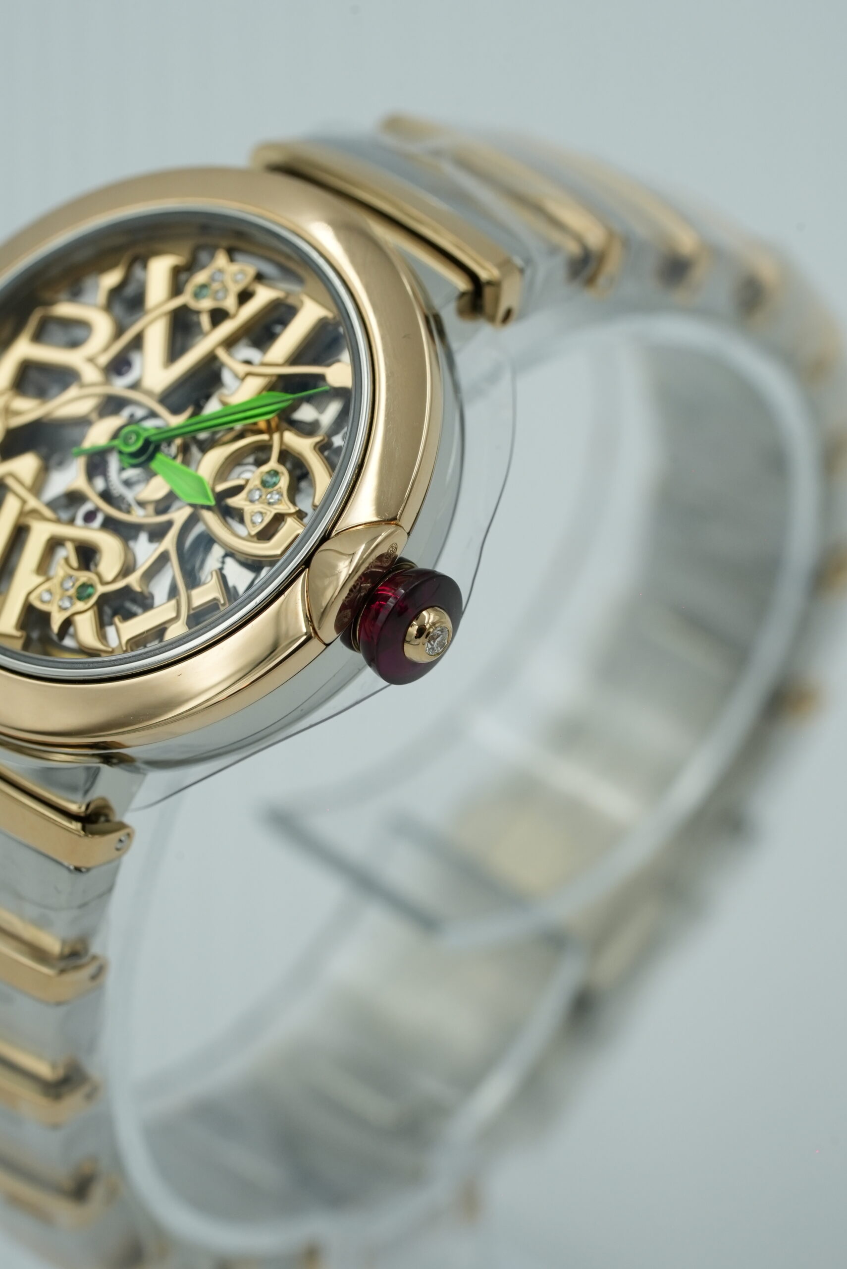 Bulgari 103028 LVCEA Skeleton is a masterpiece of horology that seamlessly blends high-end jewelry design with expert Swiss craftsmanship. Encased in a 33mm 18k rose gold case, the watch exudes elegance and refinement, while its skeletonized dial offers a mesmerizing view of the intricate inner workings. A standout feature of this timepiece is the open-worked dial, which incorporates the "BVLGARI" name in gold-tone letters, each adorned with sparkling diamonds and green gemstones, adding a luxurious touch. The polished rose gold bezel complements the design, while the crown is adorned with Bulgari’s signature cabochon-cut pink rubellite gemstone, further enhancing its opulent appeal. The green lacquered hands provide a striking contrast, ensuring readability against the artistic dial. This stunning timepiece is powered by the Bulgari BVL 191 automatic movement, offering a 42-hour power reserve and ensuring precision. The bracelet, crafted from a combination of 18k rose gold and stainless steel, features a flexible, articulated design for a comfortable fit. With 50 meters of water resistance, this watch combines beauty with functionality, making it a perfect statement piece for those who appreciate luxury and technical brilliance.