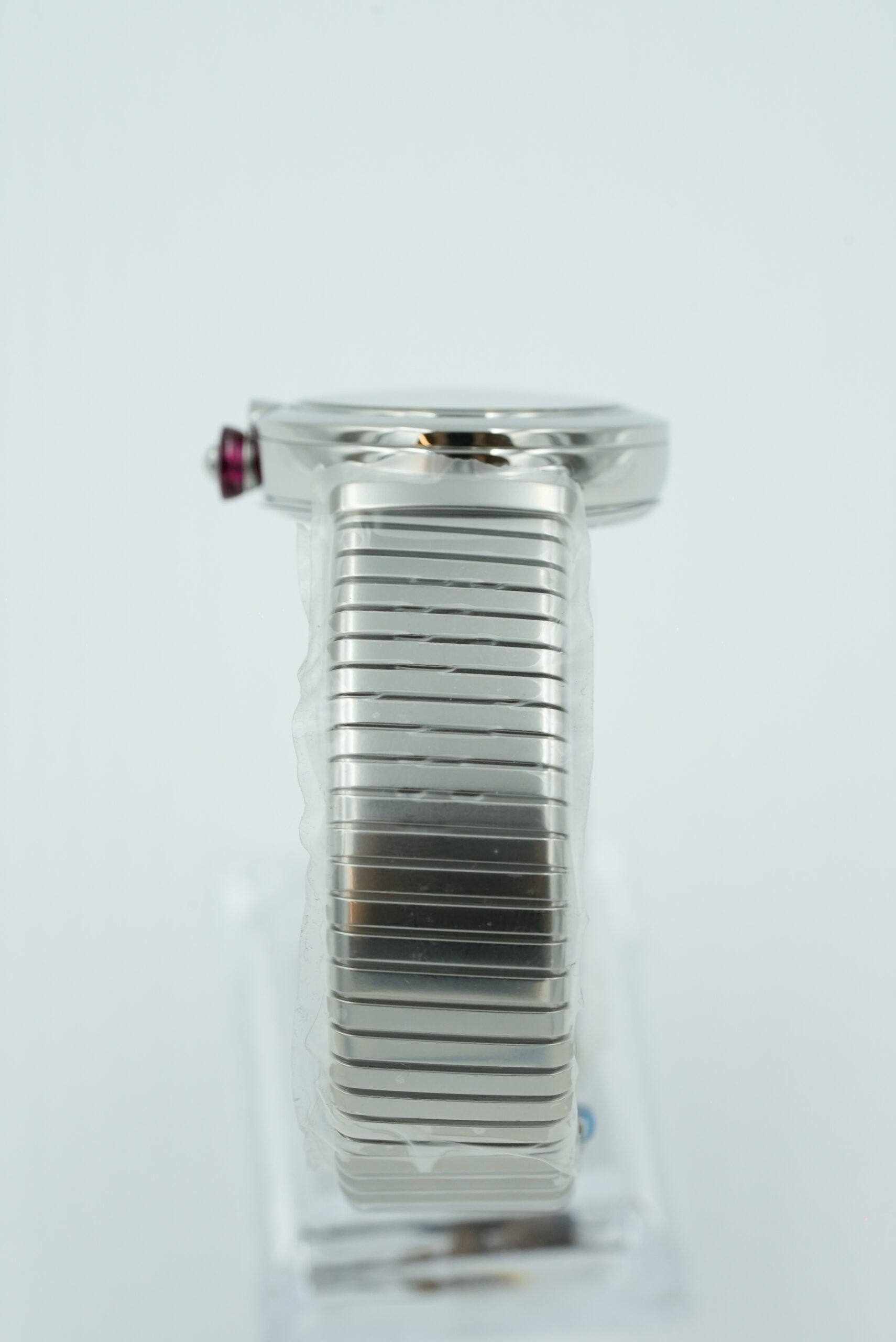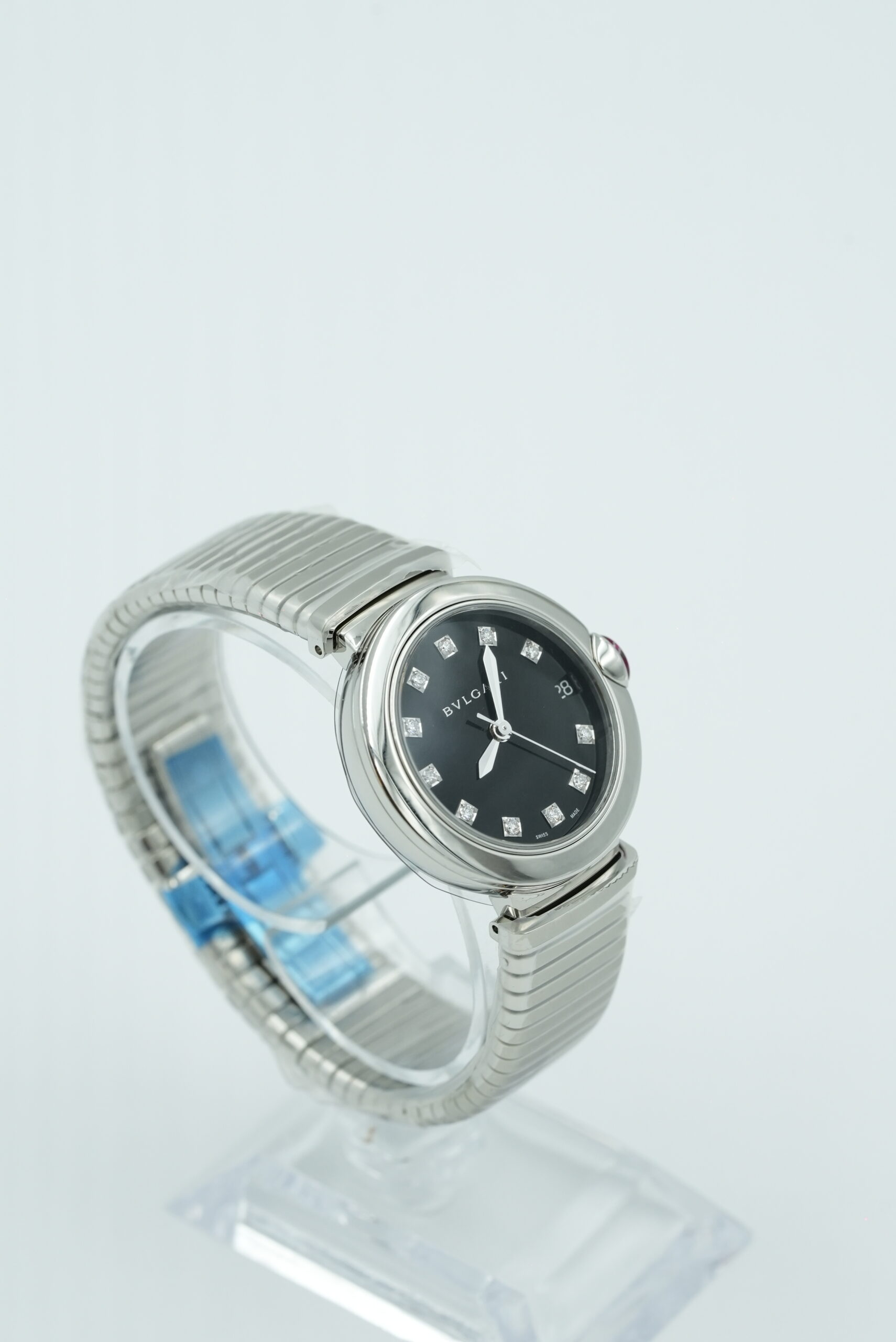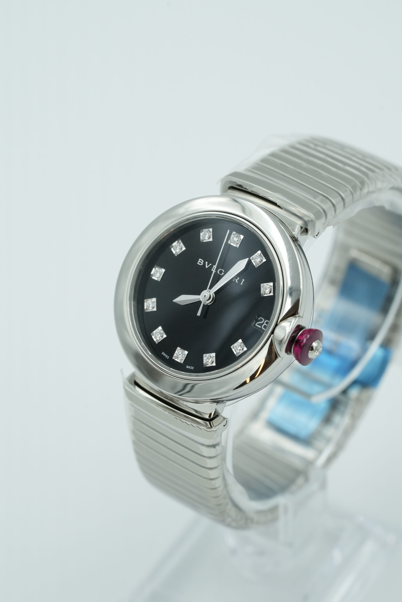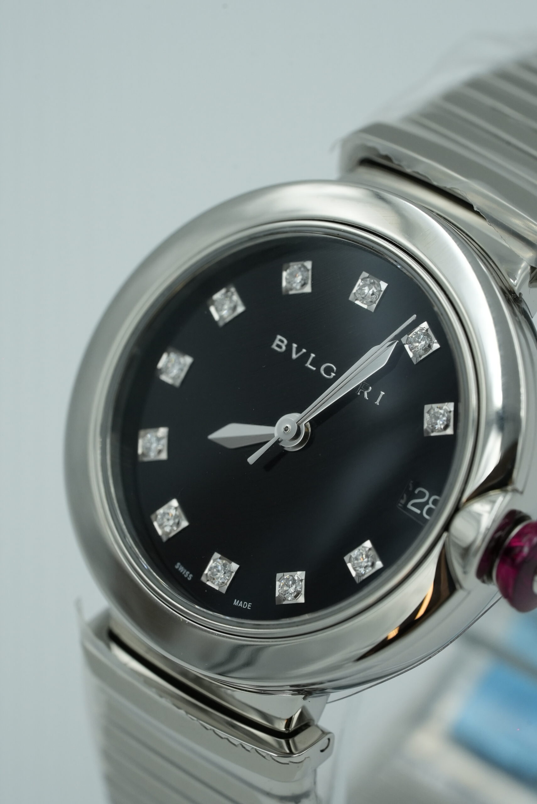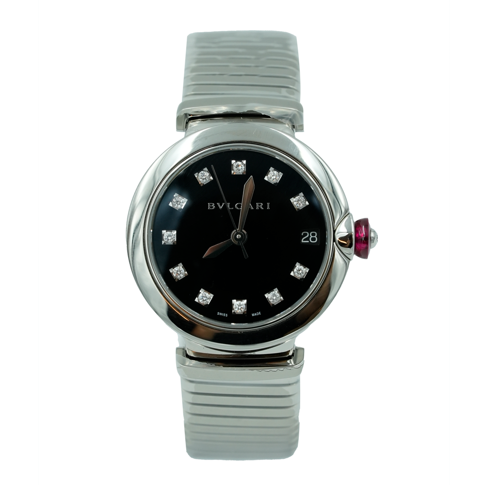 Bulgari 102953 Lucea watch is a refined and elegant timepiece, combining the brand’s luxurious aesthetic with precise Swiss craftsmanship. This model features a 33mm stainless steel case, offering a sleek and polished look. The striking black lacquered dial enhances the watch’s bold character, adorned with 12 brilliant-cut diamond hour markers that add a touch of opulence. The date display at 3 o’clock provides practical functionality without disrupting the watch’s symmetry. The signature pink cabochon-cut gemstone on the crown, a hallmark of the Lucea collection, adds a distinctive feminine touch. The watch is paired with a flexible stainless steel bracelet, designed for comfort and sophistication. Powered by a Swiss automatic movement, the Bulgari 102953 Lucea is a statement of timeless elegance, perfect for women who appreciate both style and performance.