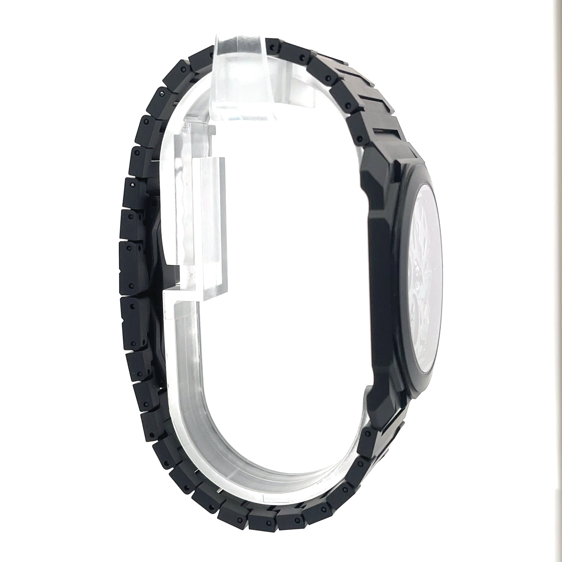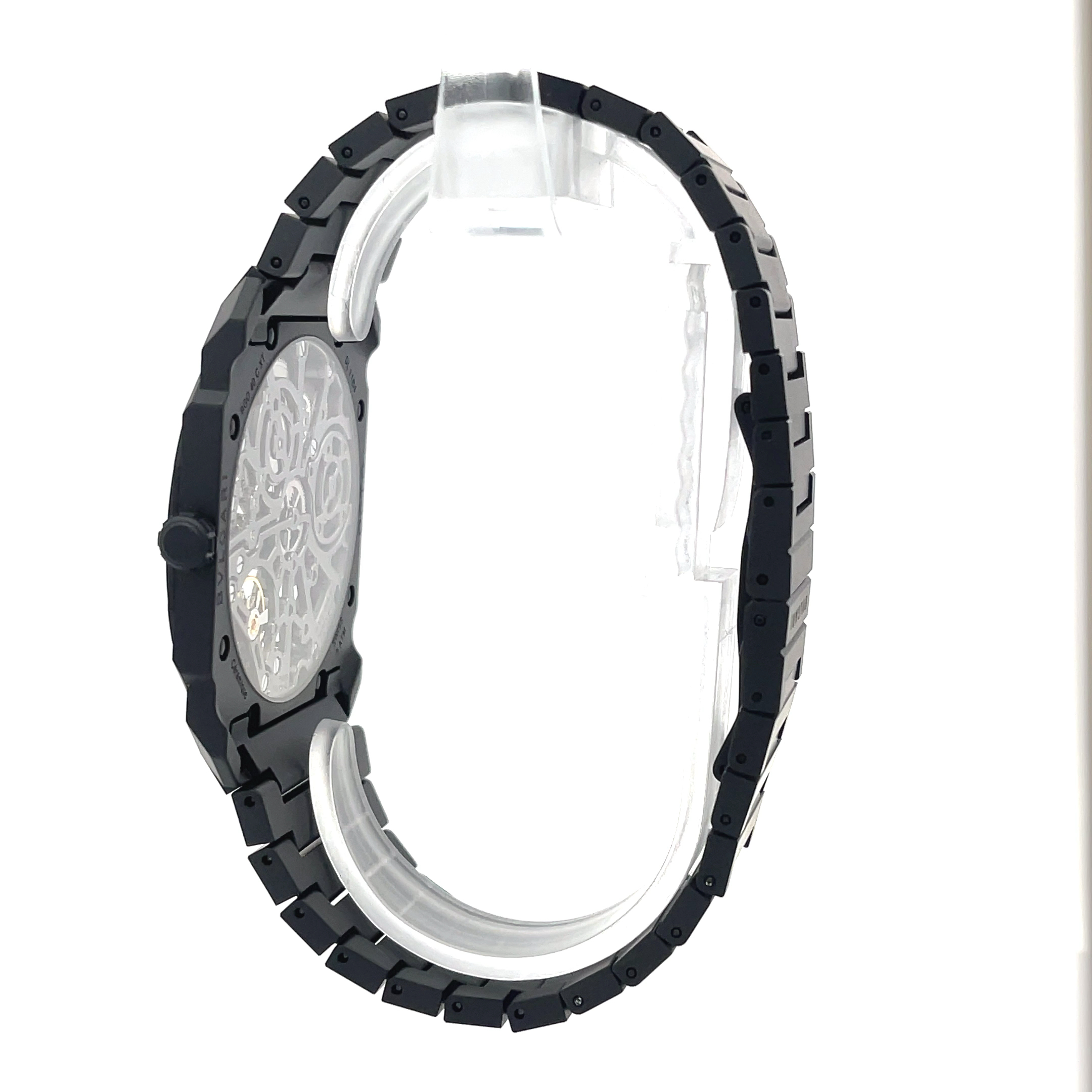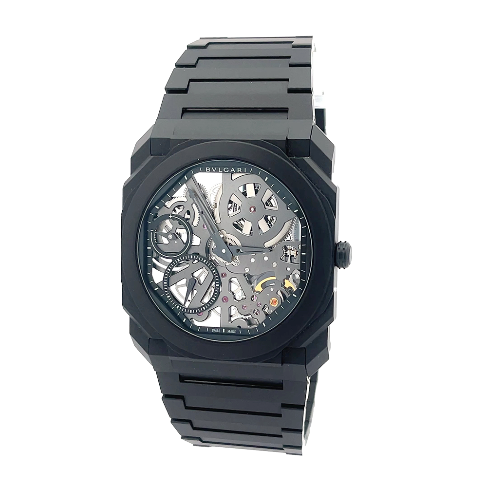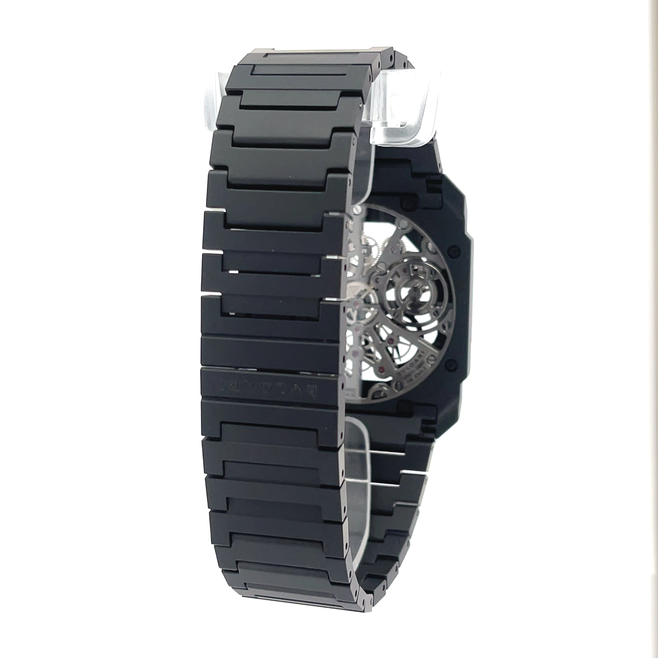 Octo Finissimo Skeleton watch in black ceramic with extra-thin skeletonized mechanical manufacture movement, manual winding, small seconds and power reserve indication. Water-resistant up to 30 meters.