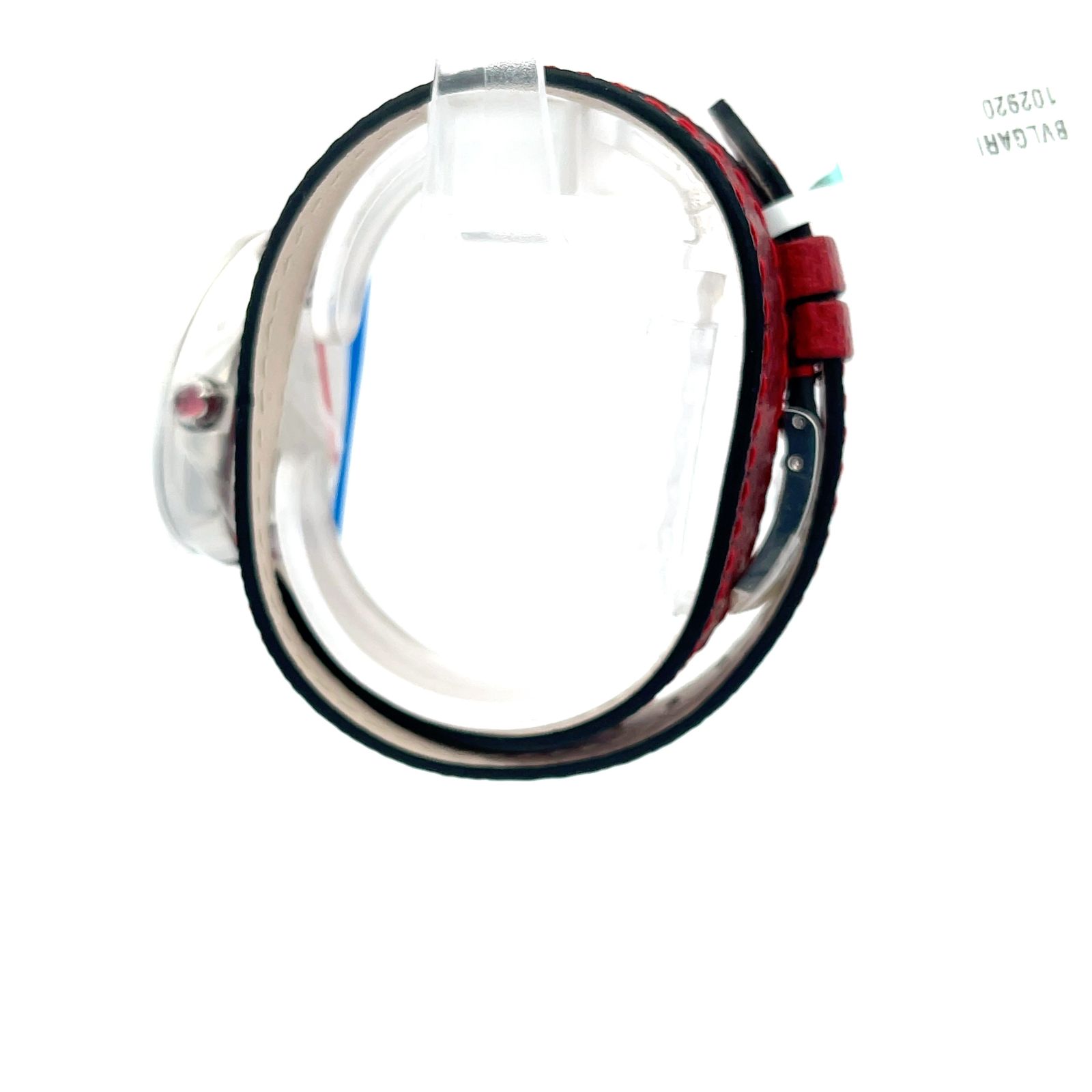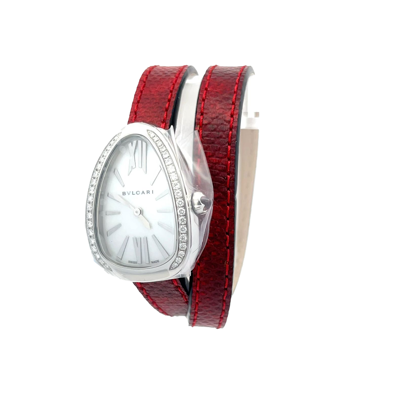 Bulgari Serpenti Seduttori 103129 is an exquisite timepiece that embodies the brand’s mastery of elegance and craftsmanship. Designed as a modern reinterpretation of the iconic Serpenti collection, this watch features a distinctive teardrop-shaped 18k rose gold case measuring 22mm, evoking the sensual curves of a serpent’s head. The diamond-pavé dial glistens with brilliance, accentuating the luxurious aesthetic, while a diamond-set bezel further enhances its opulent charm. The timepiece is equipped with a quartz movement, ensuring precision and reliability while maintaining a slim profile. The red alligator leather strap, complemented by an 18k rose gold buckle, wraps elegantly around the wrist, offering a comfortable yet sophisticated fit. A signature cabochon-cut pink rubellite adorns the crown, adding a final touch of glamour and reinforcing Bulgari’s heritage of bold, jewelry-inspired watchmaking. The Bulgari Serpenti Seduttori 103129 is a true statement of luxury, perfect for those who appreciate refined craftsmanship and timeless design.
