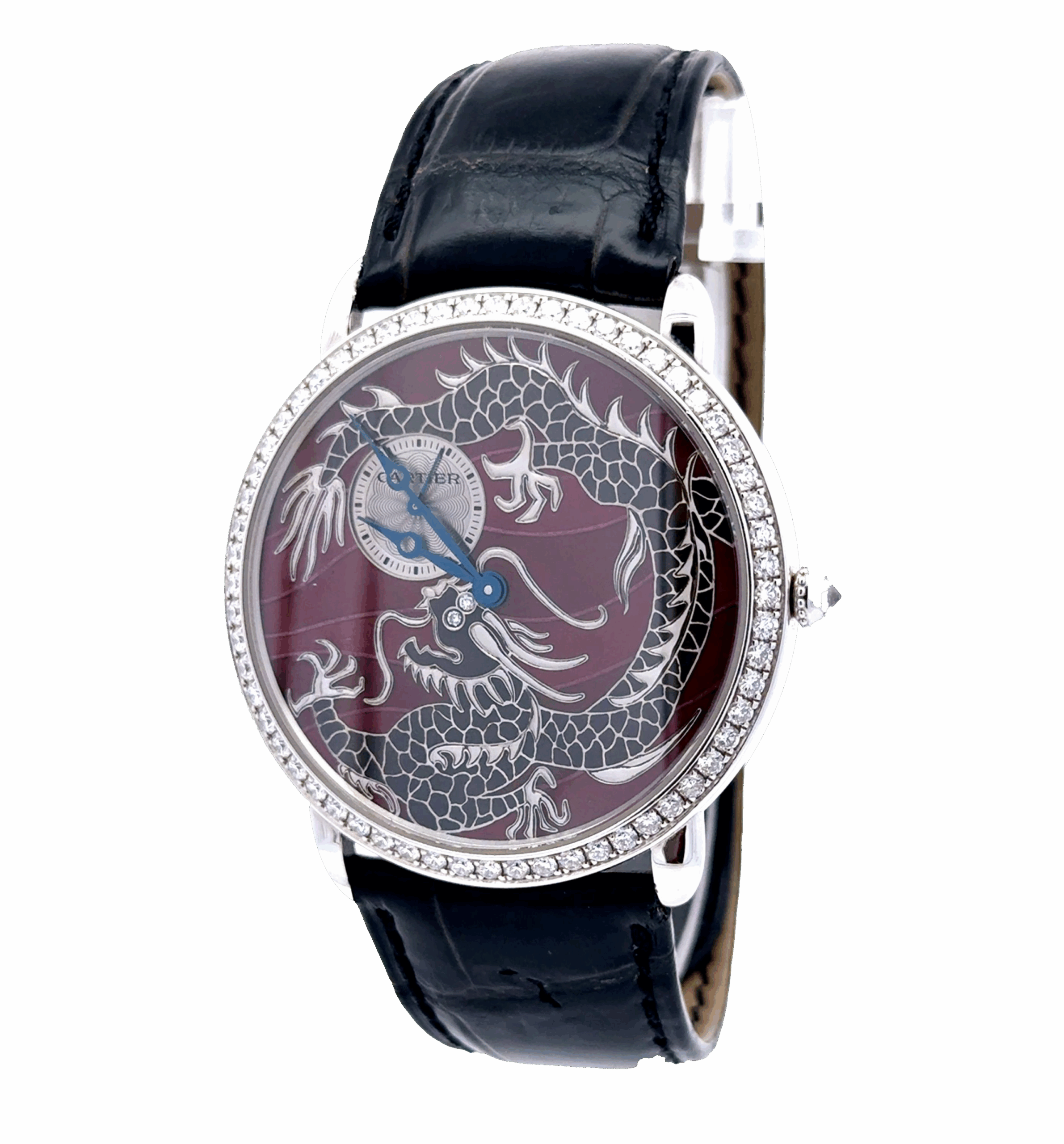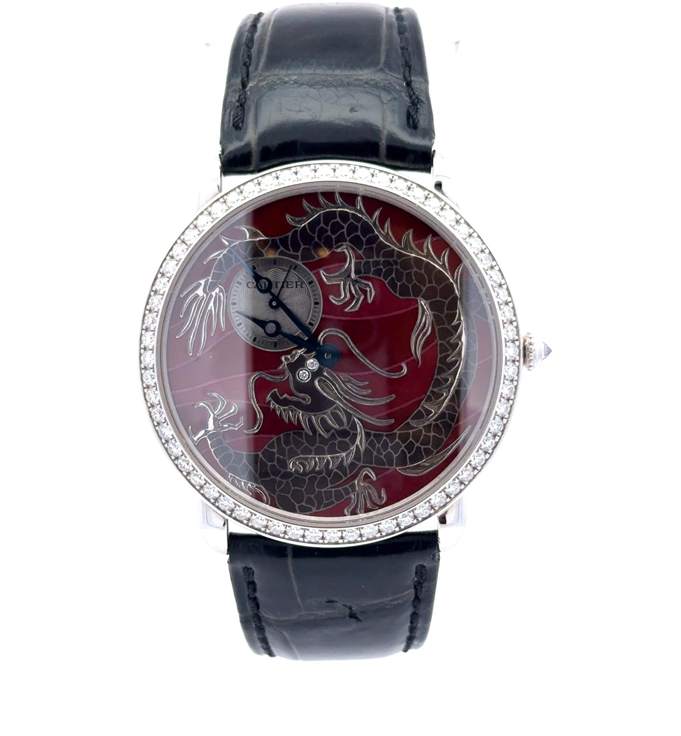 Cartier Ronde Louis Cartier Ref. WR000251 is a graceful embodiment of timeless elegance and refined craftsmanship. Encased in 29mm of 18k white gold, this ladies’ timepiece features a diamond-set bezel that adds a delicate shimmer to its classic round silhouette. Powered by the Cartier Calibre 690 quartz movement, the WR000251 offers precise timekeeping while maintaining a slim profile. Its scratch-resistant sapphire crystal and case back ensure durability, while the 30-meter water resistance provides everyday practicality. The watch is paired with a rich black leather strap, secured by an 18k white gold deployant clasp for comfort and elegance.