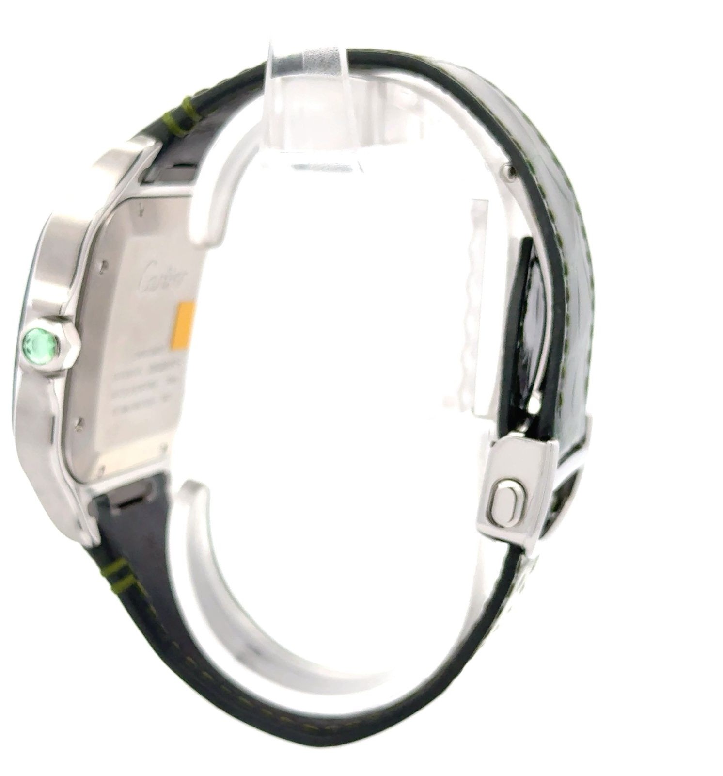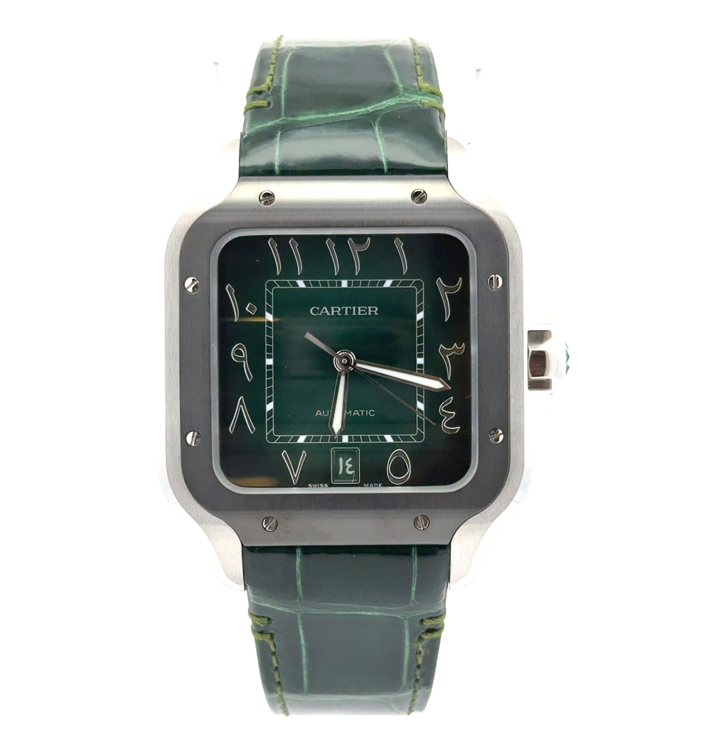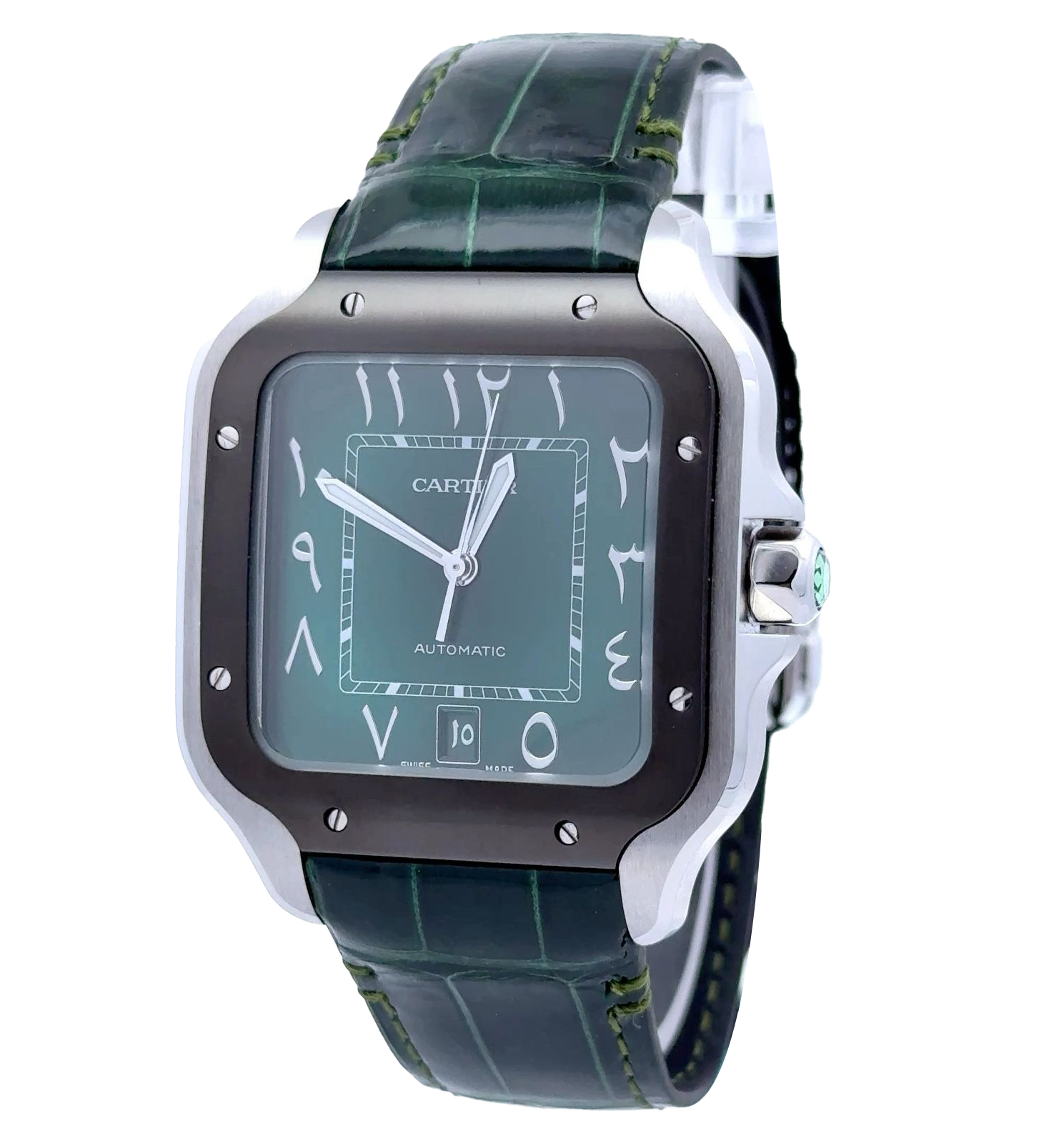 Cartier Santos de Cartier Ref. WSSA0055 is a striking fusion of heritage and modernity, crafted for those who appreciate bold elegance with cultural nuance. This large model features a robust stainless steel case with an ADLC-coated bezel, lending it a sleek, contemporary edge while enhancing durability. At its heart beats the automatic 1847 MC caliber, a testament to Cartier’s commitment to precision and refinement. The dial is a captivating green, adorned with Hindu-Arabic numerals that pay homage to regional aesthetics, complemented by luminescent steel sword-shaped hands for optimal legibility. A green faceted synthetic spinel set into the crown adds a subtle touch of luxury. Measuring 39.8 mm in width, it wears comfortably while maintaining a strong wrist presence. With water resistance up to 100 meters and a scratch-resistant sapphire crystal, the WSSA0055 is as practical as it is stylish. It’s not merely a timepiece—it’s a statement of individuality, cultural sophistication, and Cartier’s enduring legacy of craftsmanship