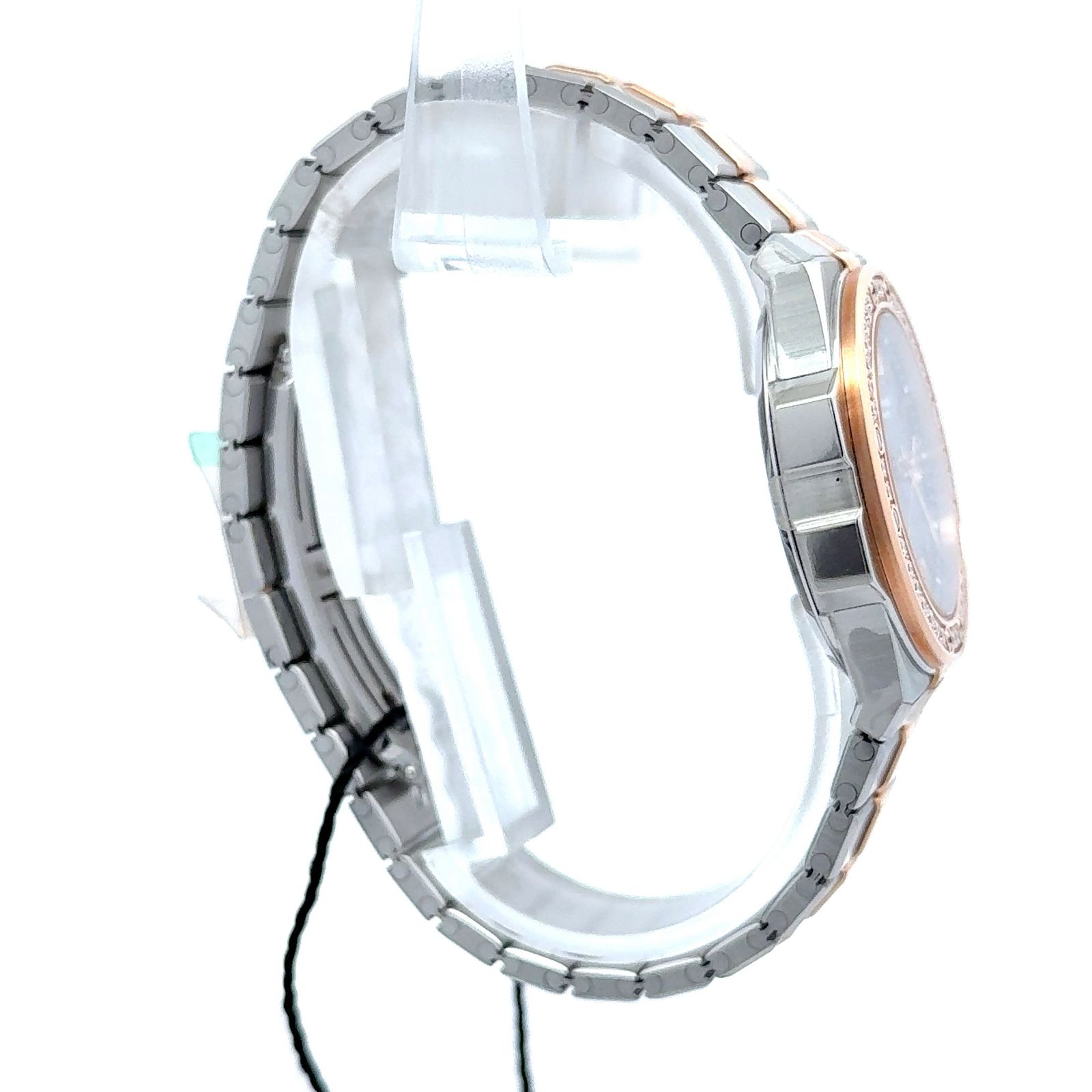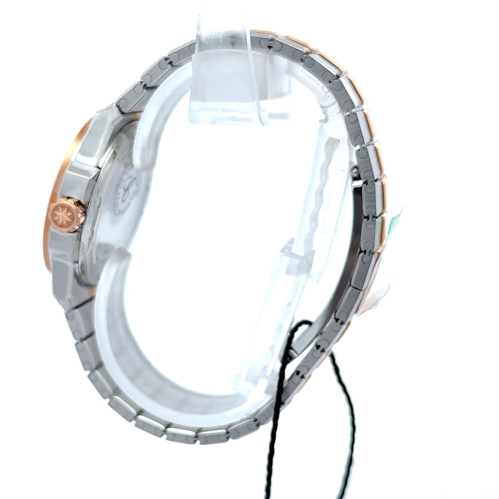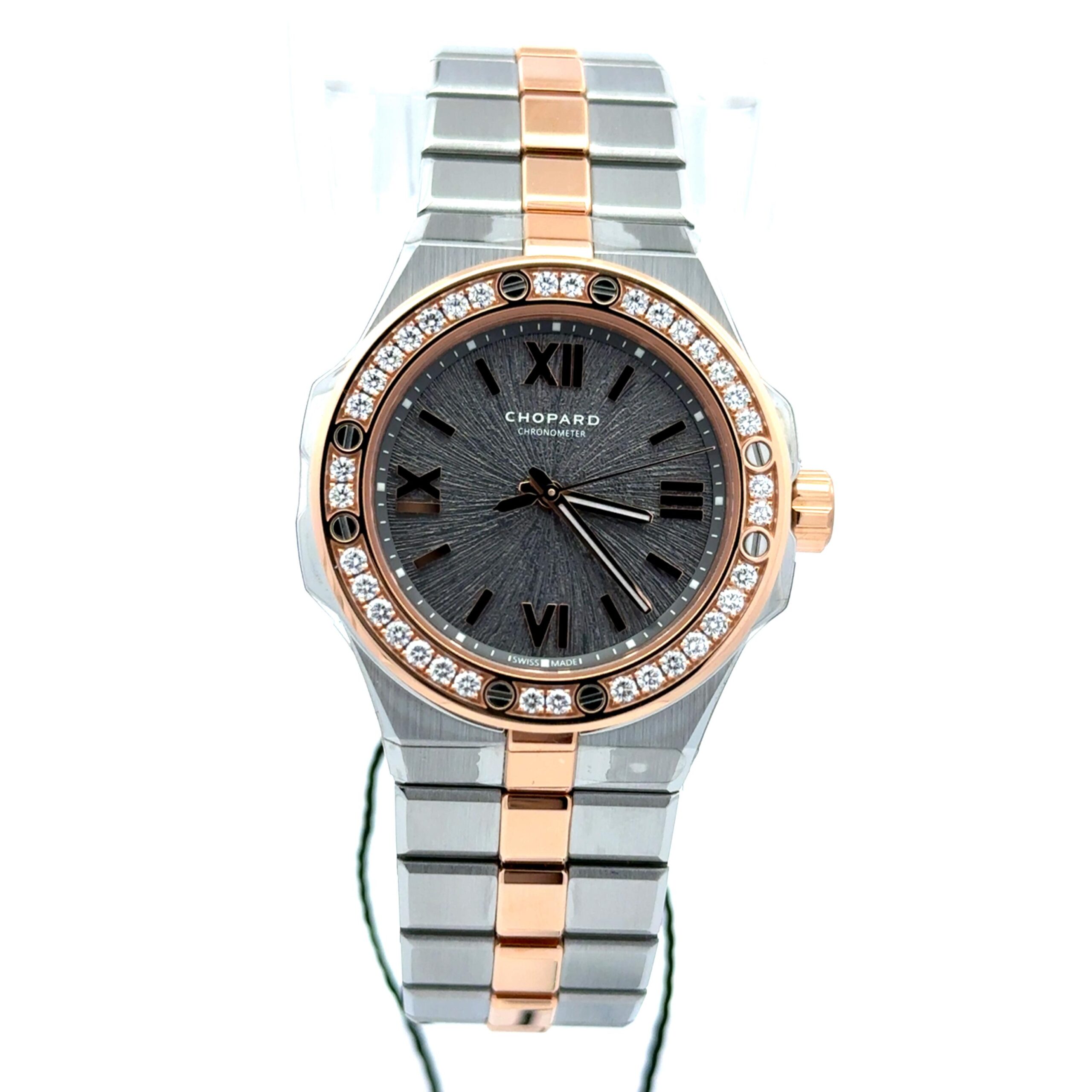 Chopard Alpine Eagle 298617-6002 is a refined blend of sporty elegance and luxurious craftsmanship. Featuring a 33mm stainless steel case, it is distinguished by a diamond-set bezel that adds a touch of brilliance to its robust design. The textured grey dial, inspired by the patterns of an eagle’s iris, showcases applied rose gold Roman numerals and hour markers with luminescent accents for optimal legibility. Powered by a chronometer-certified automatic movement, it ensures precision and reliability, with a transparent caseback offering a glimpse of the finely finished mechanics. The integrated two-tone bracelet in steel and rose gold enhances its contemporary appeal, while maintaining exceptional comfort on the wrist. Elegant yet versatile, the Chopard Alpine Eagle 298617-6002 is a timepiece that perfectly balances modern sportiness with timeless luxury.