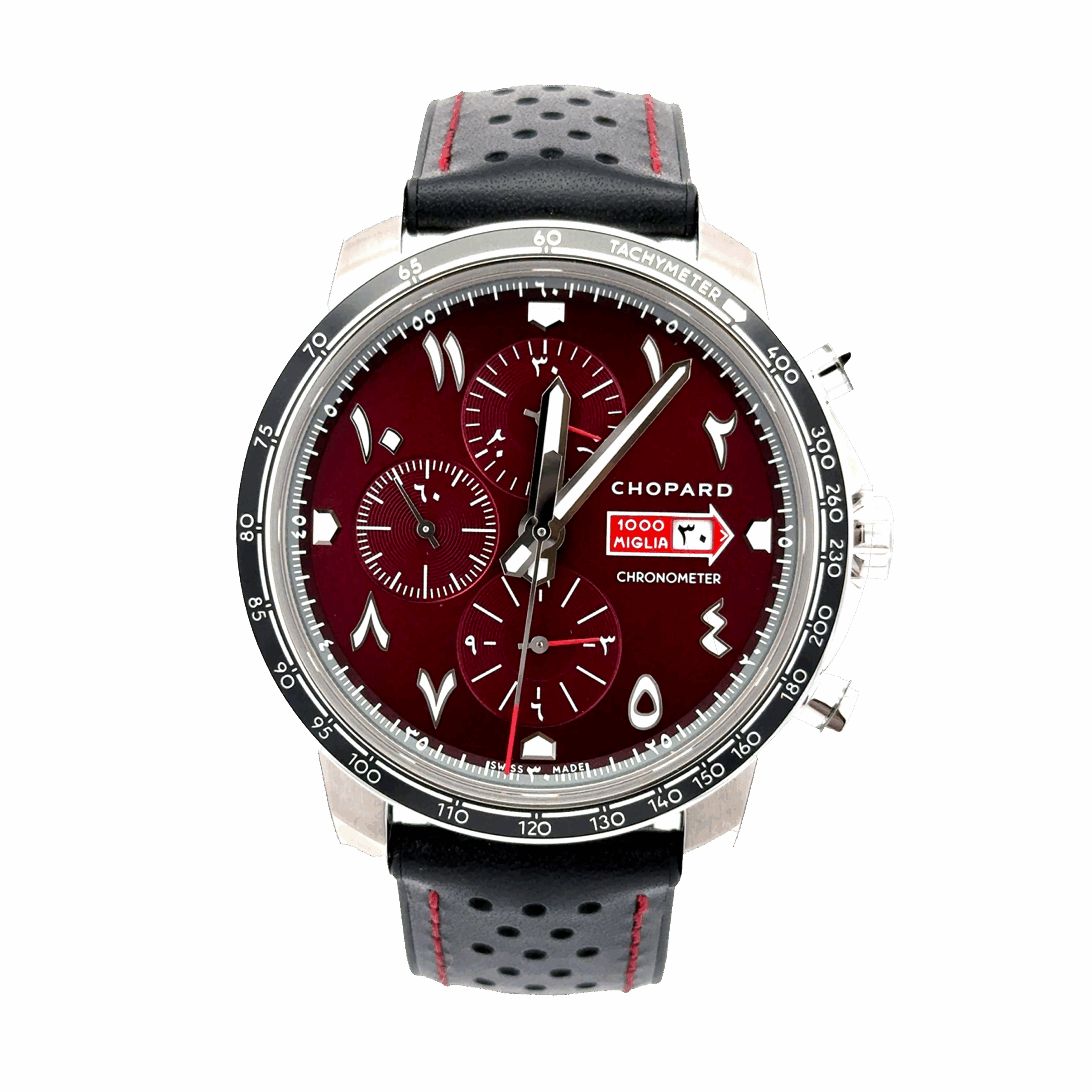 Chopard Mille Miglia GTS Al Fardan Edition is an exclusive timepiece created in collaboration with Al Fardan Jewellery, limited to just 50 pieces worldwide. Crafted from stainless steel. Its striking burgundy dial is adorned with Indo-Arabic numerals, adding a distinctive regional touch while maintaining the sporty elegance of the Mille Miglia collection. Equipped with a chronometer-certified automatic chronograph movement, it features three subdials for 60 seconds, 30 minutes, and 12 hours, along with a tachymeter scale on the bezel for precise speed measurement. The caseback is engraved with “Alfardan Exclusive” alongside the Mille Miglia logo and individual edition number, underlining its rarity. Celebrating Chopard’s long-standing role as official timekeeper of the legendary Mille Miglia race, this special edition blends Swiss precision, motorsport heritage, and regional exclusivity into a truly collectible chronograph.