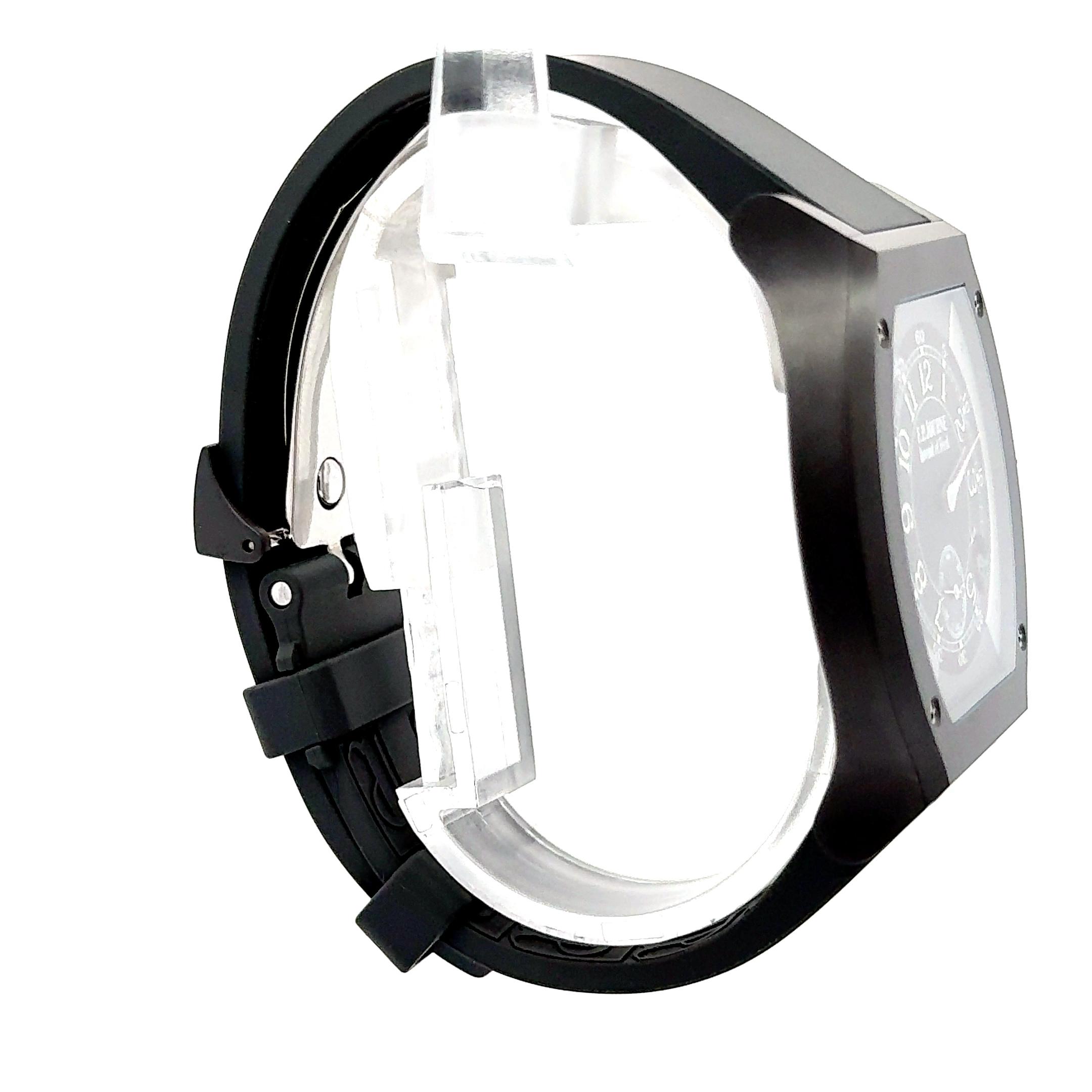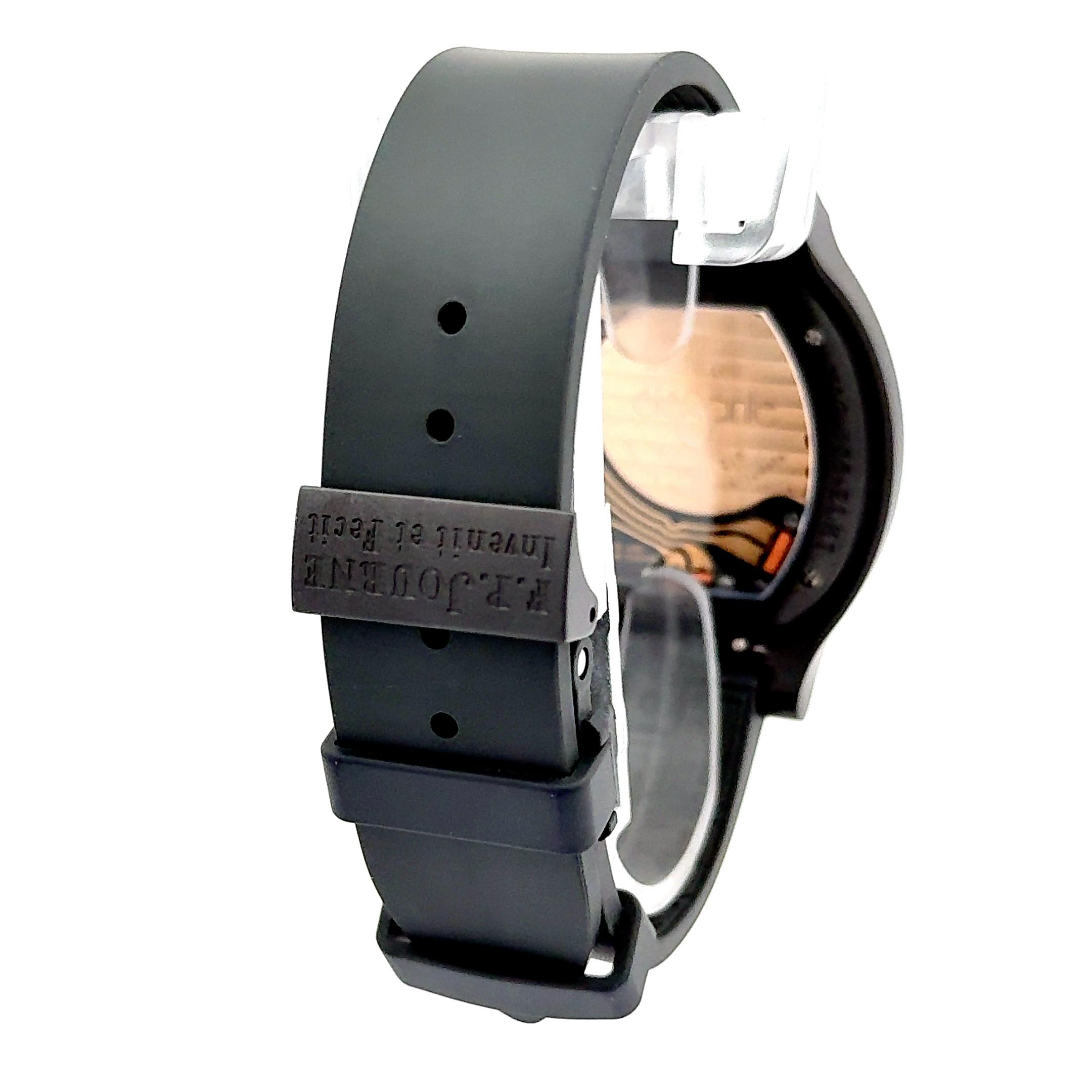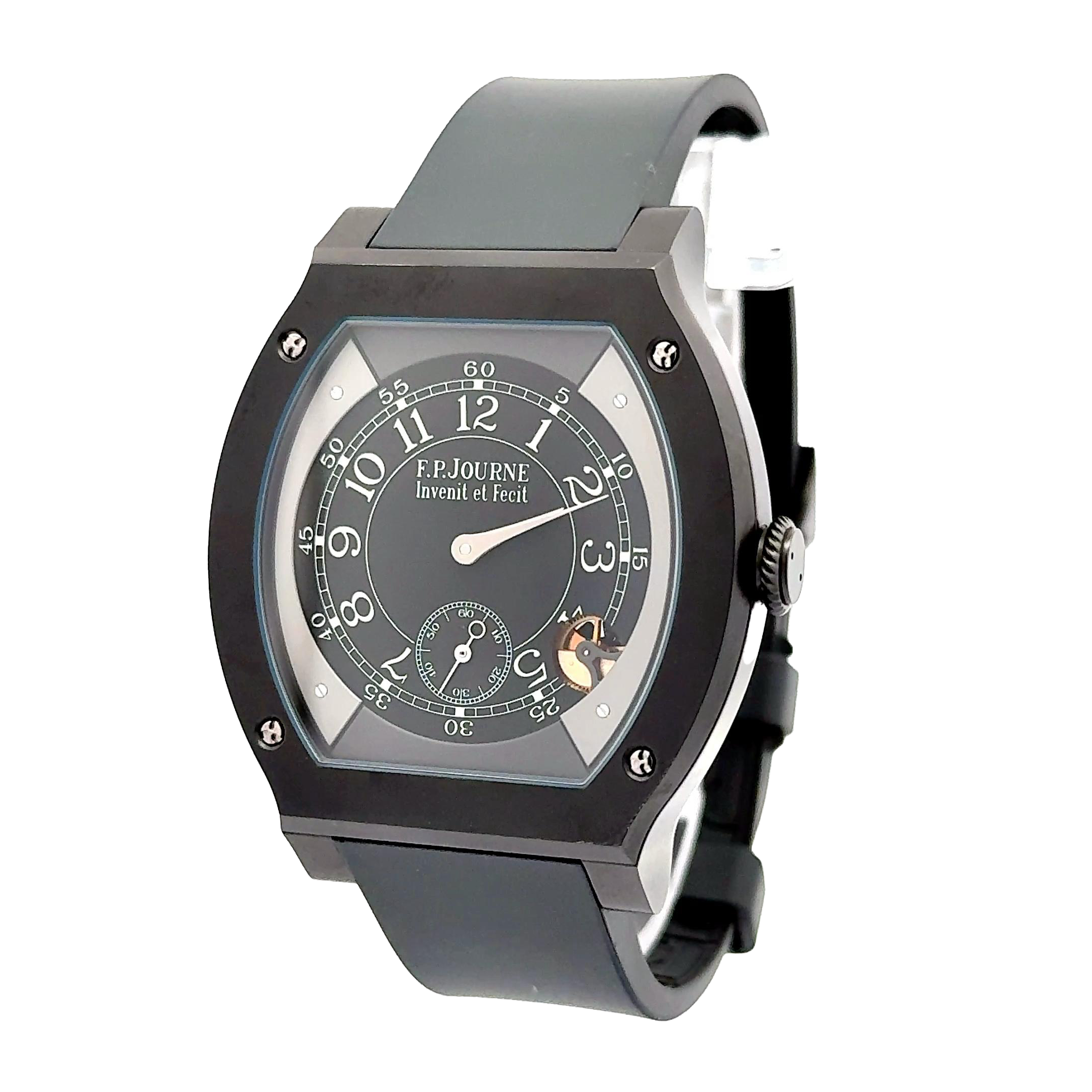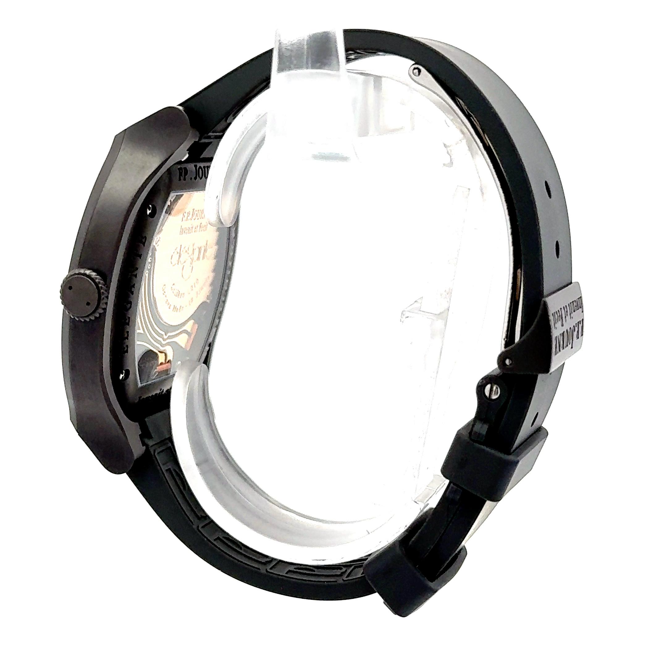 F.P. Journe Élégante 48mm, a modern marvel that combines cutting-edge horology with unmistakable elegance. Designed specifically for versatility and endurance, this timepiece features a titanium case with a matte black Titalyt coating, giving it a lightweight yet ultra-durable finish ideal for daily wear or sporting use. The unique tortue-shaped case measures 48mm, providing a bold wrist presence while maintaining ergonomic comfort. The dial showcases a sophisticated luminescent layout, with large Arabic numerals, a small seconds subdial at 6 o’clock, and a visible mechanical motion sensor at 4:30, the heartbeat of its hybrid electro-mechanical movement. Powered by calibre 1210.