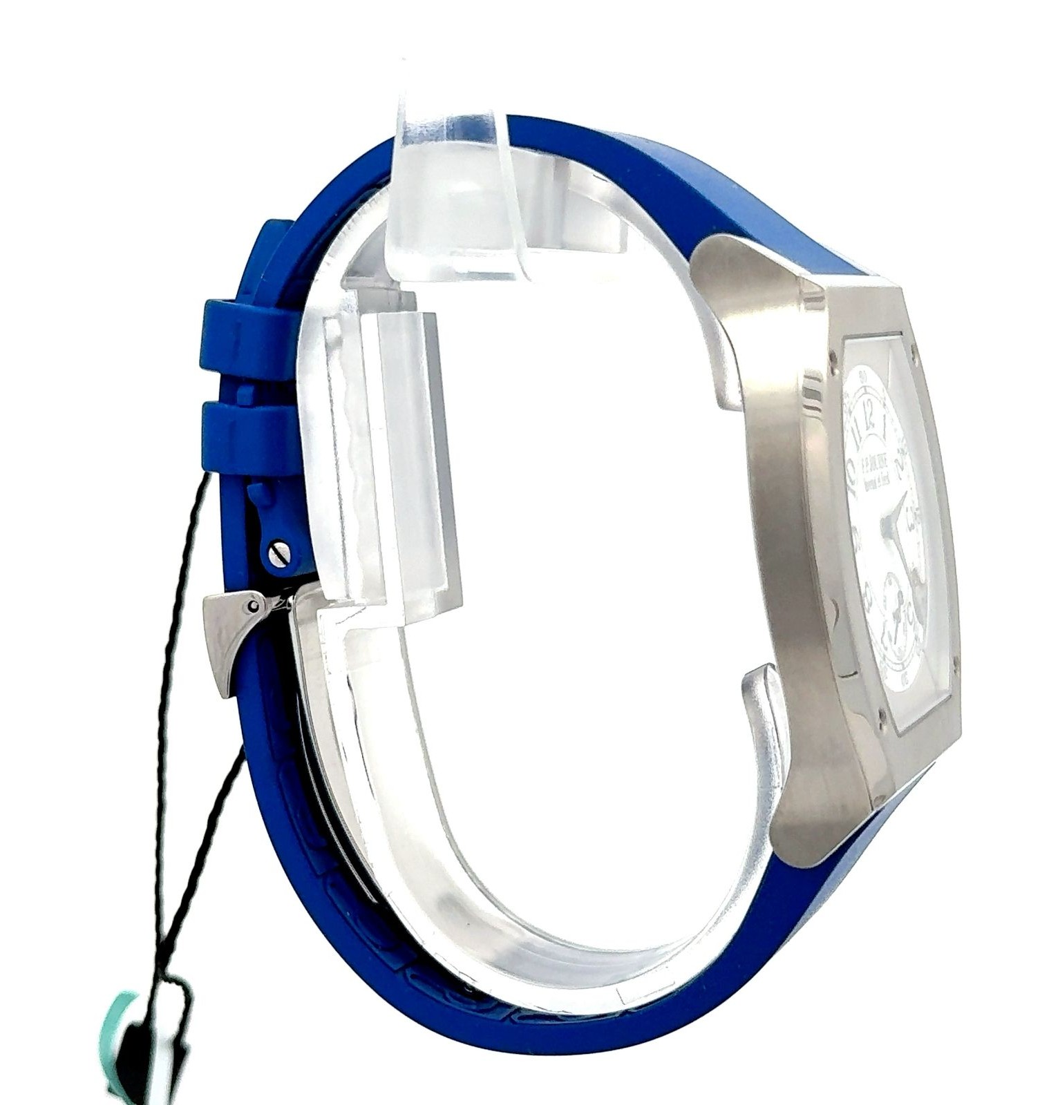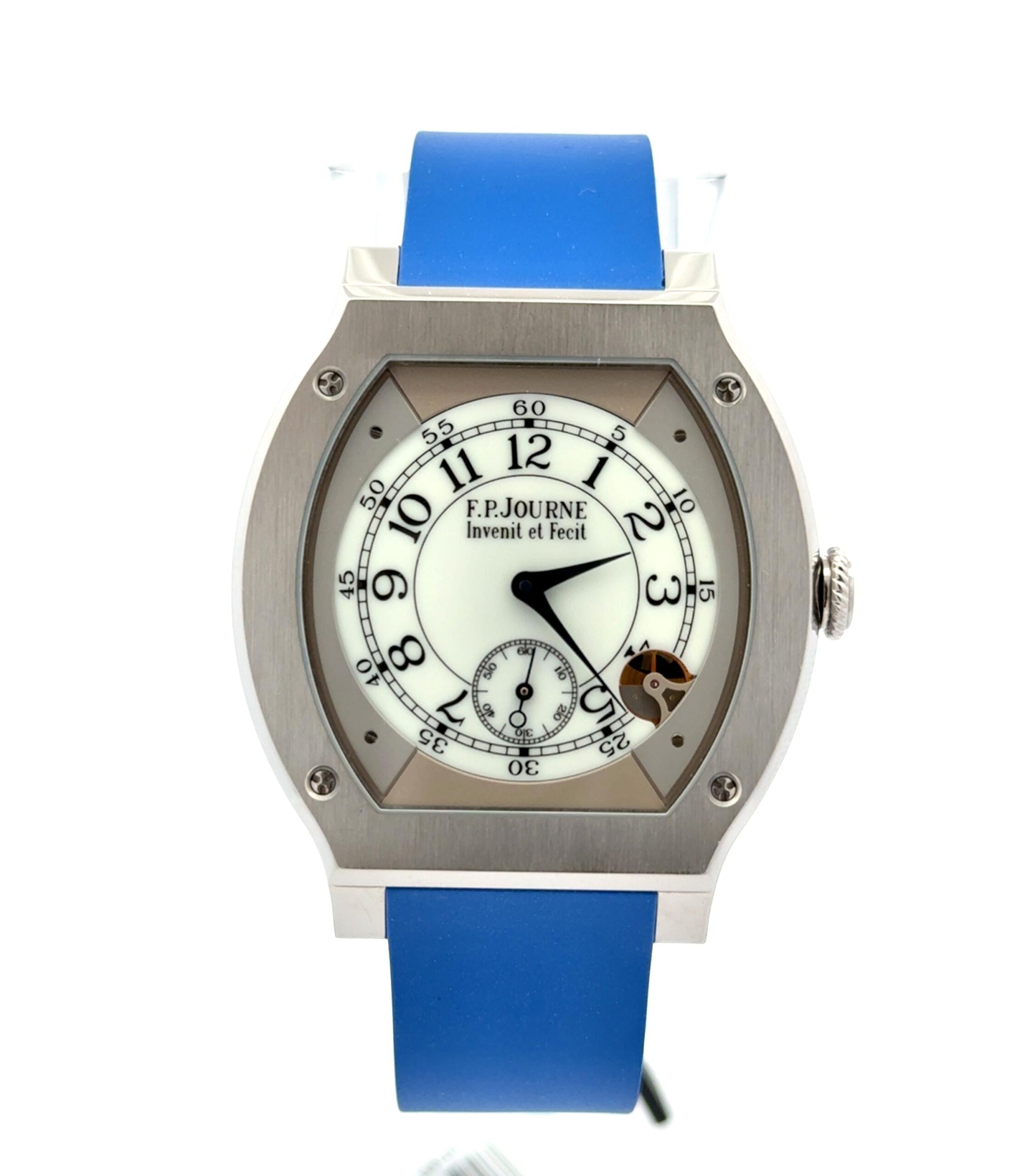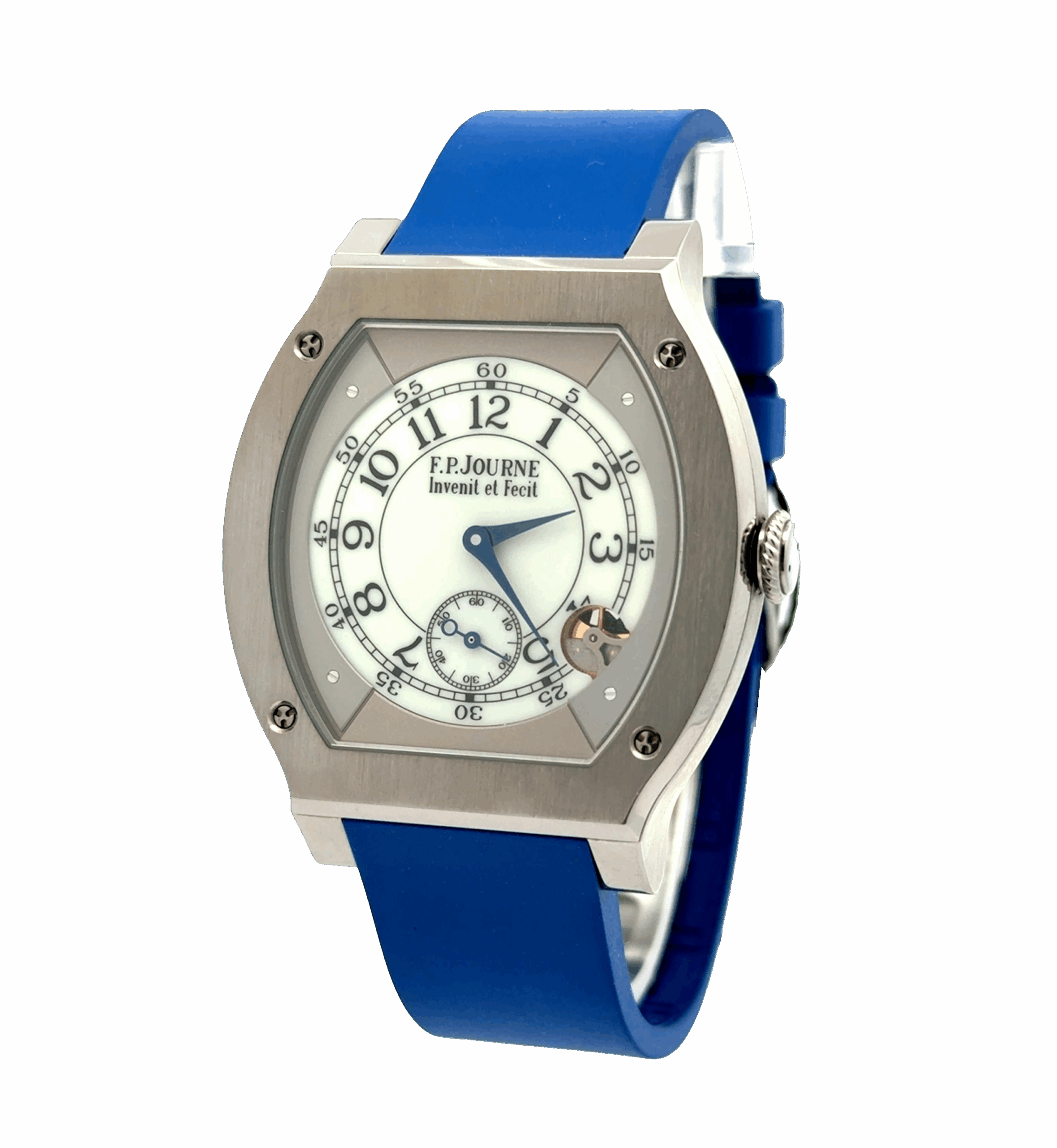 F.P. Journe Élégante, a refined and innovative timepiece that embodies the brand’s philosophy of blending tradition with modernity. The watch features a distinctive tonneau-shaped titanium case with a brushed finish, complemented by exposed screws that enhance its contemporary appeal. The clean white dial is adorned with Arabic numerals, elegant blued hands, and a small seconds subdial positioned at 6 o’clock. A discreet aperture near 4 o’clock reveals part of the motion detector system that allows the watch to enter standby mode when not in use, significantly preserving battery life.