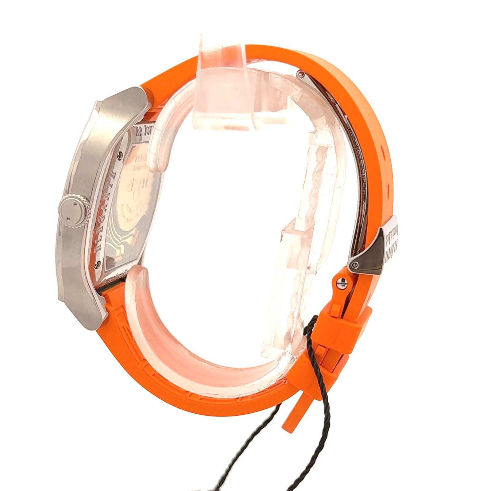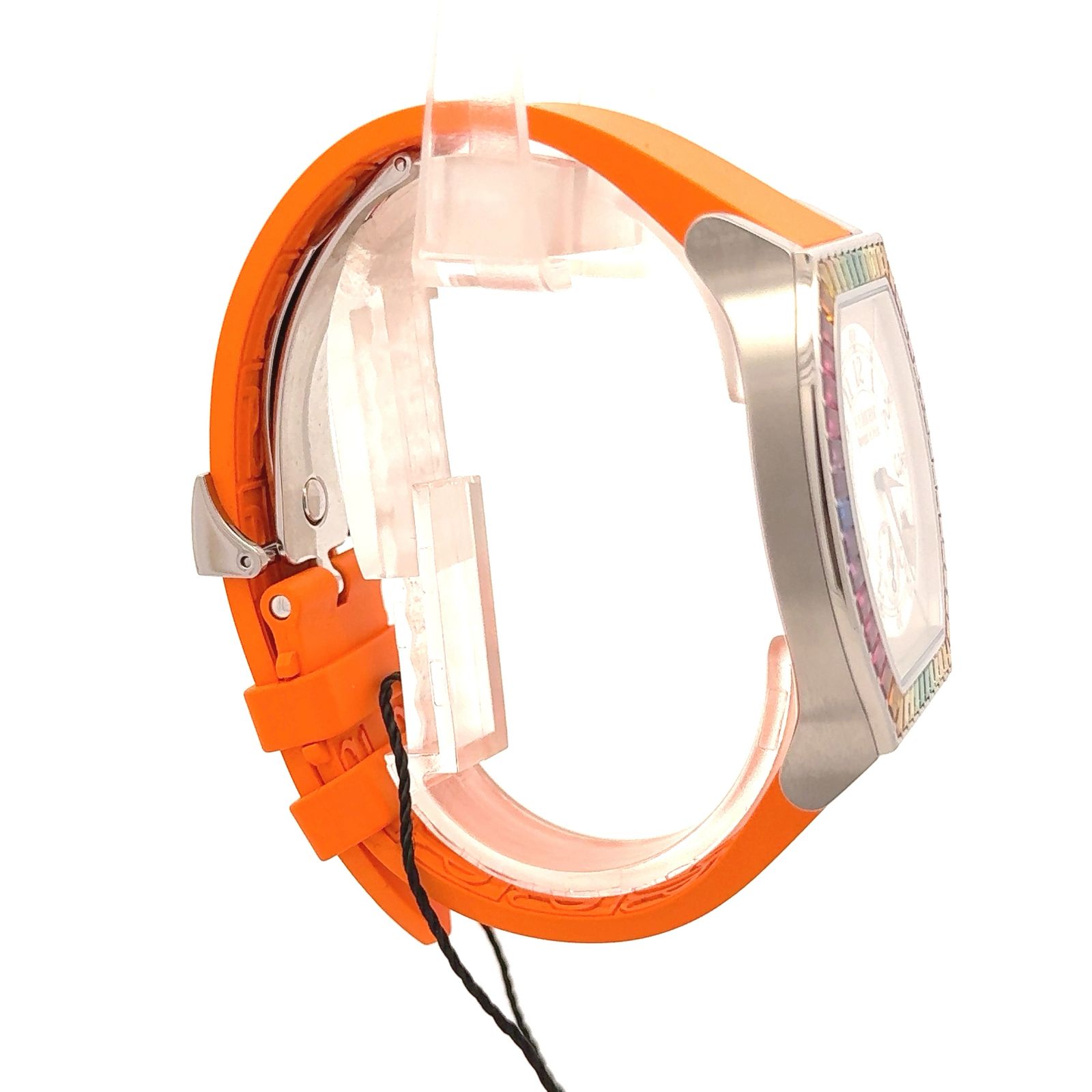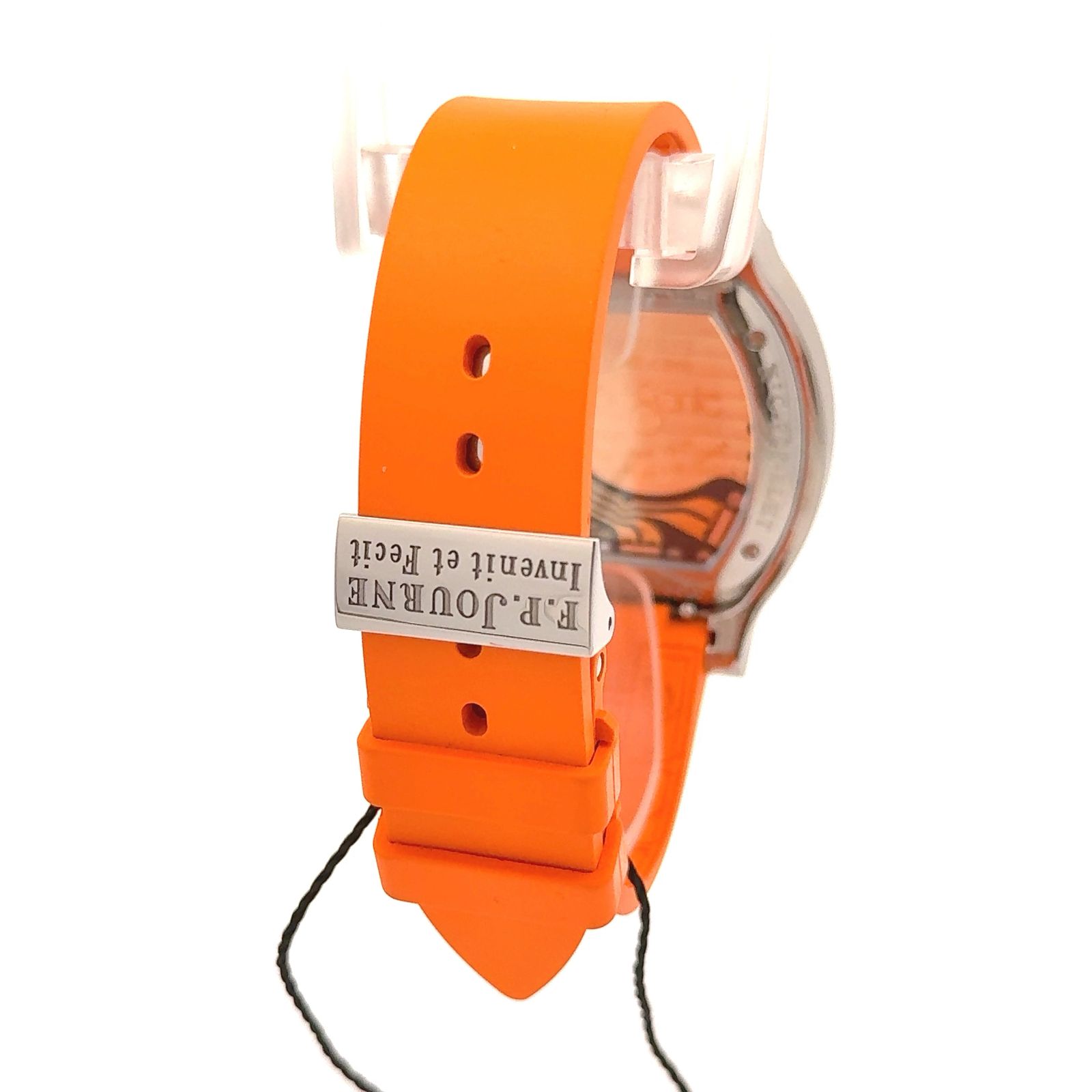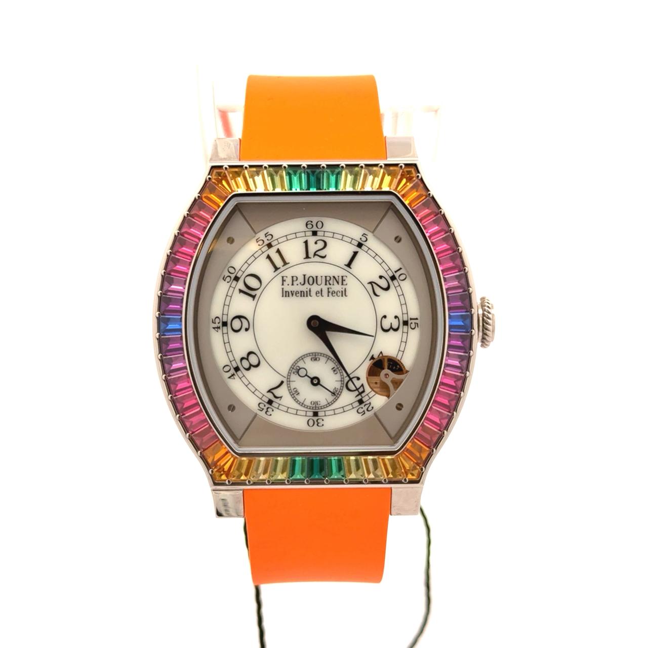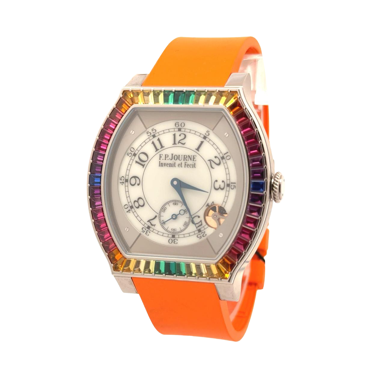 F.P. Journe Élégante “Gino’s Dream” is a radiant celebration of personal legacy and horological innovation, blending avant-garde aesthetics with a revolutionary quartz movement. Crafted in a 48 mm titanium flat tortue case, this special edition stands out with its rainbow bezel set with synthetic glass-ceramic gemstones, each meticulously arranged to form a vibrant gradient of color. The white dial features hand-applied Arabic numerals, a small seconds subdial at 6 o’clock, and powered by the Caliber 1210. The orange rubber strap adds a bold, contemporary flair, secured by a titanium buckle for comfort and durability. Named in tribute to François-Paul Journe’s late friend and business partner Gino Cukrowicz, the “Gino’s Dream” is more than a timepiece—it’s a heartfelt homage wrapped in dazzling craftsmanship.