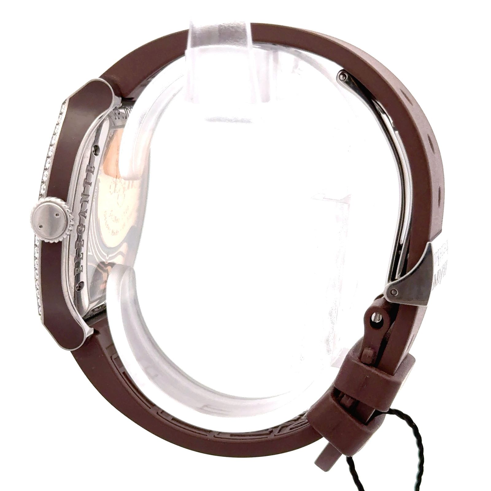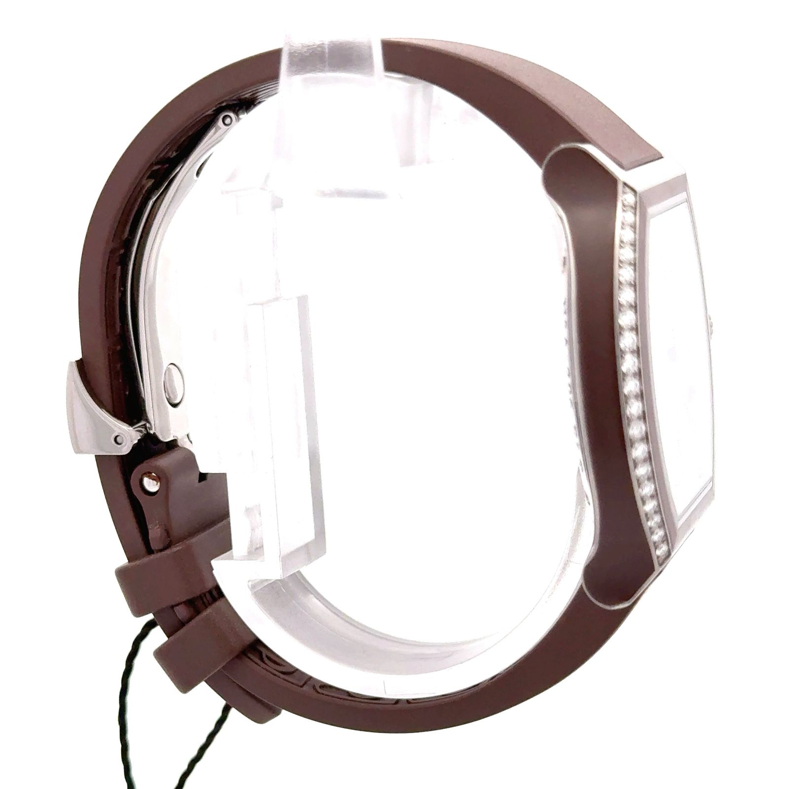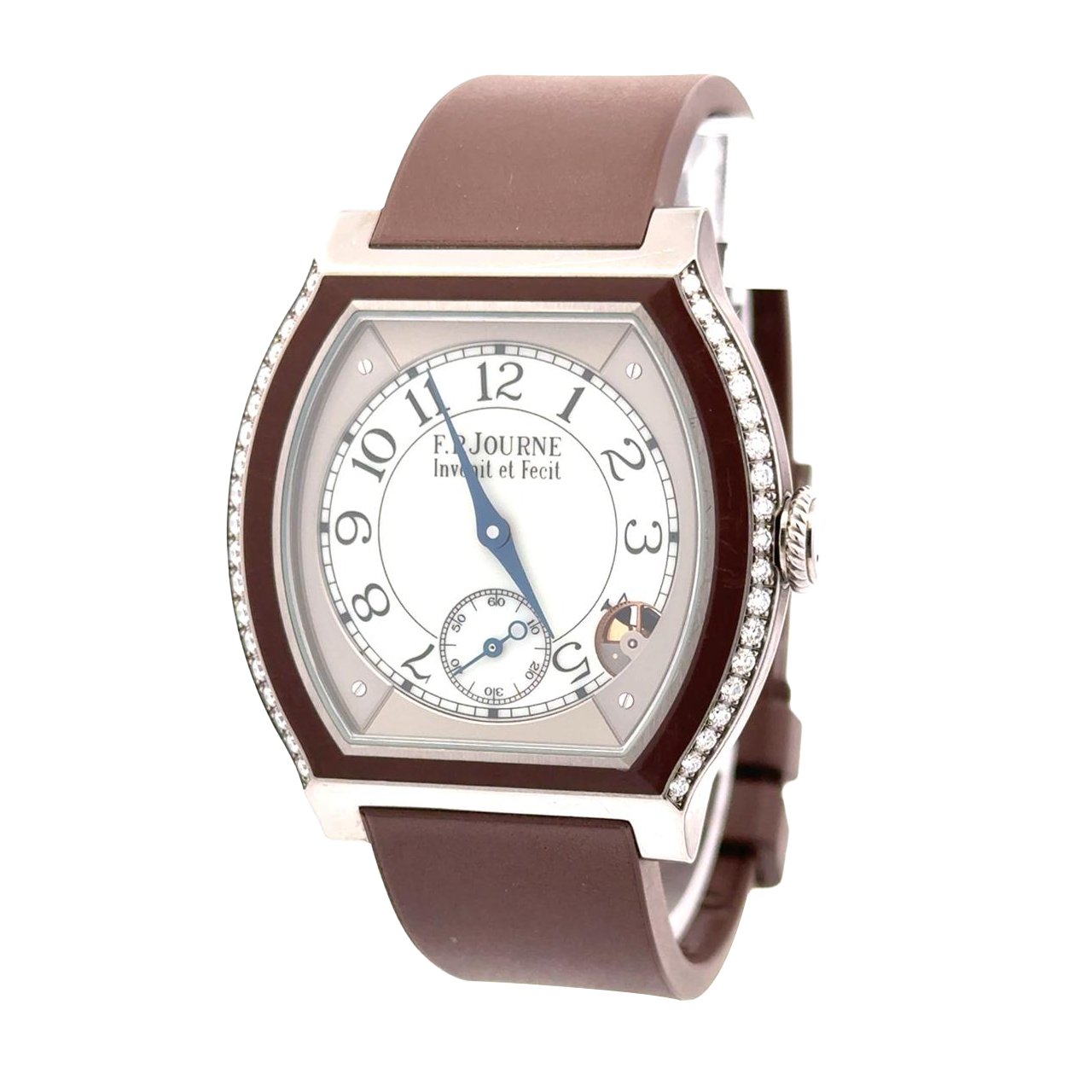F.P. Journe Élégante is a unique luxury watch that combines classical aesthetics with innovative electro-mechanical technology. It features a non-traditional, turtle-shaped titanium case with a diamond-set bezel and is fitted on a rubber strap. F.P. Journe Élégante is a unique luxury watch that combines classical aesthetics with innovative electro-mechanical technology. It features a non-traditional, turtle-shaped titanium case with a diamond-set bezel and is fitted on a rubber strap. The watch is powered by an F.P. Journe quartz Calibre 1210 movement, which incorporates an ingenious power-saving feature: a mechanical motion detector at 4:30 on the dial senses when the watch has been motionless for approximately 30 minutes.