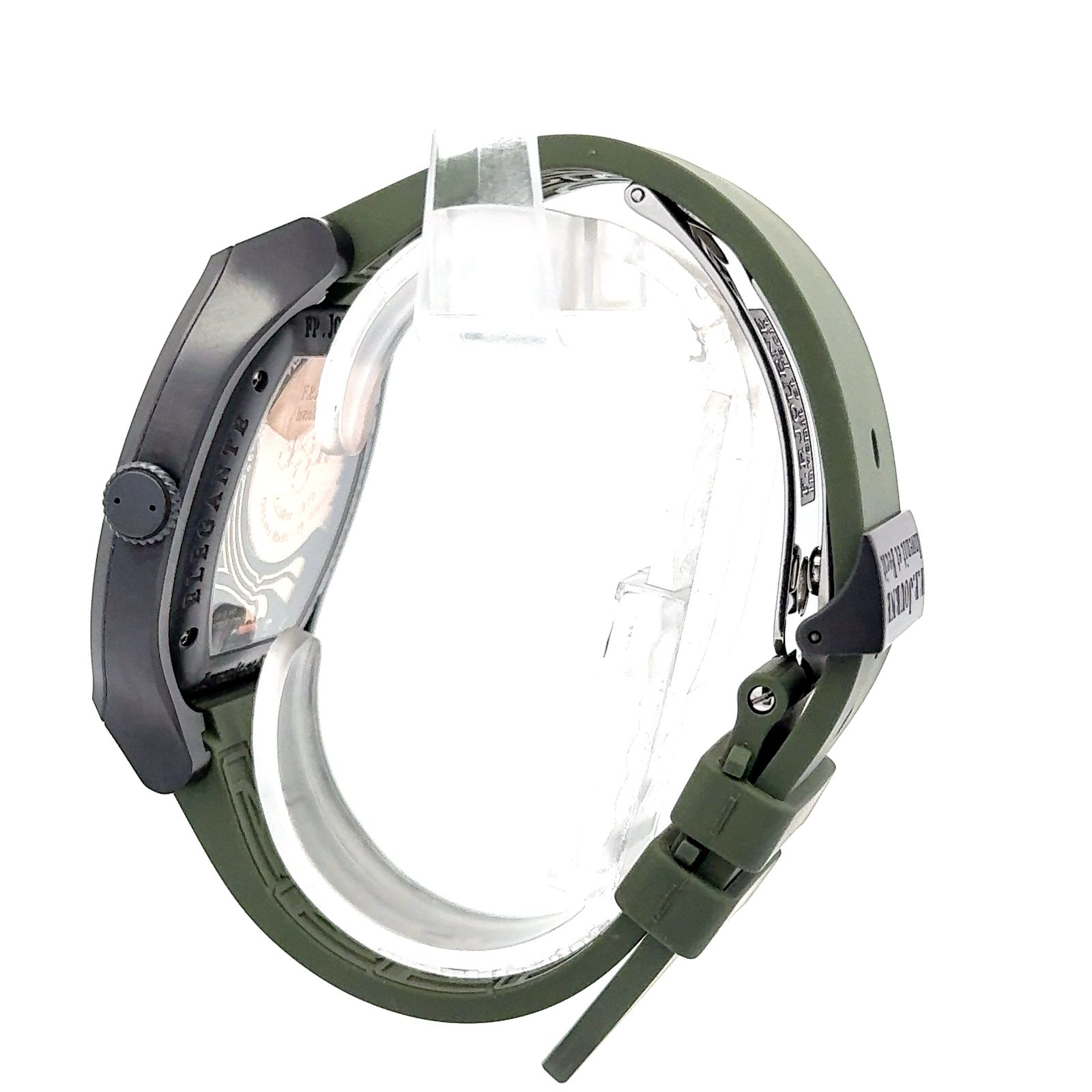 F.P. Journe Élégante is a distinctive luxury timepiece that masterfully blends contemporary design with technical innovation. This model features a unique tonneau-shaped titanium case with a matte dark finish, complemented by a soft green rubber strap for a modern, sporty appeal. Its white dial showcases bold black Arabic numerals and an offset small seconds subdial at 6 o’clock, while the signature aperture at 4:30 houses the motion detector, a hallmark of the Élégante collection, allowing the movement to enter standby mode when not in use, thus preserving battery life for years. Powered by F.P. Journe’s exclusive electromechanical quartz movement, the watch offers remarkable precision alongside exceptional energy efficiency. The screw details on the bezel, clean layout, and minimalist elegance reflect Journe’s philosophy of combining functionality with refined aesthetics, making it a versatile choice for both casual and sophisticated wear.
