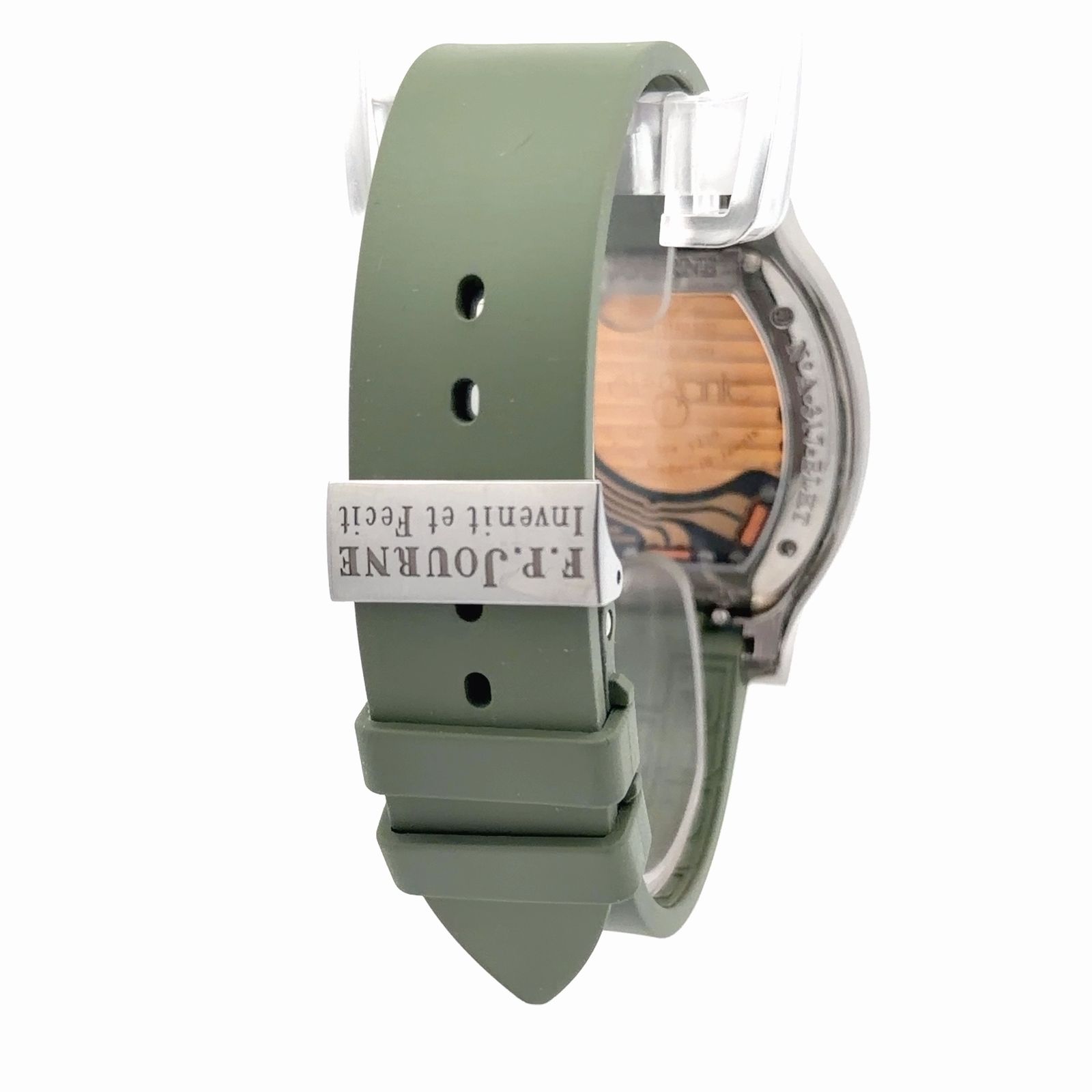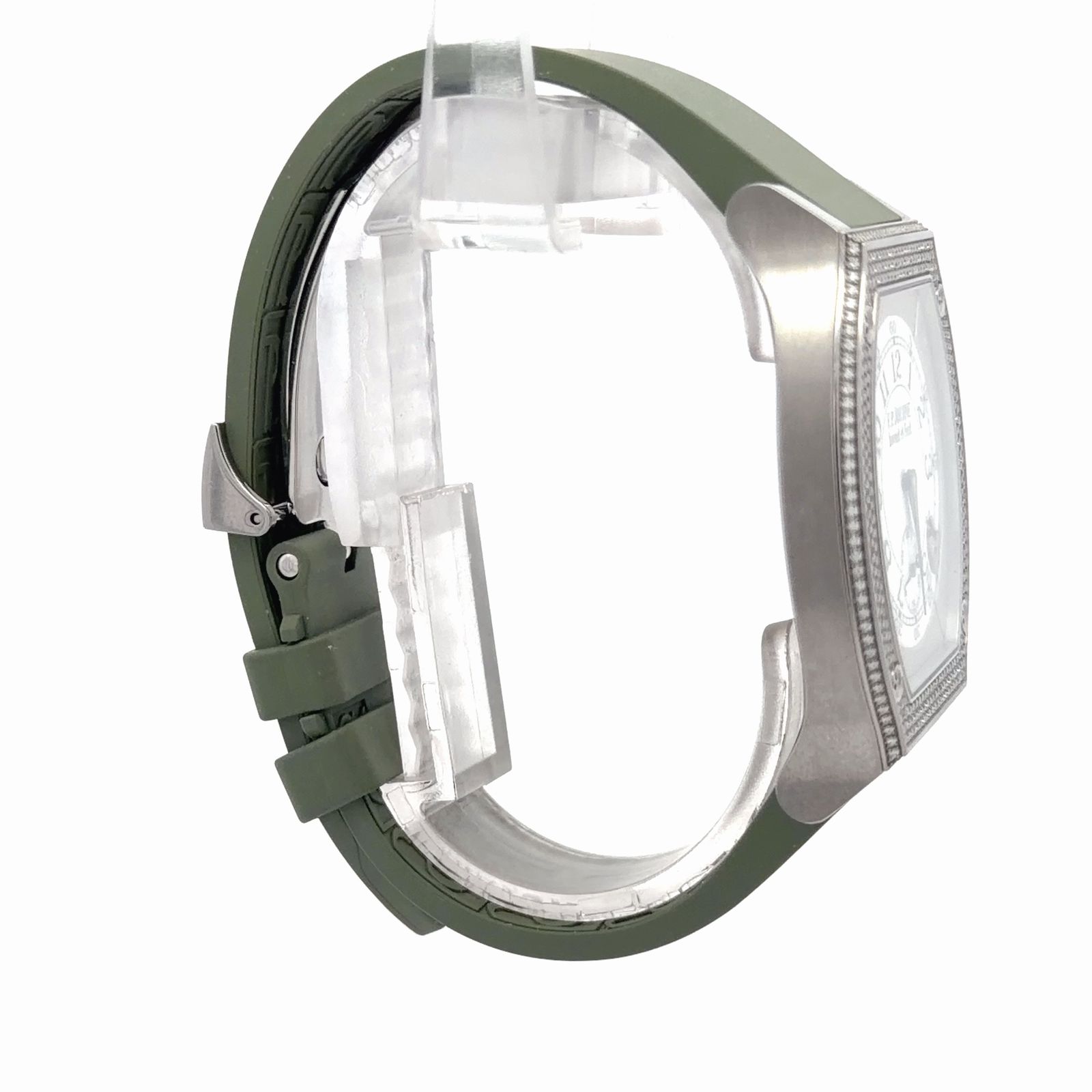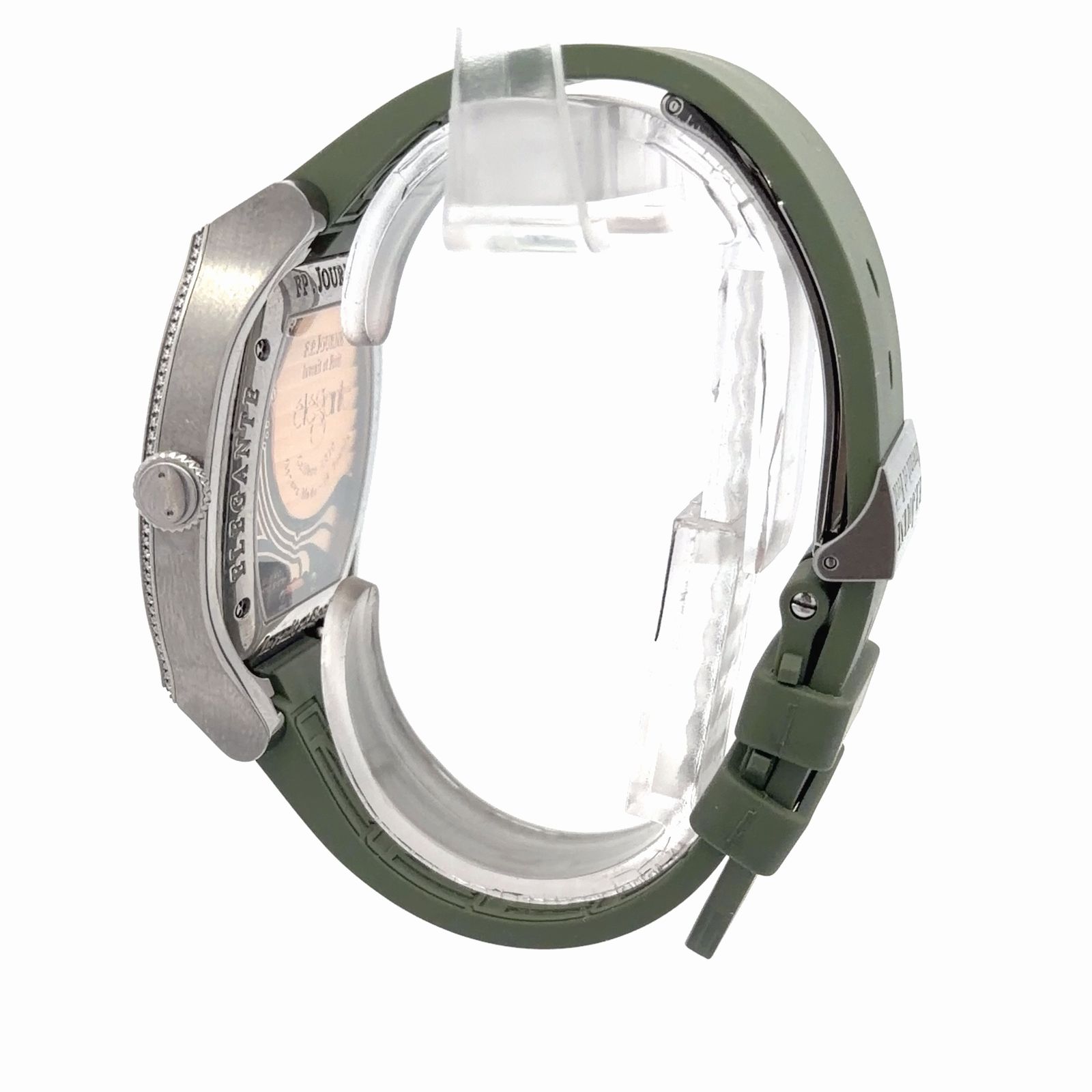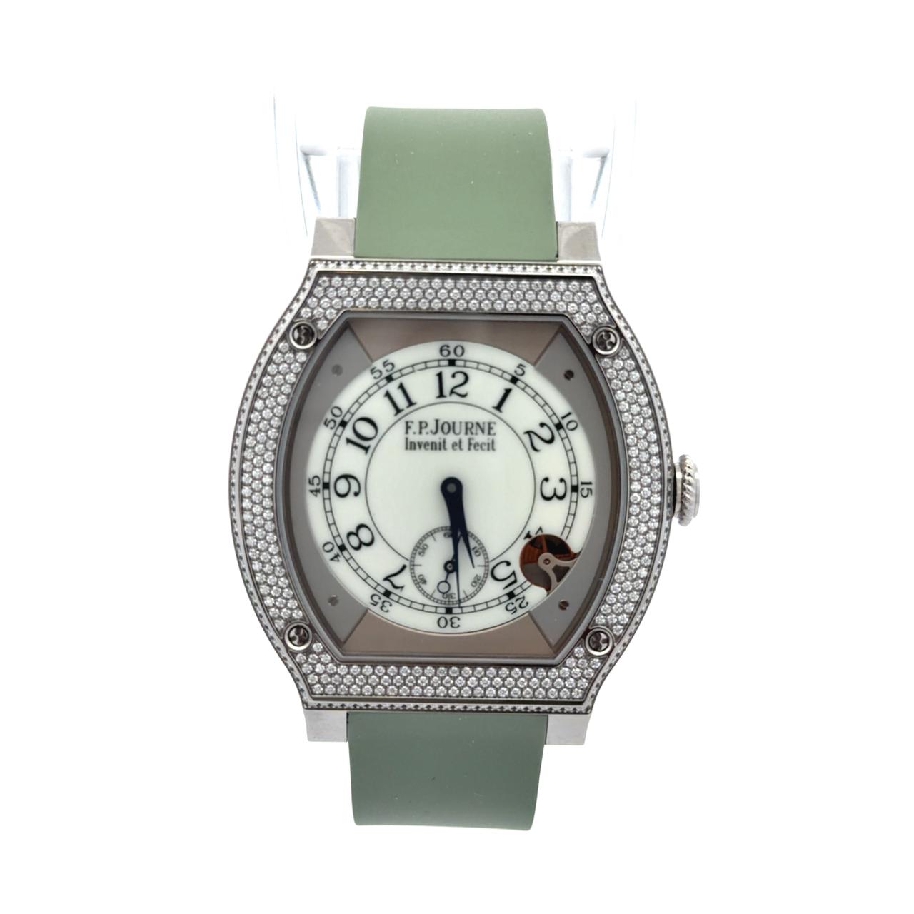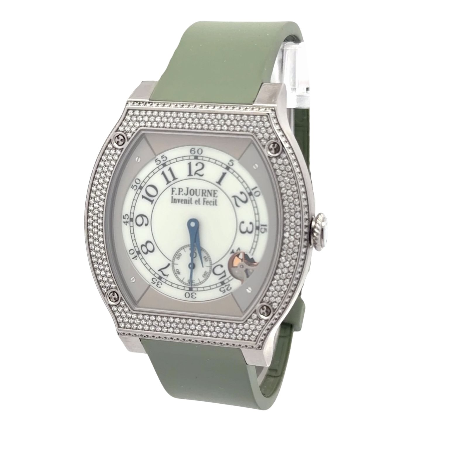 F.P. Journe Élégante 48 mm Titanium set with diamonds is a high-luxury electromechanical timepiece that blends traditional artistry with smart technology. Housed in a signature Flat Tortue shaped titanium case, this model features a bezel intricately set with diamonds and is paired with a durable green rubber strap. At its heart lies the innovative Calibre 1210 movement, which includes a visible motion detector at the 4:30 position. The watch also features a fully luminescent dial for high visibility in low-light conditions and is water-resistant up to 30 meters.