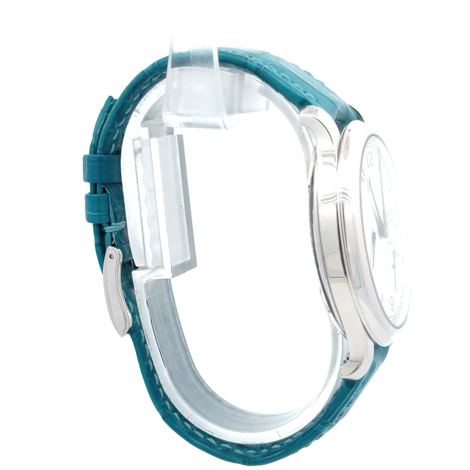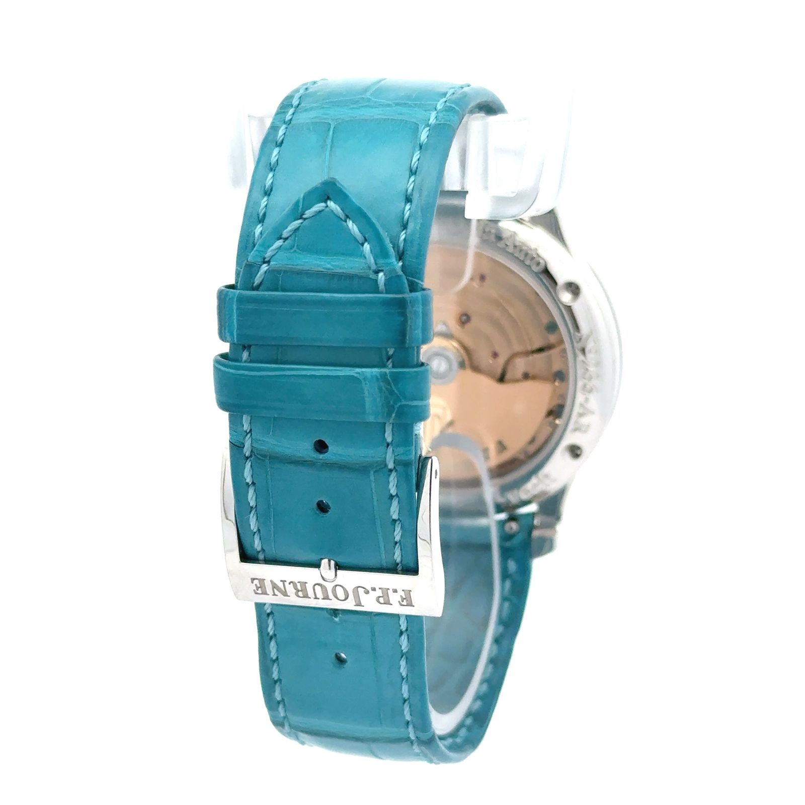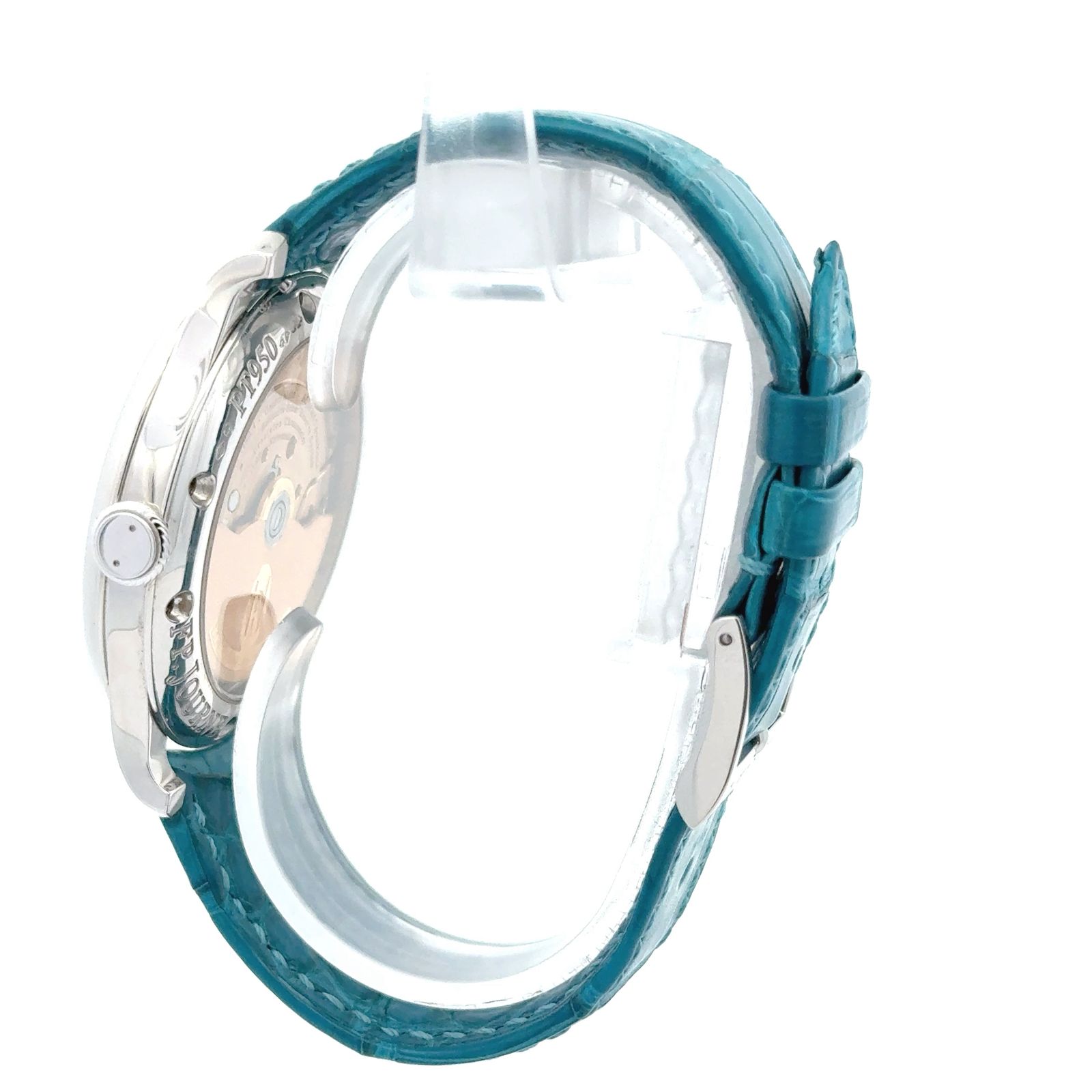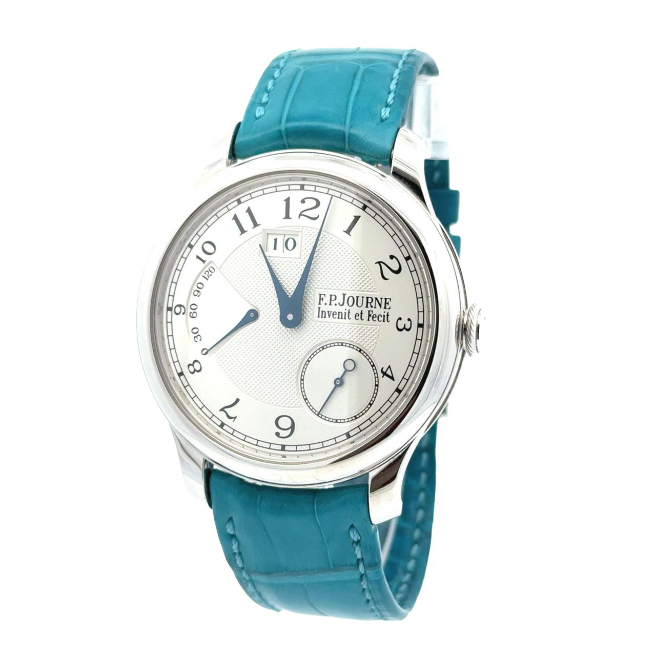 F.P. Journe Octa Réserve de Marche is a poetic expression of mechanical precision and aesthetic refinement, embodying the brand’s philosophy of elegance through innovation. Its silver dial is adorned with a delicate guilloché center, framed by finely printed Arabic numerals and blued steel hands that sweep gracefully across the surface. At 11 o’clock, a large digital date aperture offers crisp legibility, while the power reserve indicator arcs subtly across the left side, showcasing the watch’s impressive autonomy. A small seconds subdial at 4 o’clock adds visual balance and rhythmic charm. Crafted in a white gold polished case, the Octa Réserve de Marche is paired with a striking turquoise alligator strap, lending a contemporary flair to its classical silhouette.