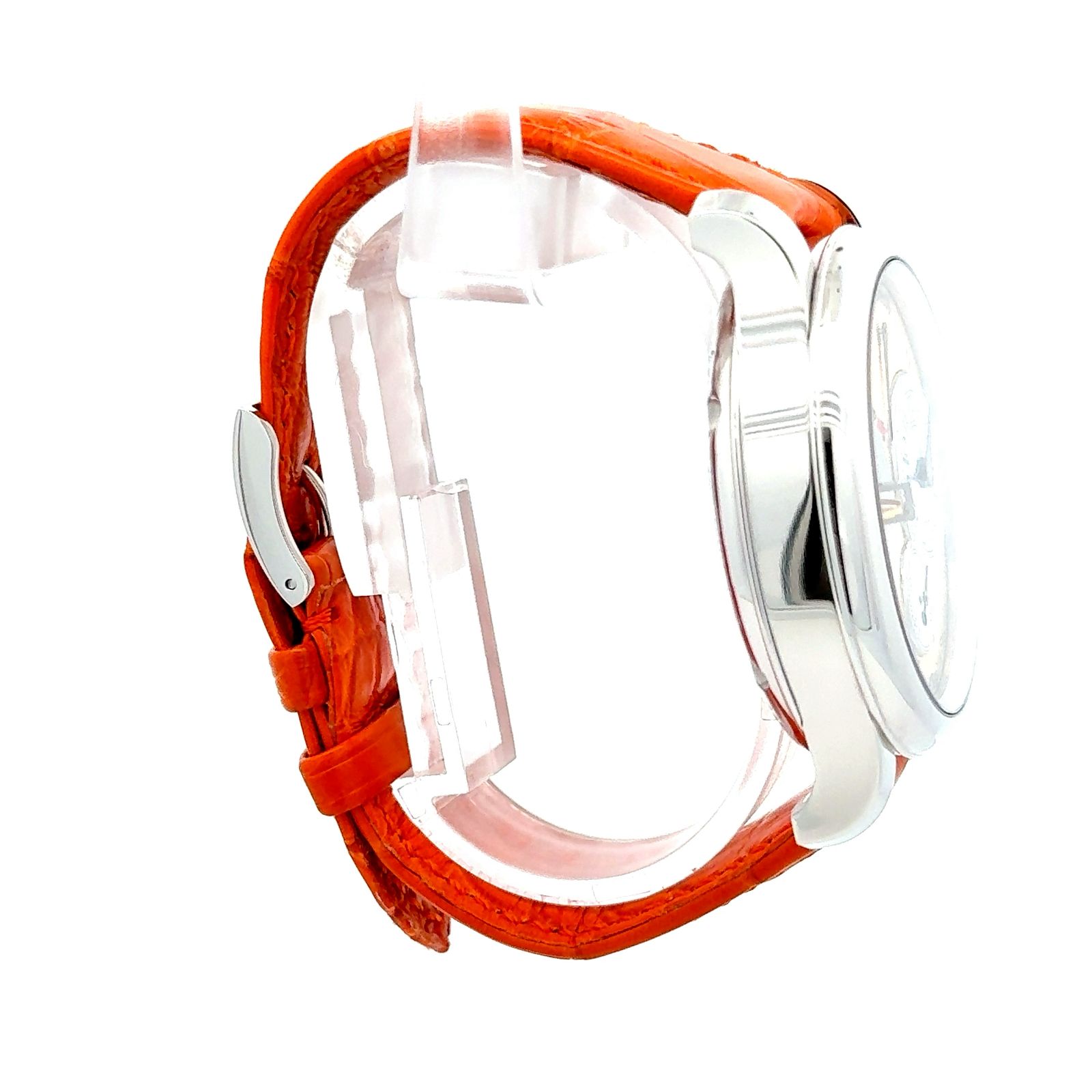The watch’s standout feature is its tourbillon, accompanied by a remontoire d’égalité—a constant-force mechanism that ensures consistent energy delivery to the escapement—along with a dead-beat seconds (seconde morte) complication, allowing the seconds hand to jump in one-second increments, an exceptional rarity in modern haute horlogerie. Additionally, a power reserve indicator adds both practicality and visual balance to the asymmetrically arranged dial. The dial itself is classic F.P.Journe: elegantly finished with Arabic numerals, a small seconds subdial, and the mesmerizing tourbillon aperture prominently displayed. The watch is paired with a luxurious orange crocodile leather strap, secured by a platinum buckle, adding a bold and stylish contrast to the timeless platinum case.